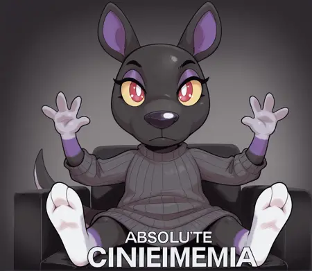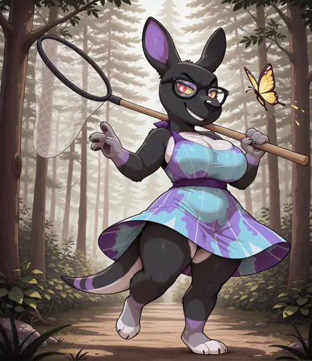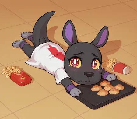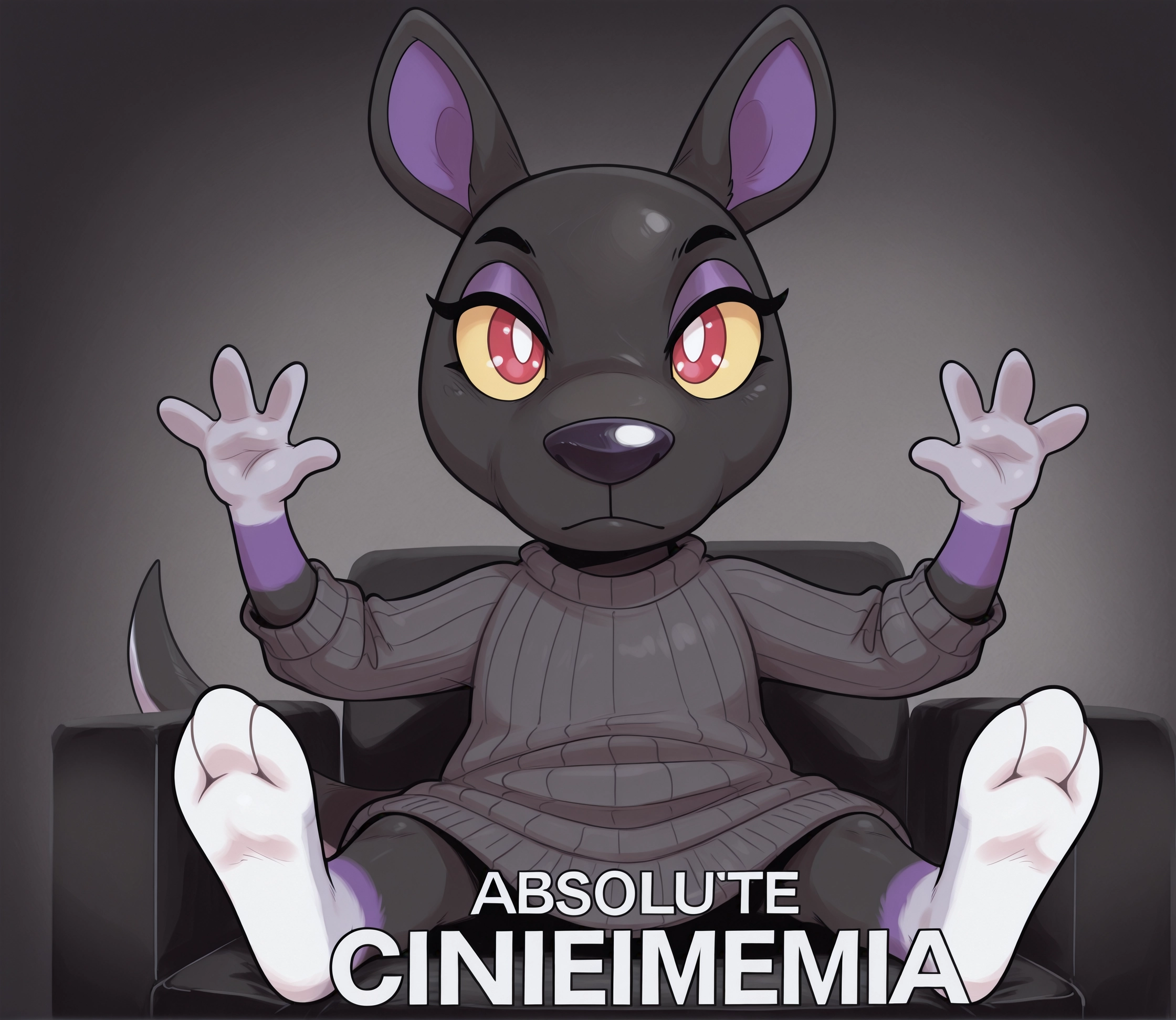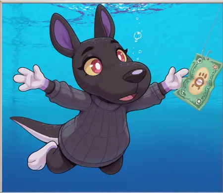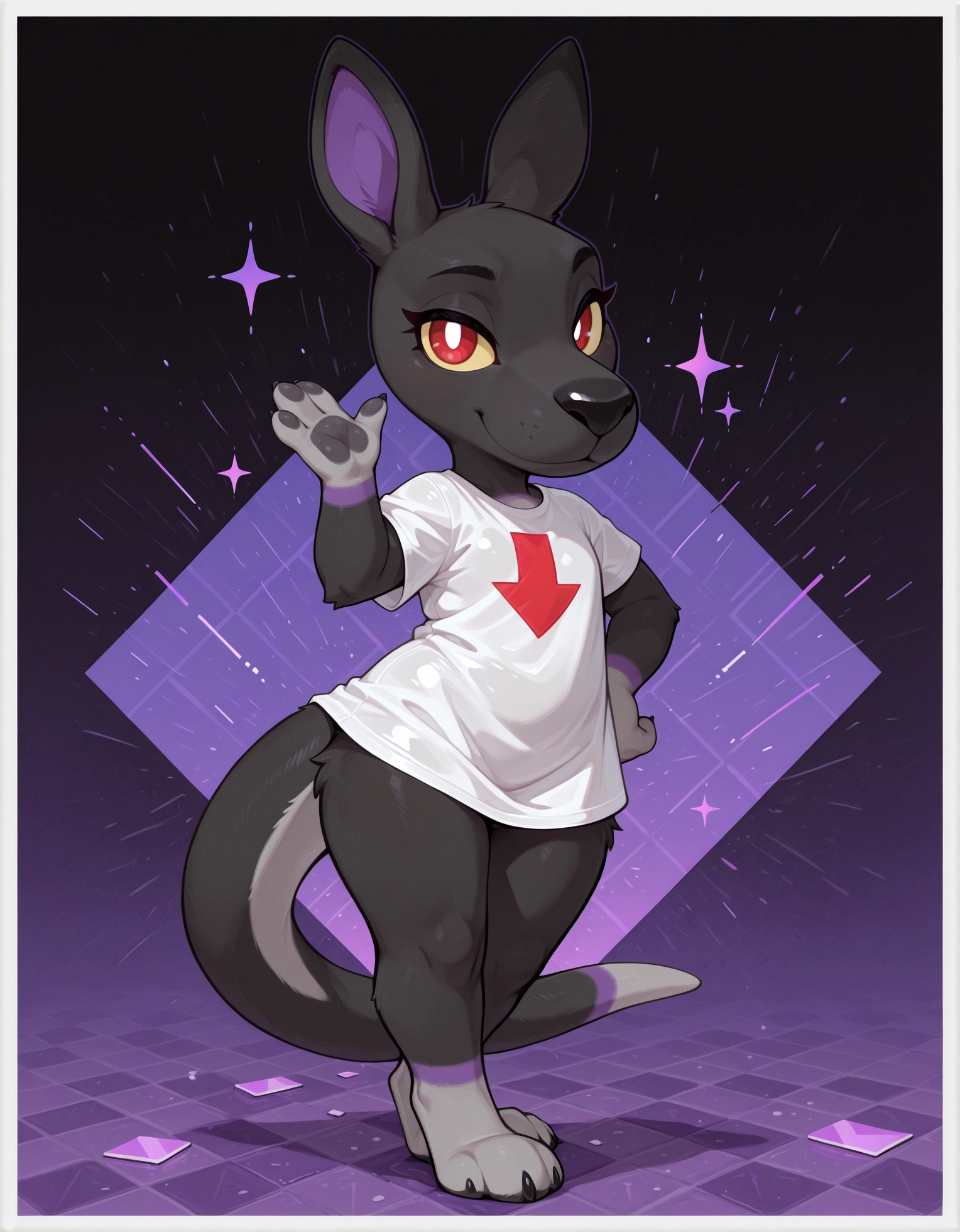Math1lda, 1girl, animal crossing, chibi, anthro female, furry female, anthro kangaroo, black fur, yellow sclera, red eyes, white pupils, white belly, animal nose, black nose, animal ears, kangaroo ears, purple inner ear, (purple wrist pattern, purple ankle pattern,:1.2), gray paws, white feet, long tail,