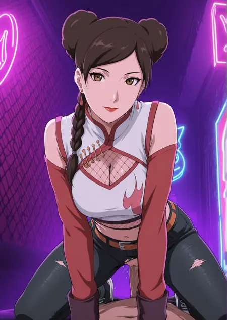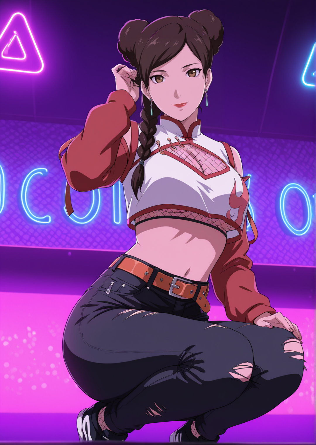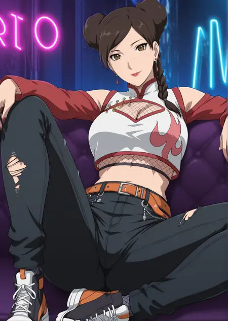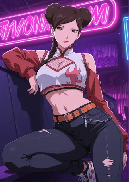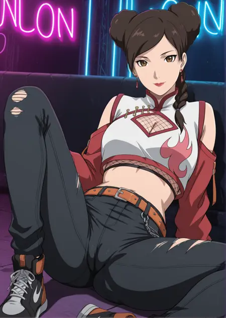 braided hair, red lips, jewelry, earrings, black jeans, orange belt, sneakers, crop top, torn clothes, fishnets, belt, white top, red sleeves, fishnet top, midriff, cleavage