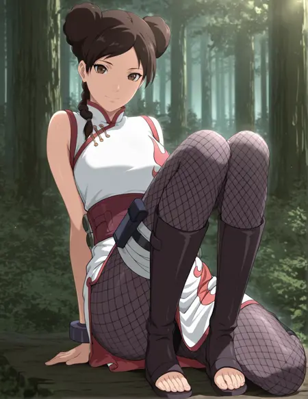 twin braids, fishnets, chinese clothes, toes, toeless footwear, boots, sandals, pantyhose