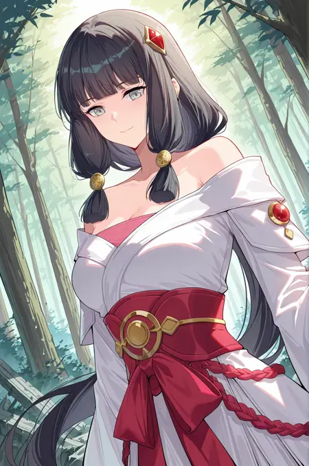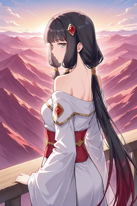 Yunluo、1人 Girl、単独、灰色の目、マuve色の髪、非常に長い髪、まっすぐな前髪、低いポニーテール、長い側髪、厚い側髪、結ばれた側髪、側髪の装飾、金色の髪飾り、赤い髪飾り、