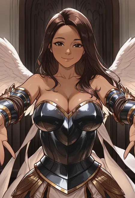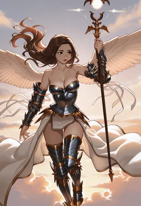 One of the four angel sisters from the Innistrad MTG blocks. This captures her outfit pretty well, but fails to consistently reproduce her staff. I think the model is confused by the avacyn symbol at the end.