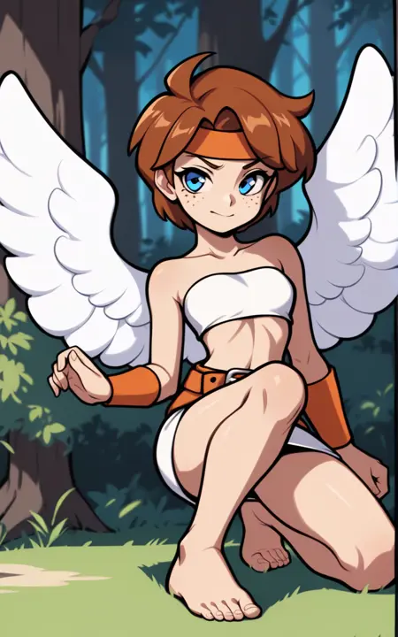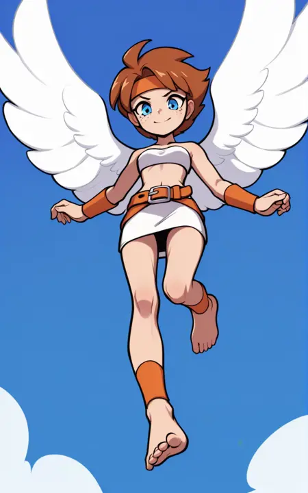 Reinforcement Tags: barefoot, wings, white wings, angel wings, feathered wings, angel, freckles, brown hair, short hair, blue eyesFor her Outfit:** skirt, miniskirt, white skirt, orange belt, belt, midriff, bandeau, white bandeau, wristband, bracer, headband, orange headband