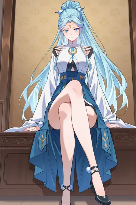 Shuang, 1girl, solo, blue eyes, light blue hair, very long hair, parted bangs, long sidelocks, high ponytail, tied back hair, half updo, blue hairpin, white hair pompom, forehead jewel,
