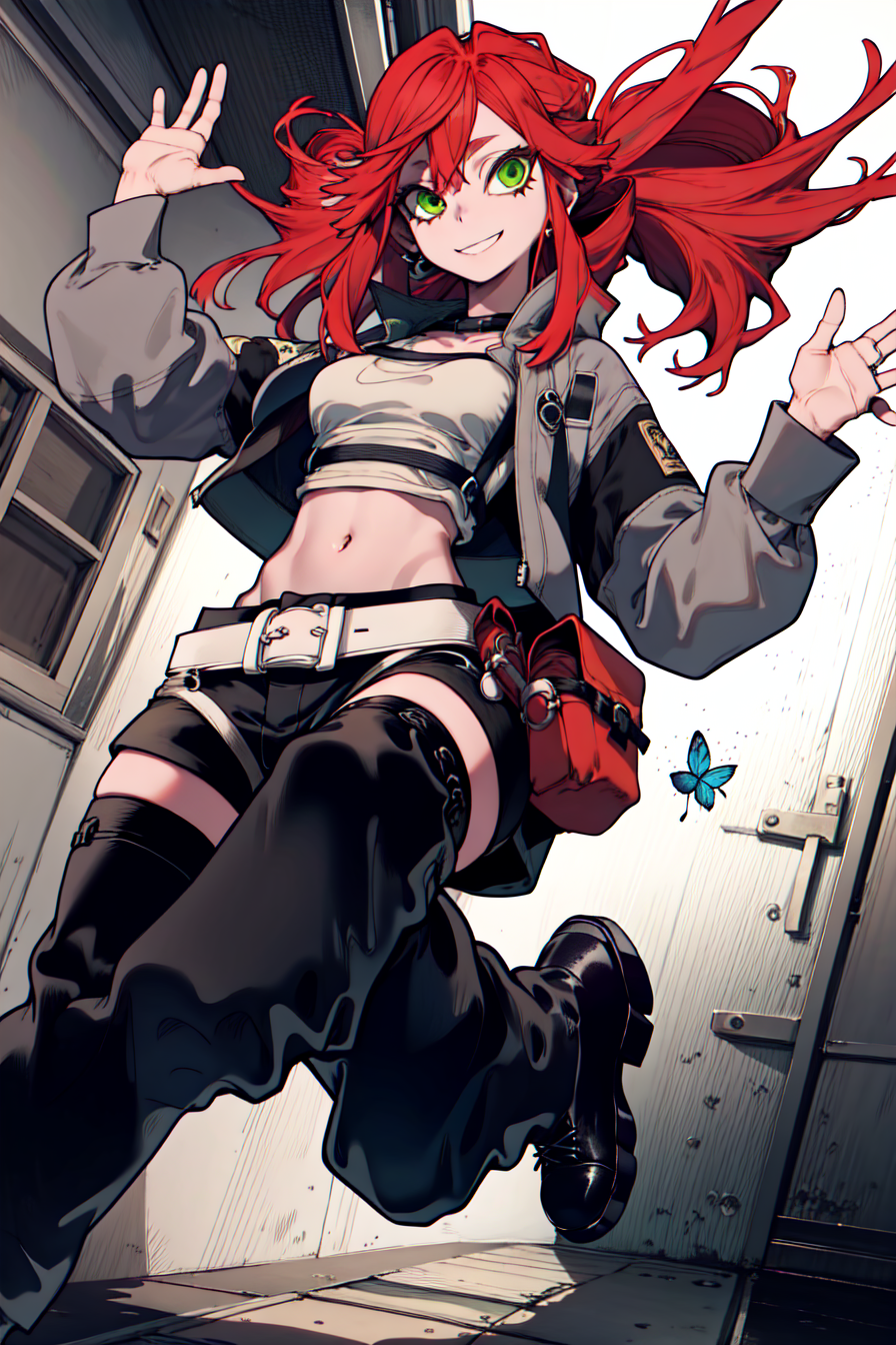 thighhighs, long sleeves, navel, medium breasts, jacket, boots, open clothes, shorts, midriff, belt, black footwear, crop top, short shorts, black shorts, pouch, grey jacket, white belt,