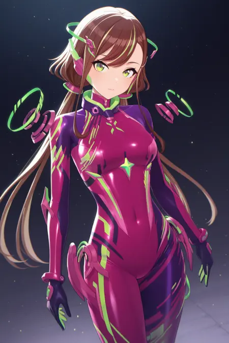 myu1amana, myu1hair, 棕色头发, 低双马尾, 多色头发, 扫刘海, 长侧发, 悬浮头饰, [粉/绿色头饰], [紫/绿色] 眼睛