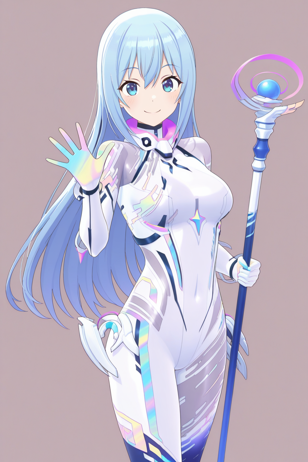 white bodysuit, white_neck_armor, pink gemstone, white_floating_object_above_shoulder, see-through shoulder, pink_armlets, white multicolored_gloves, covered navel,white_hip_armor, white_asymmetrical_legwear, white_footwear,pink_skates, leg_wings,footwear_wings