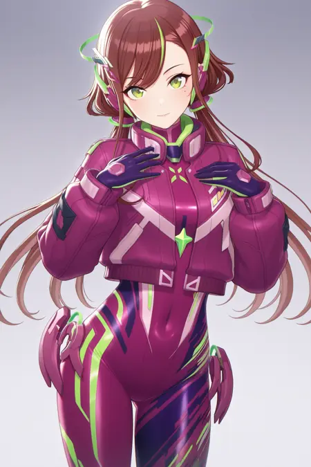 bmyu2, 短款夹克, 紫色夹克, 长袖, 内穿紧身衣, 紫色紧身衣, 紫色领口, 绿色宝石, 黑色双色手套, 腹部覆盖, 紫色髋甲, 紫色不对称腿部装备, 深蓝色鞋履, 绿色滑冰鞋