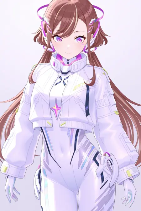白色紧身衣, 白色颈甲, 粉色宝石, 肩部上方悬浮物, 透明肩部, 粉色臂环, 白色多色手套, 腹部覆盖, 白色髋甲, 白色不对称腿部装备, 白色鞋履, 粉色滑冰鞋, 腿部翅膀, 鞋履翅膀