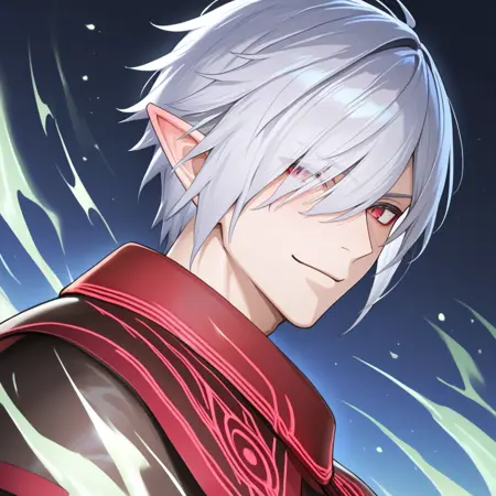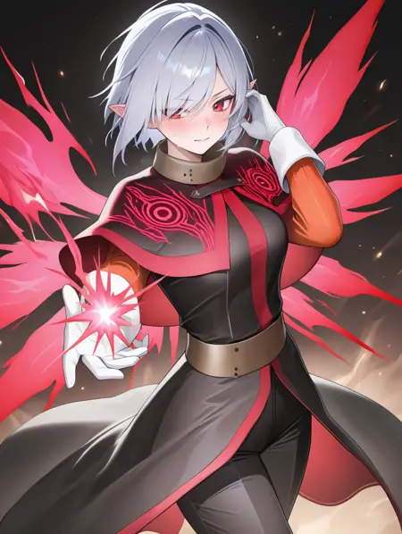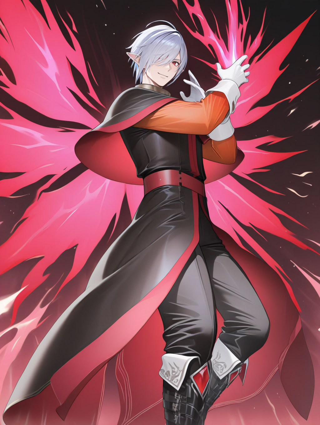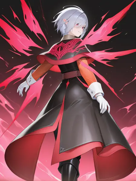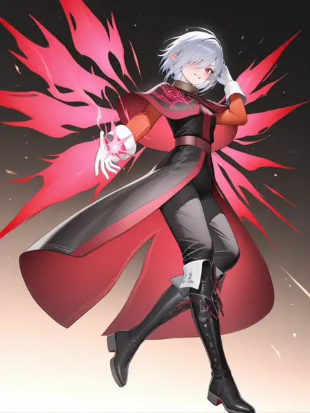 prompt example :rusiferu,silver hair,pointy ears,red eyes,capelet,orange long sleeves,white gloves,coat,pants,boots,red energy wings,