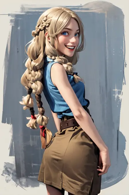 Her braids are somewhat tricky as she has multiple of different sizes. The actual hairstyle she uses is quad braids but it's hard to get right, weight the prompt to help. The easier prompt to sue is twin braids.