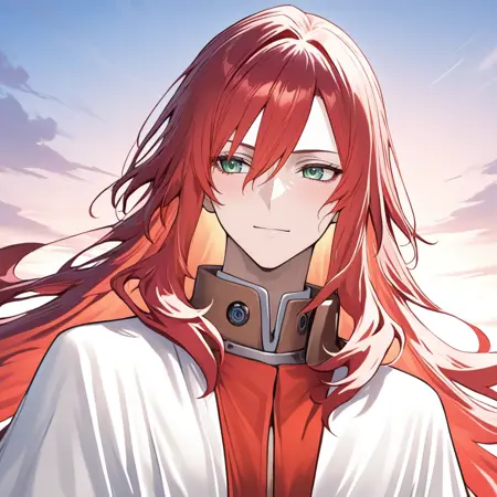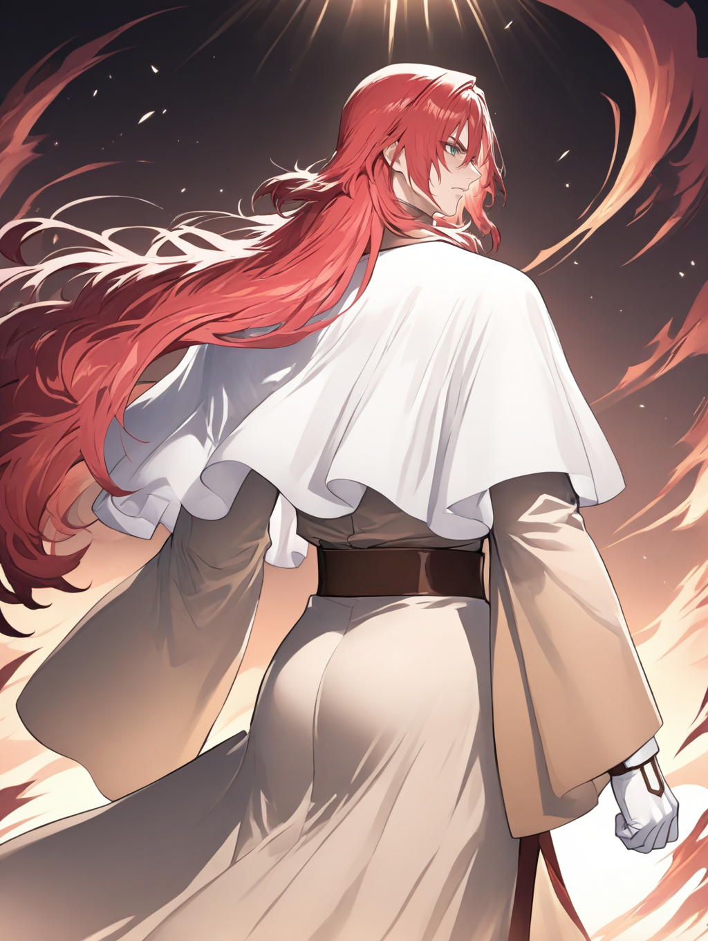 프롬프트 예시: gaburieru, 빨간 머리, 녹색 눈, 흰색 카펠렛, 로브, 흰 장갑, 갈색 넓은 소매, 진지한, 남성적인,