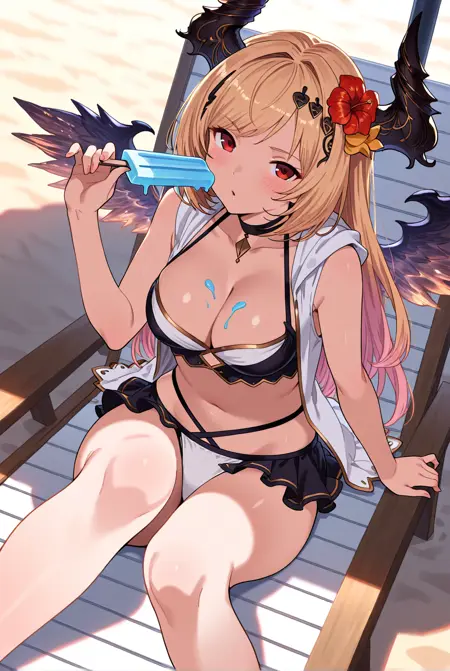 头发花朵,项圈,吊带装,金边,黑色泳装,比基尼裙,无袖,(带帽兜)外套,(凉鞋);
