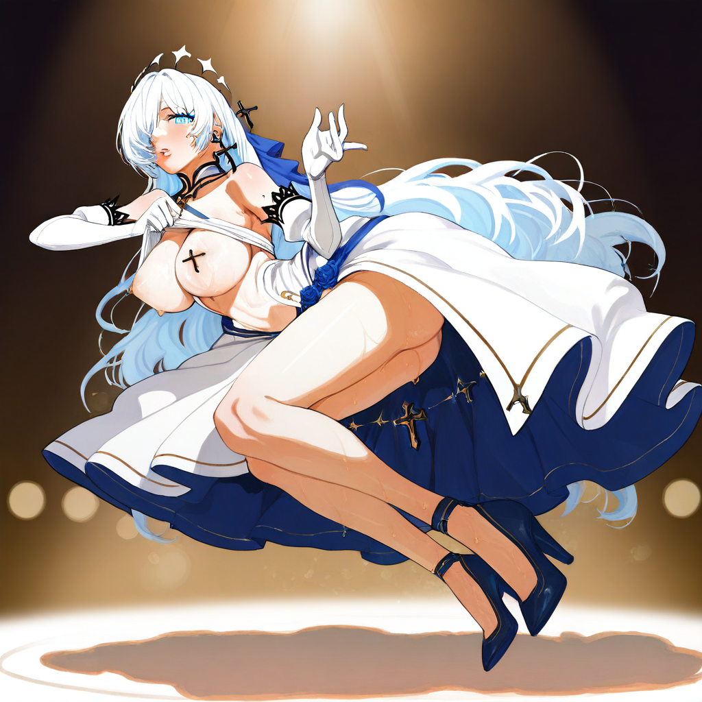 (Azur_Brennus, long hair, white hair, hair over one eye, blue eyes, hair ornament, jewelry, earrings, dress, elbow gloves, cross, high heels),