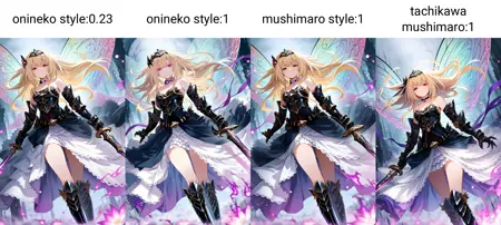 NoobAI-XL Epsilon-pred 0.5-Version을 기반으로 학습합니다. 학습 자원에는 Shadowverse, Rage of Bahamut, Granblue Fantasy의 공식 아트, 주인공의 척추 애니메이션 및 일부 팬아트가 포함됩니다.