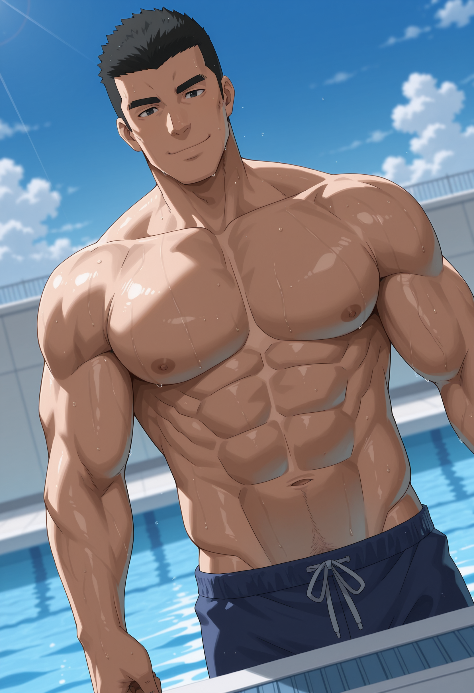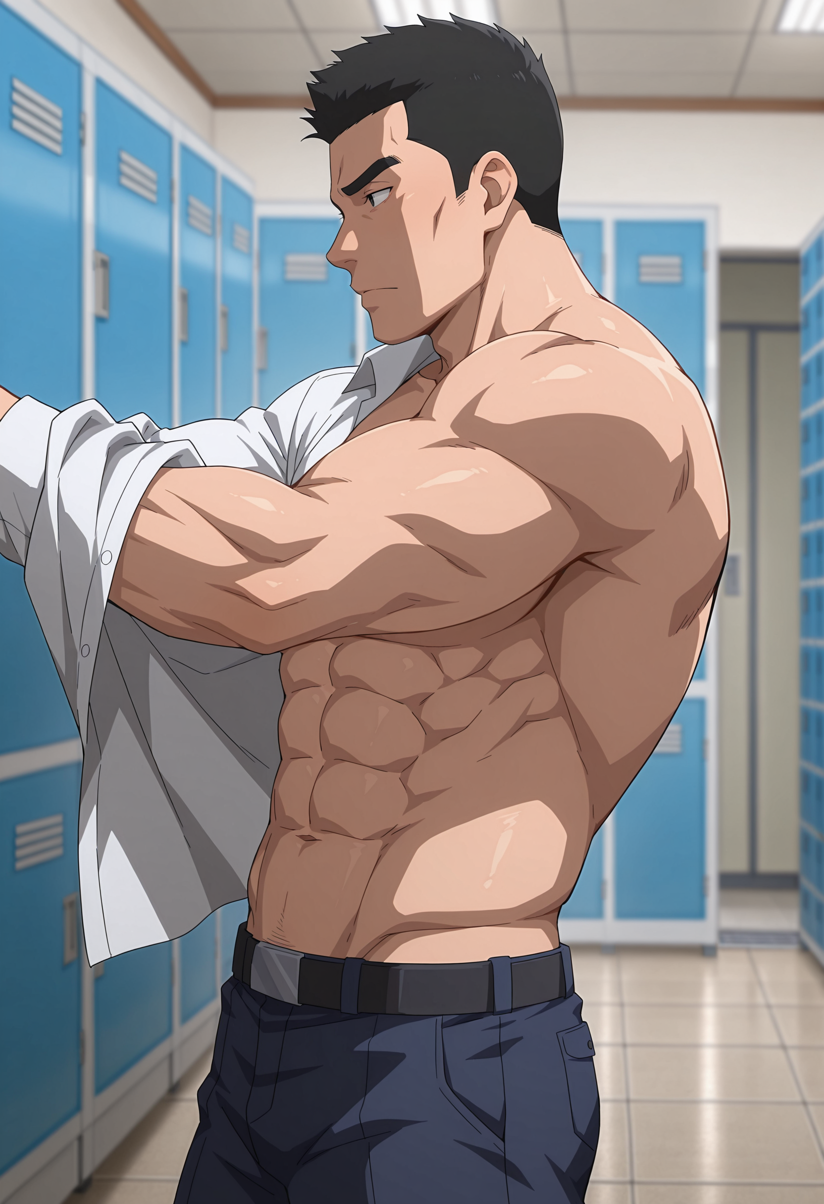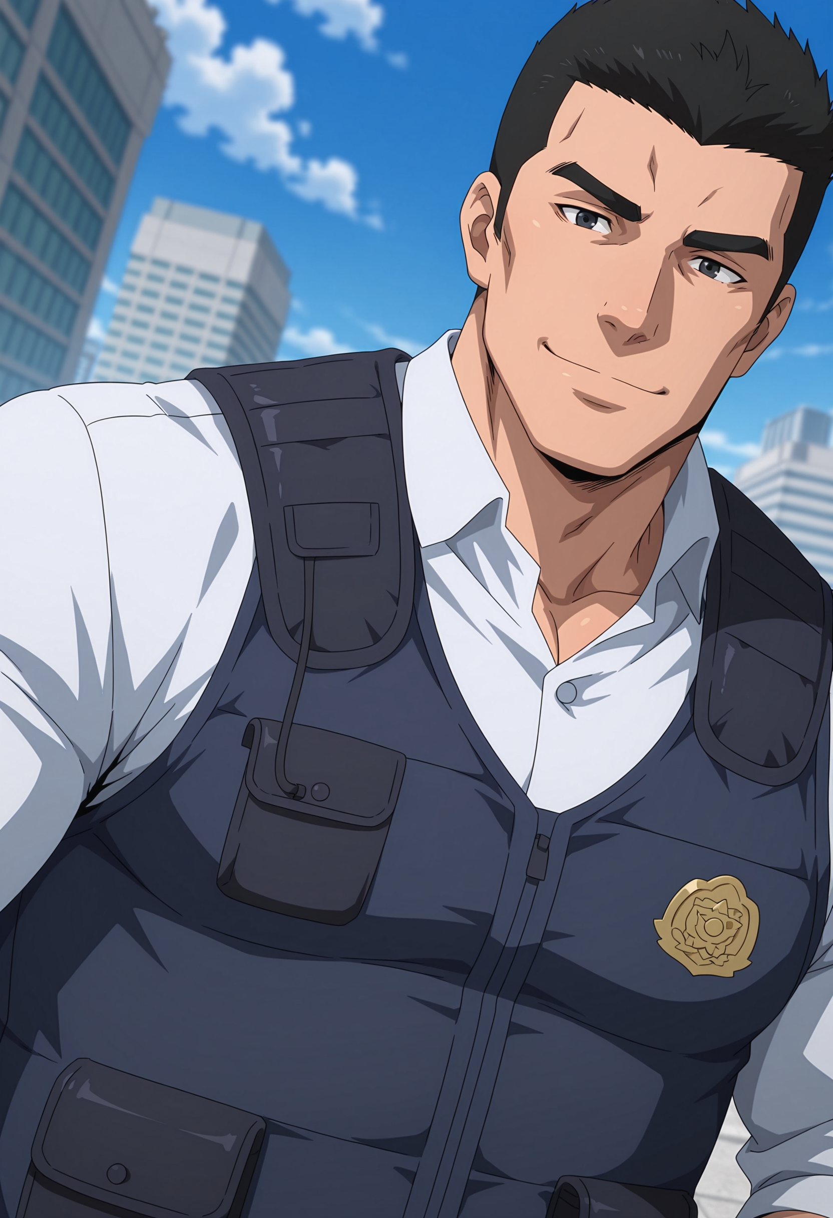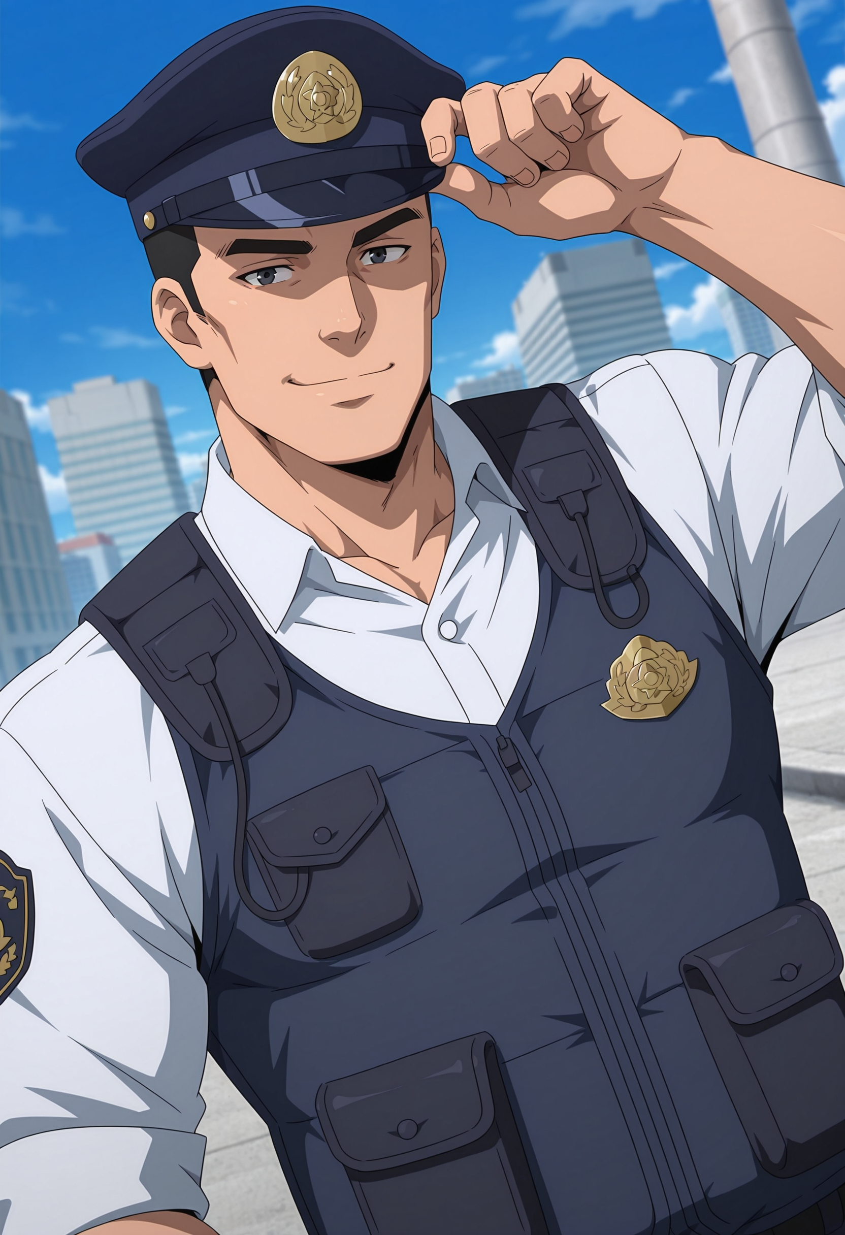 short black hair, crew cut hair, police uniform, police hat, dark blue police vest, white shirt
