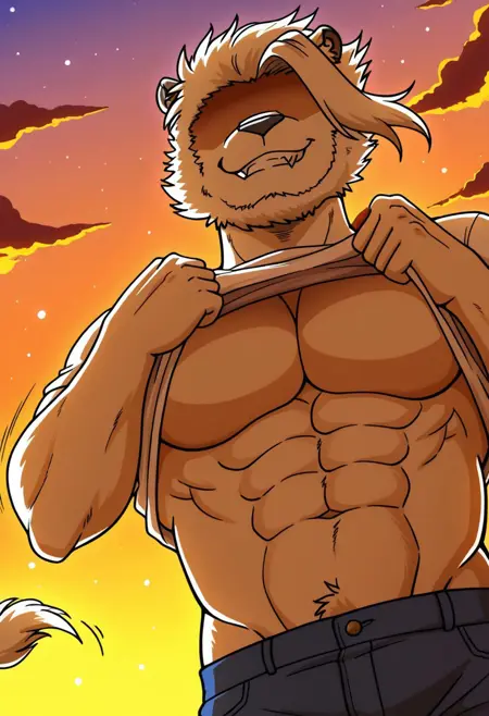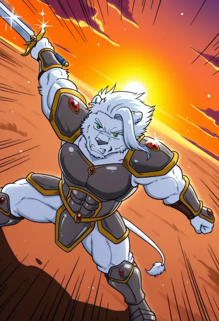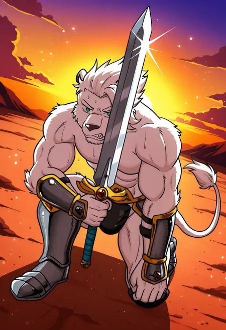 강화 프롬프트: "풍러, 남성, 사자, 꼬리, 녹색 눈, 흰색 털"