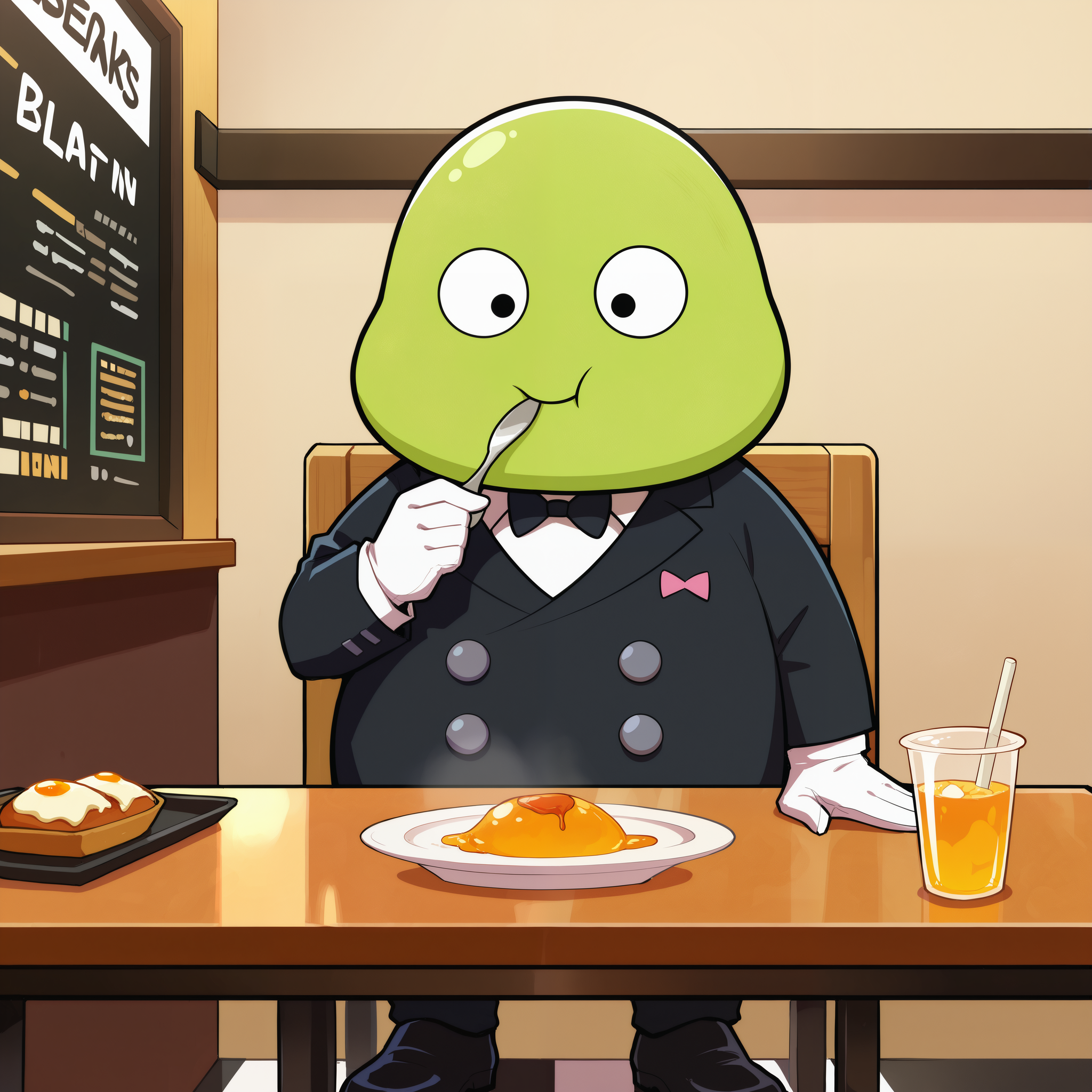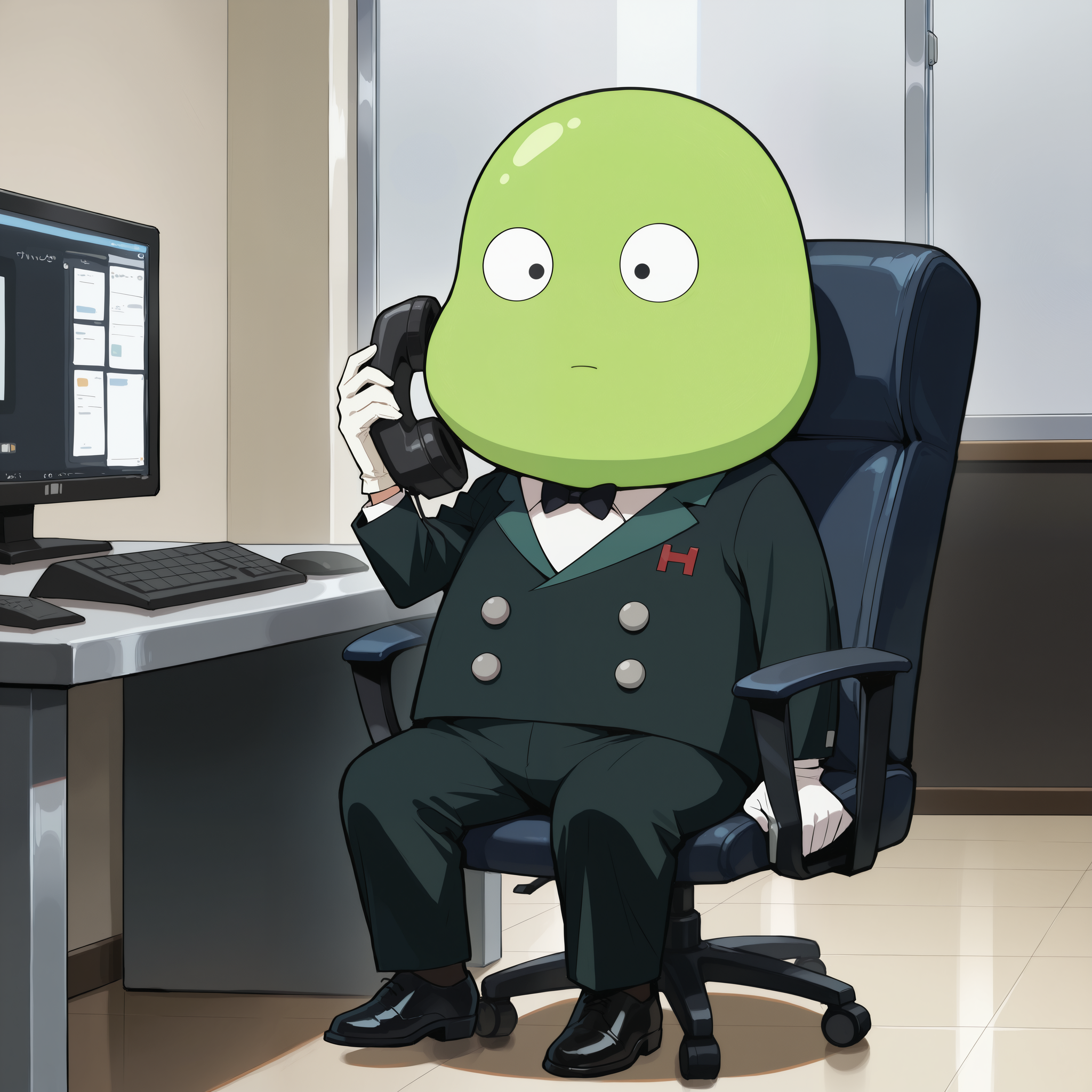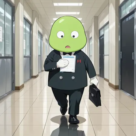 긍정 프롬프트에 다음을 추가: MBeans, 어두운 녹색 피부, 리본넥타이, 검은 눈, 정장, H형 넥타이, 검은 신발, 장갑
