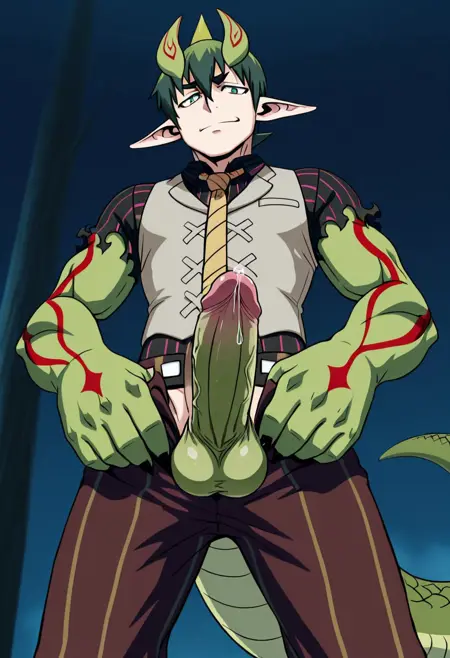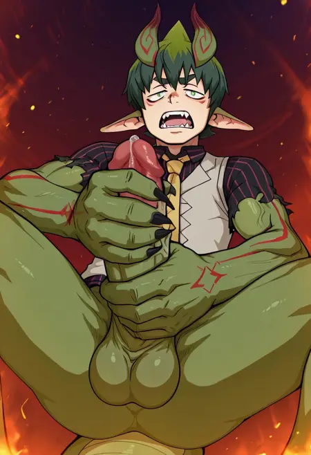 阿马imon,恶魔形态,单人,1个男孩,刺猬头,深绿色头发,绿色眼睛,白色眼白,绿色瞳孔,尖耳朵,长指甲,黑色指甲,长耳,头上两只角,鳄鱼尾巴,肌肉发达的手臂,绿色手臂,红色纹身,黑粉相间衬衫,短袖衬衫,破损袖口,灰色背心,黄色领带,深红色长裤,破损长裤,绿色袜子,长筒袜,绿色鞋子