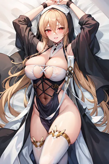 デフォルト: ヴェール、修道女、偽の角、輪光、広い袖、黒手袋、白いタイツ、胸の間