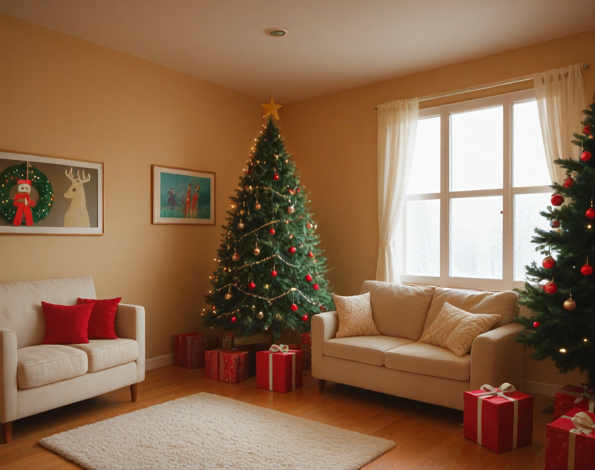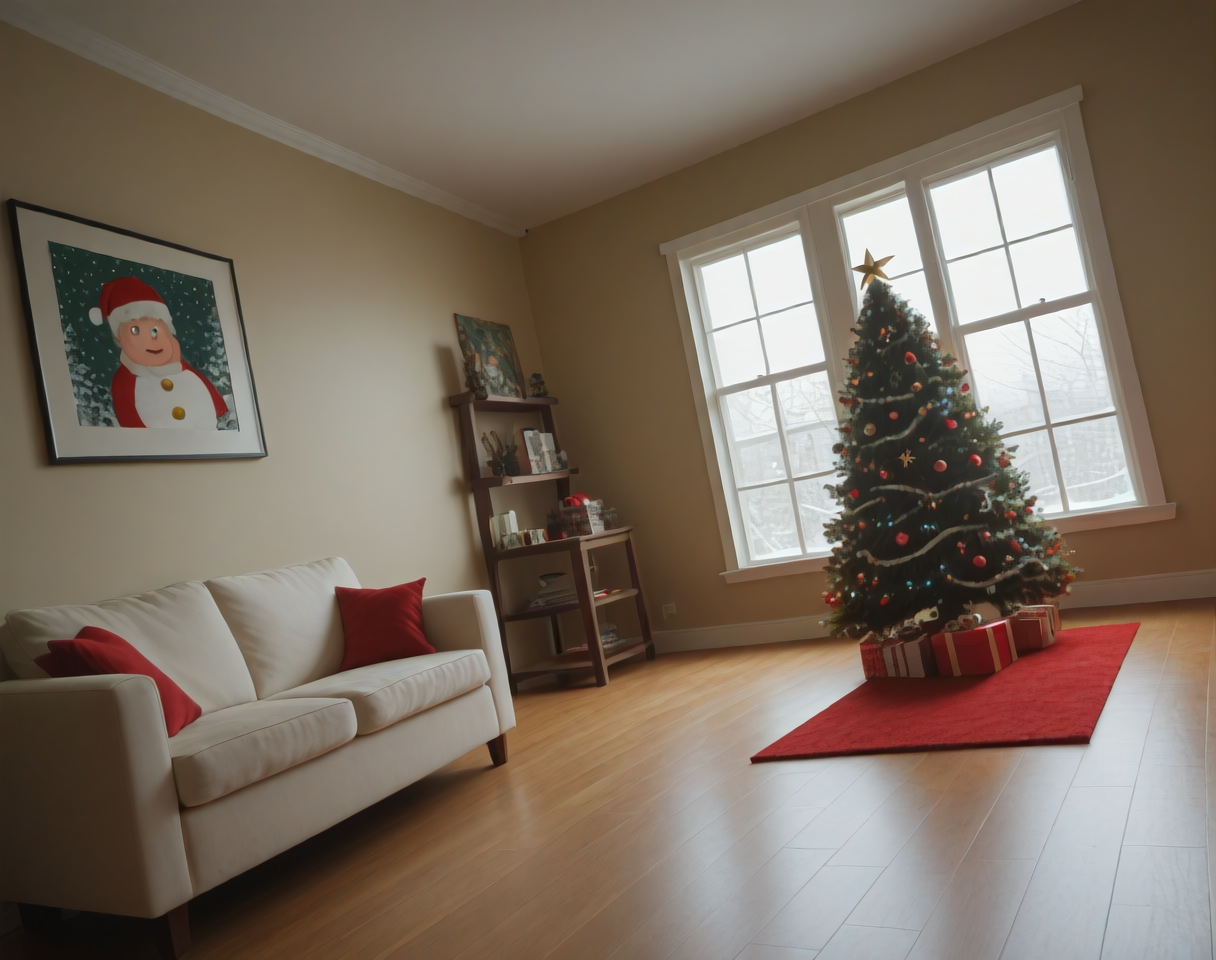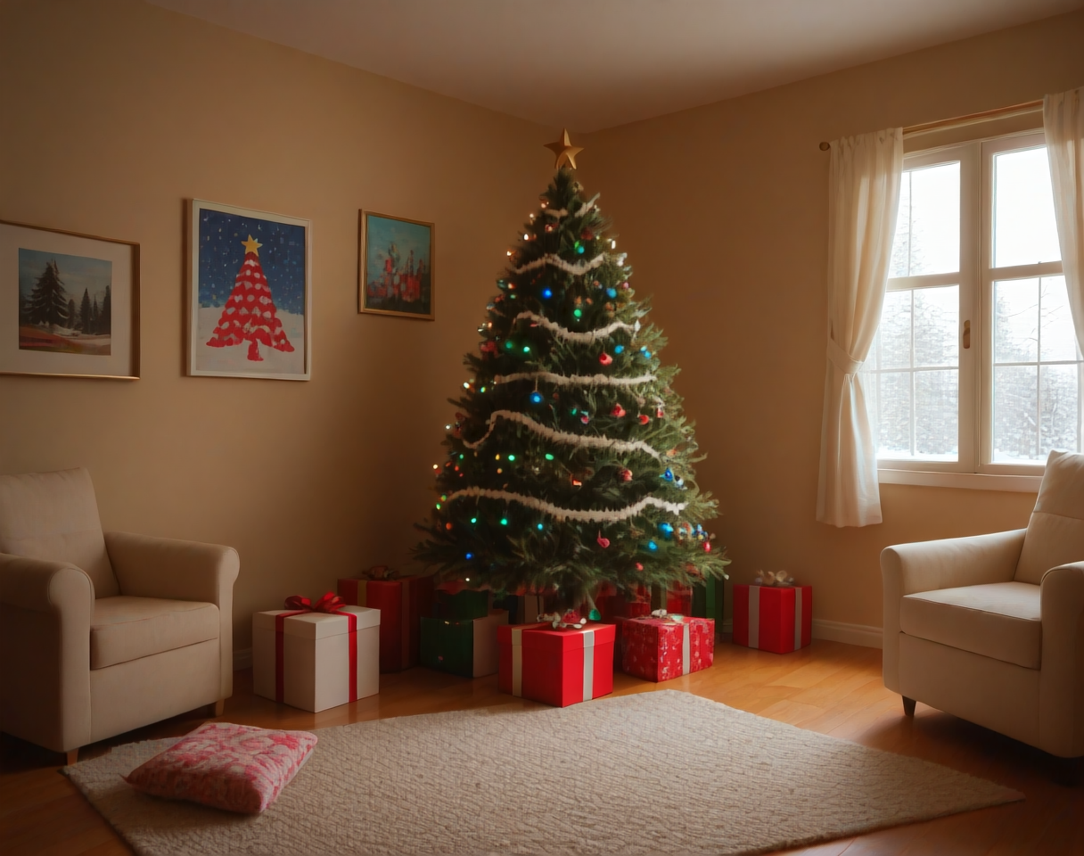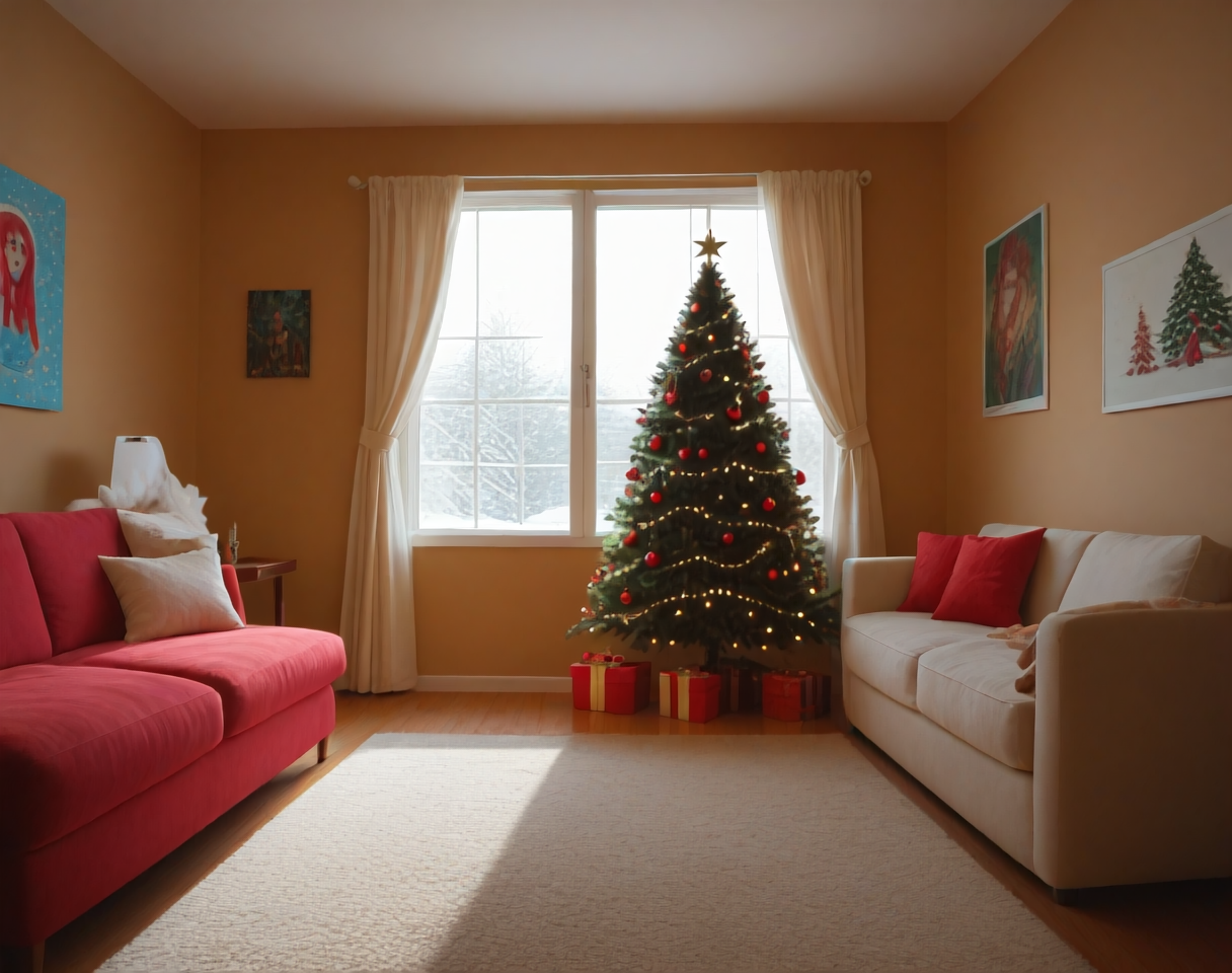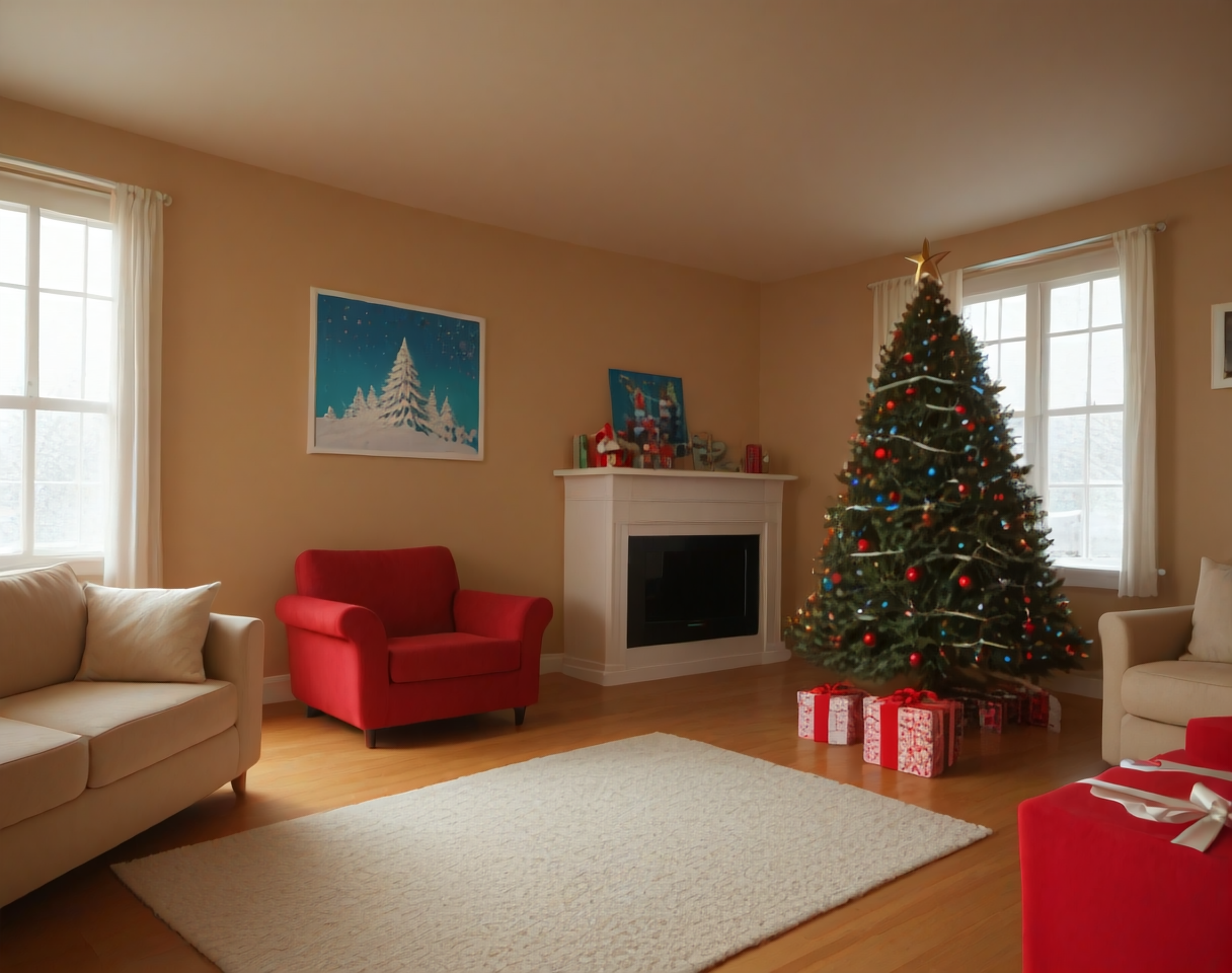 これは、クリスマステーマのリビングルームのインテリア装飾設定用のポニーLoRAです。