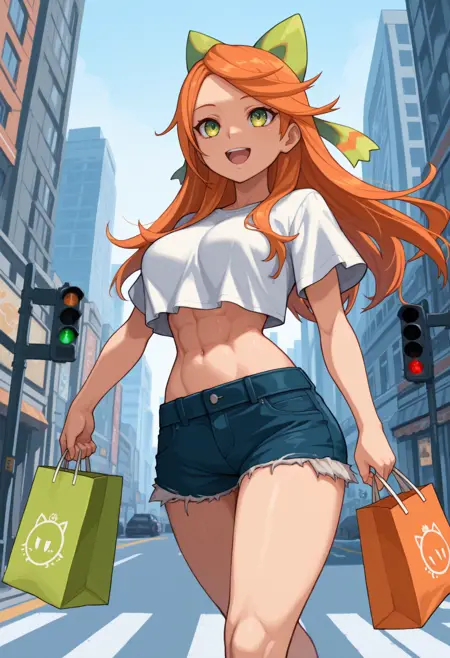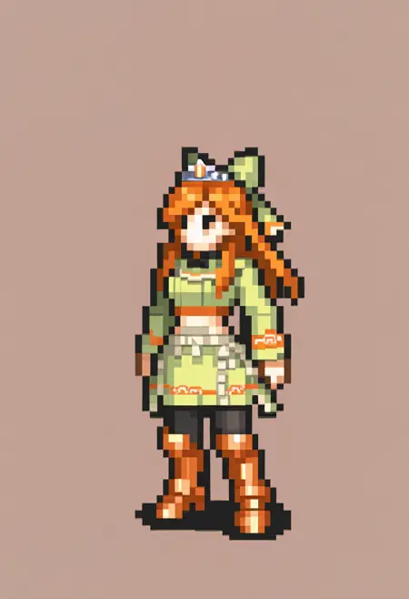 Default appearance: defEtie, orange hair, long hair, hair bow, tiara, green eyes, black bowtie, green crop top, long sleeves, midriff, green skirt, frills, white bow, black pantyhose, armored boots, orange footwear