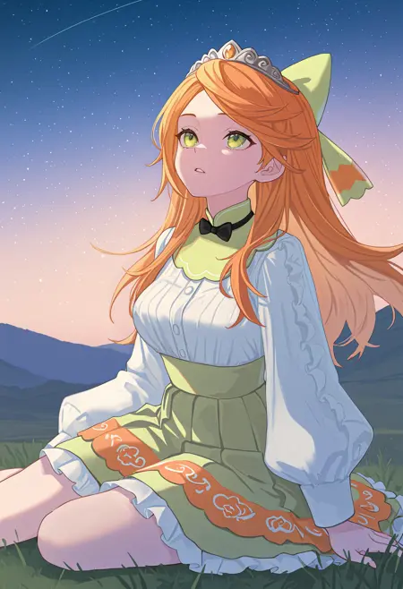 Somniel outfit: casEtie, orange hair, long hair, hair bow, tiara, green eyes, black bowtie, white shirt, puffy long sleeves, green high-waist skirt, frilled skirt