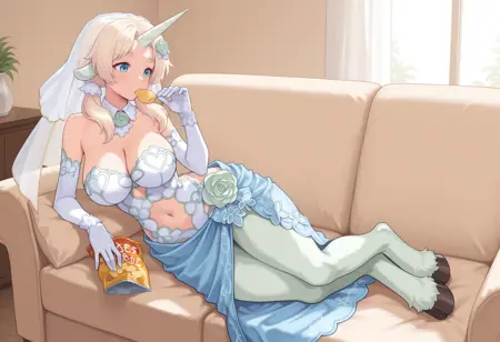 유니콘: unicorn_mge, 단일 뿔, 금발, 파란 눈, 긴 머리, 낮은 트윈테일, 동물 귀, 파운, 동물 다리, 갈퀴, 머리카락 꽃, 베일, 레오타드, 가슴 노출, 분리된 목걸이, 배꼽 컷아웃, 팔꿈치 장갑. 사롱, 드레스 꽃