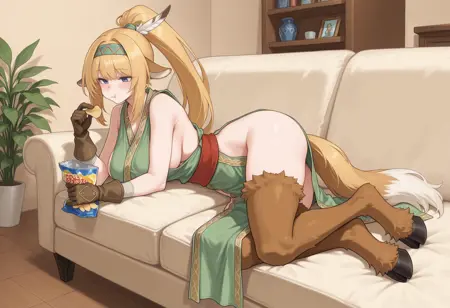 켄타우로스: 긴 머리카락, 높은 폰테일, 옆머리, 파란 눈, 헤어밴드, 깃털, 파운, 동물 다리, 갈퀴, 장갑, 옆가슴 노출, 골반 커튼, 허리띠, 허벅지 홀. 켄타우로스는 코드가 없음 — AI를 혼란스럽게 함