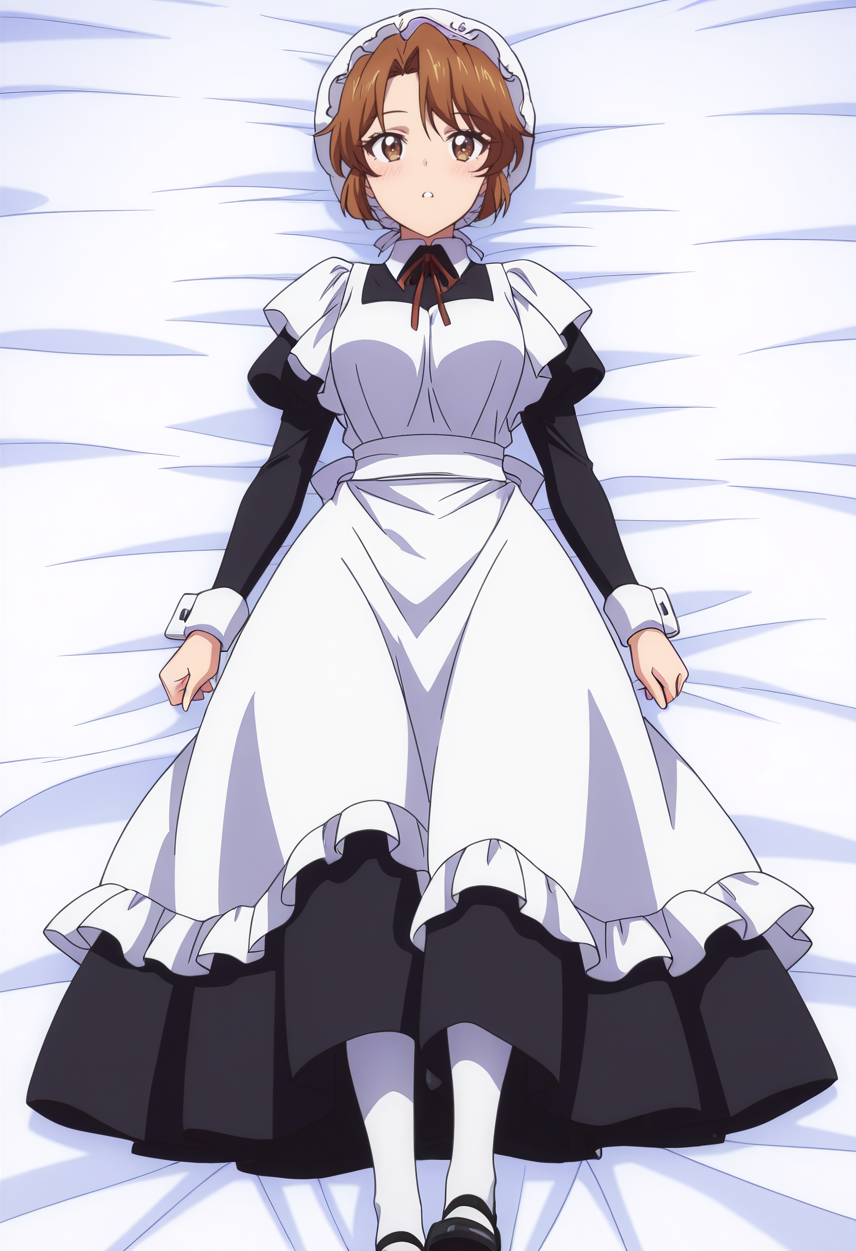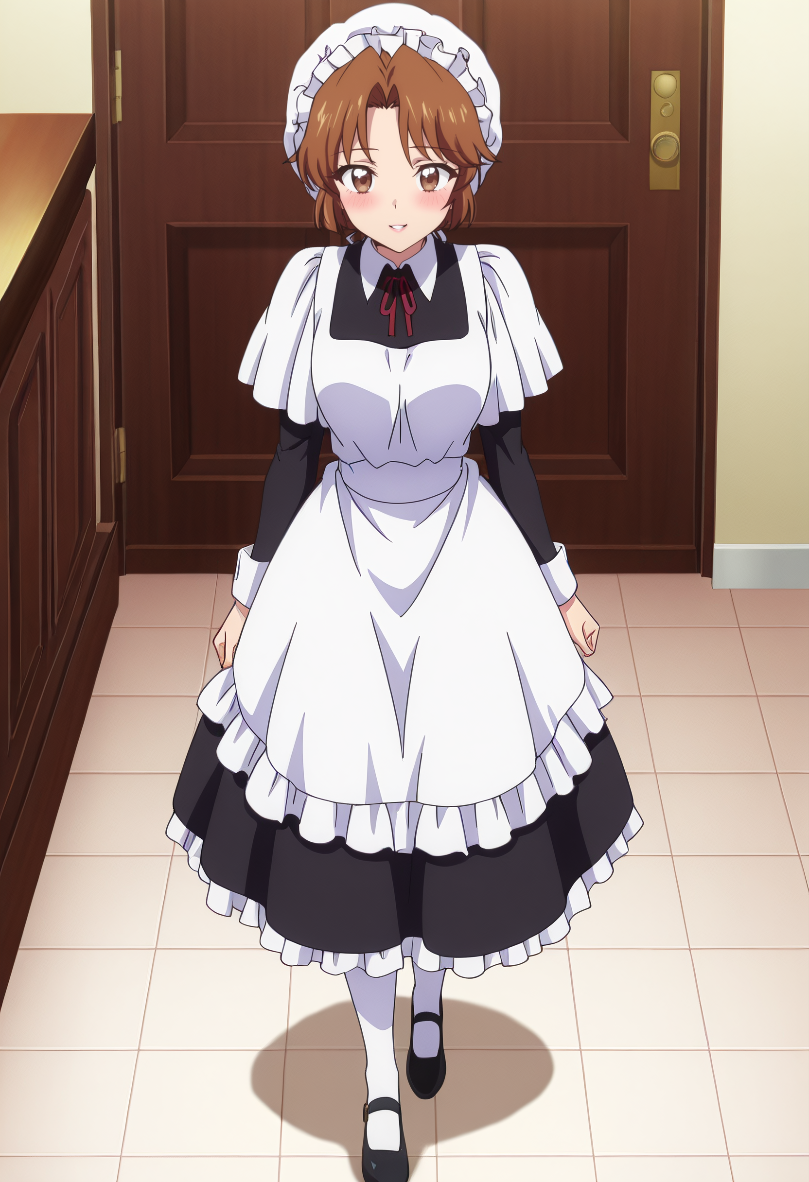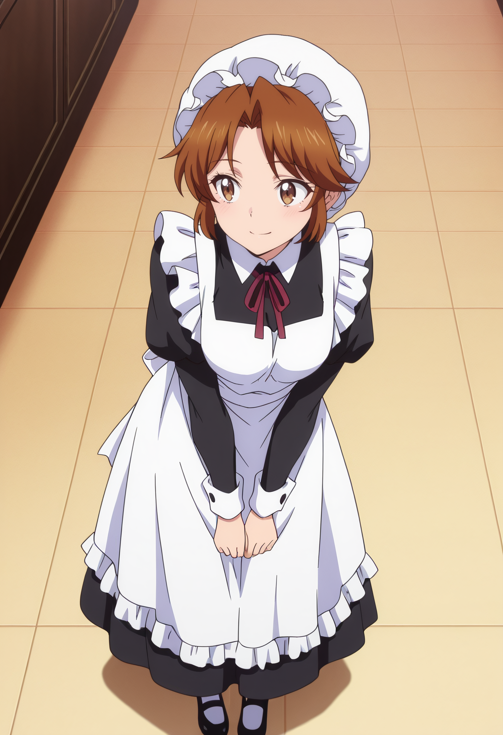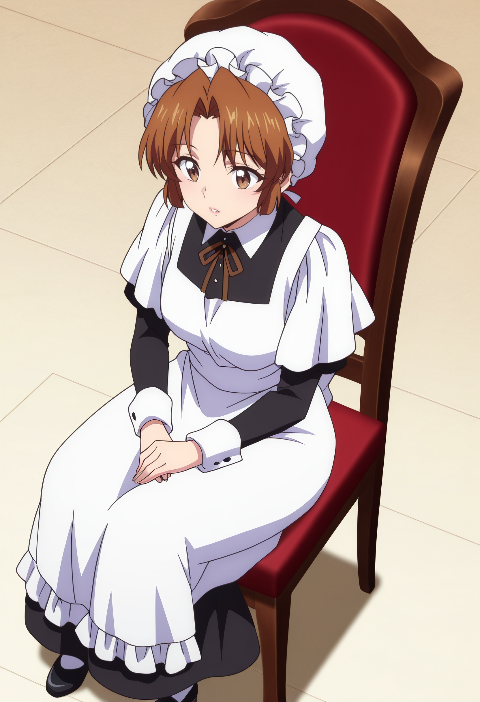 hat, mob cap, long sleeves, dress, apron, maid, white apron, maid apron, maid headdress, white headwear, black dress, puffy sleeves, enmaided, shoes, frills, black footwear, ribbon, frilled apron,
