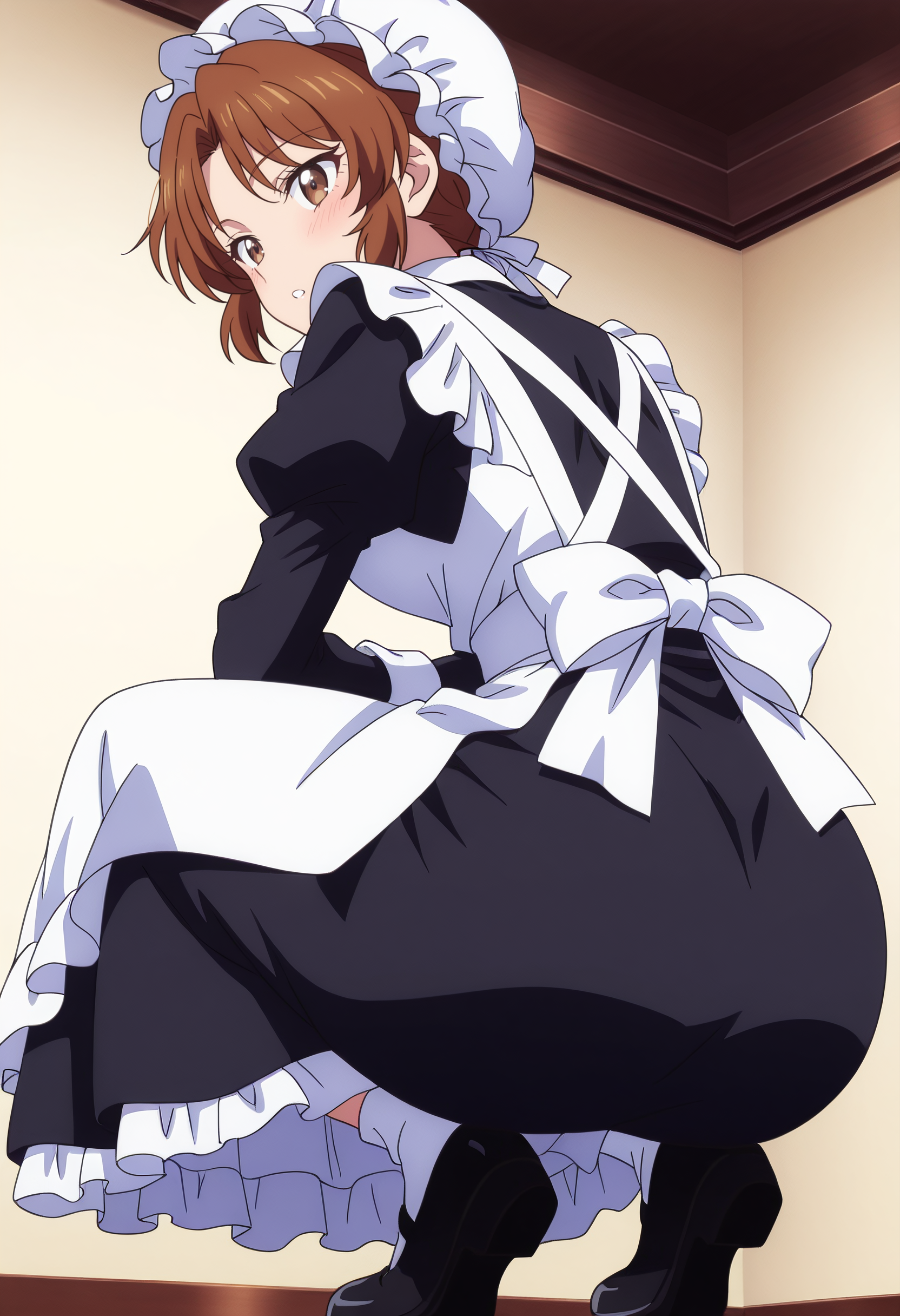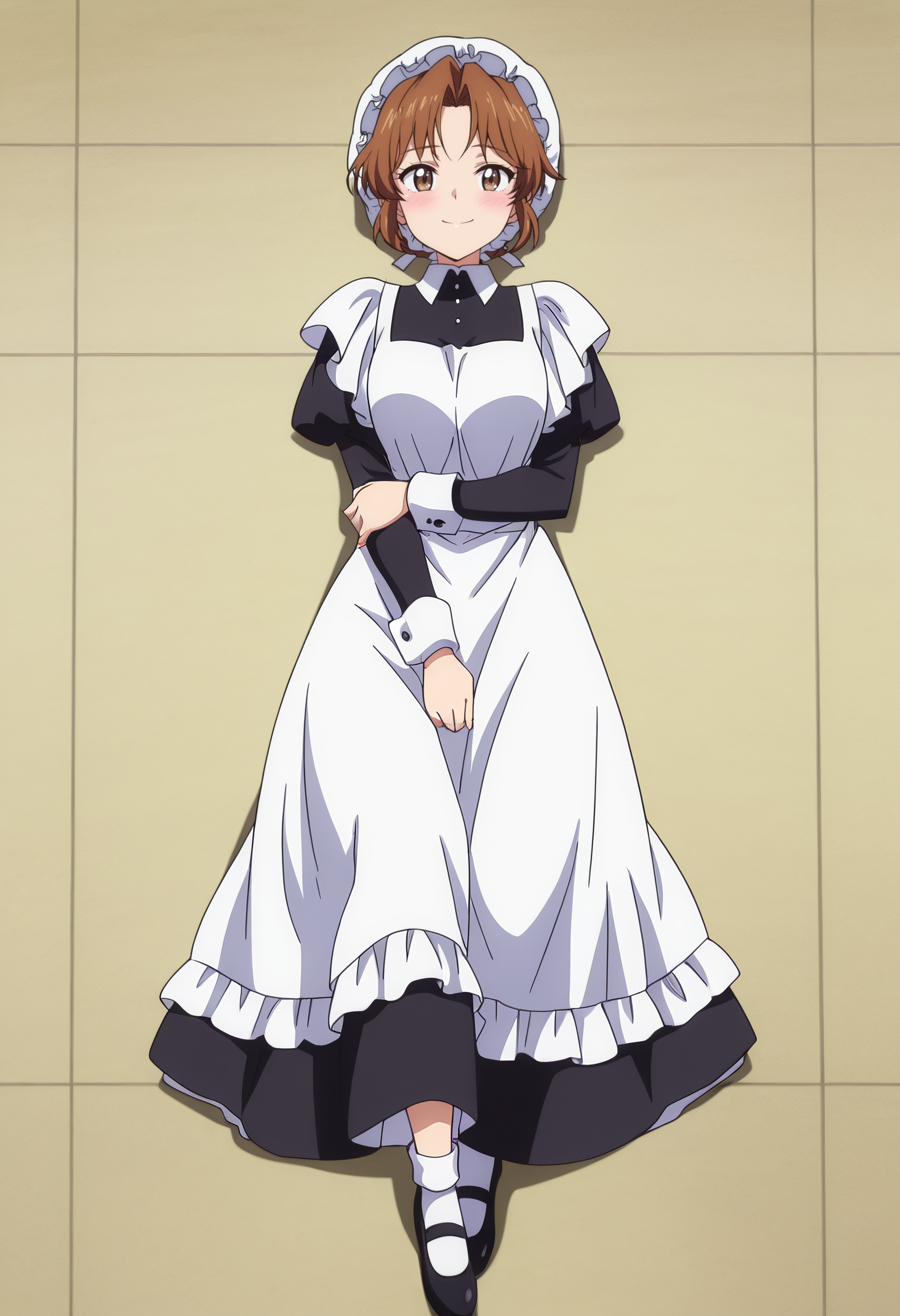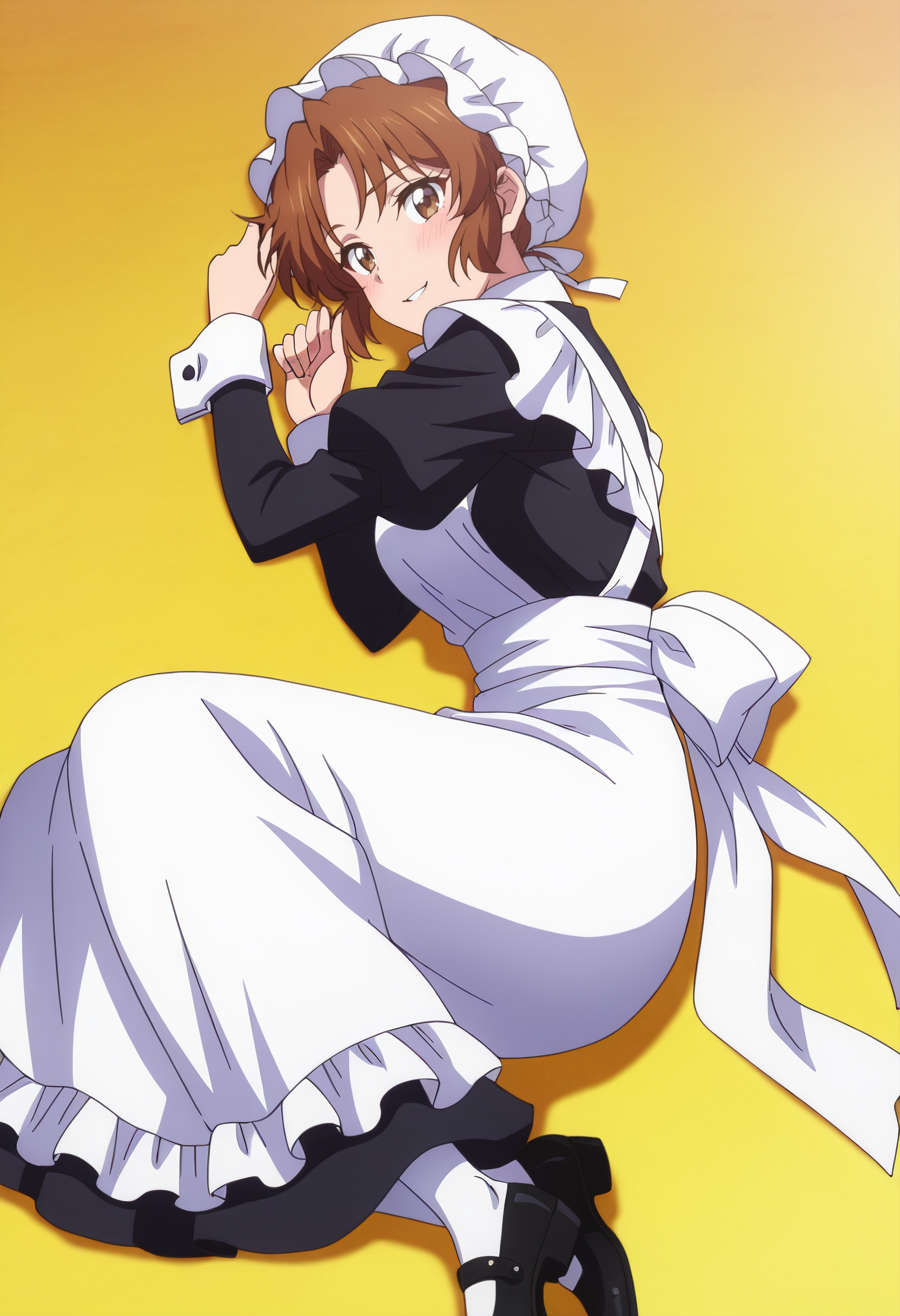 hat, mob cap, long sleeves, dress, apron, maid, white apron, maid apron, maid headdress, white headwear, black dress, puffy sleeves, enmaided, shoes, frills, black footwear, ribbon, frilled apron,