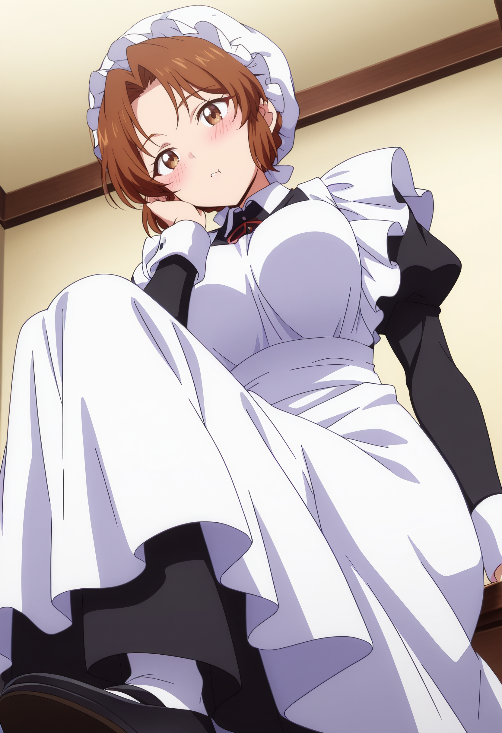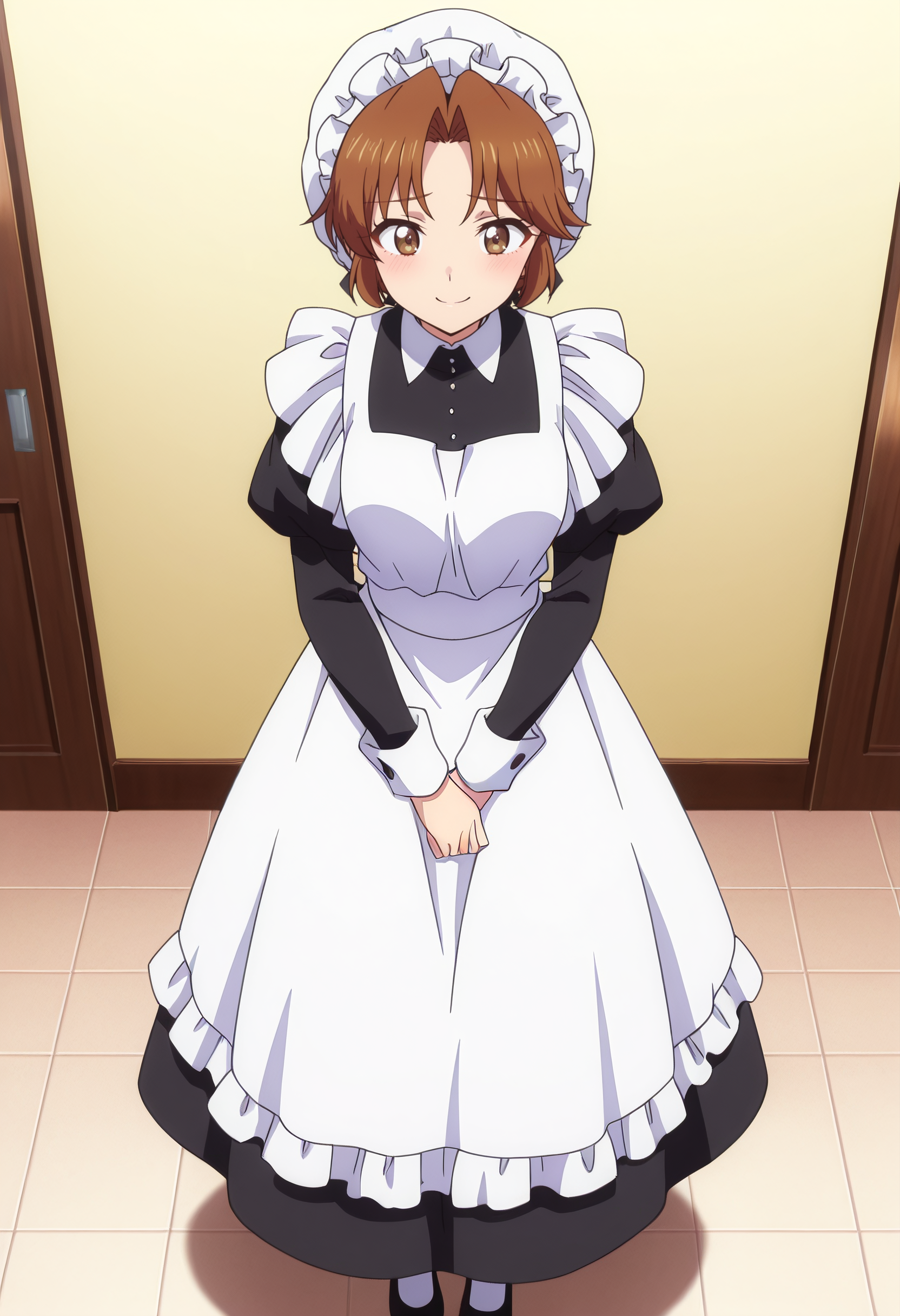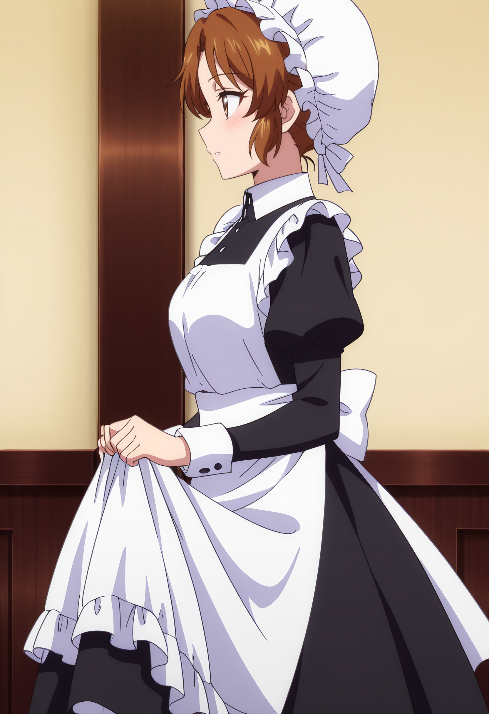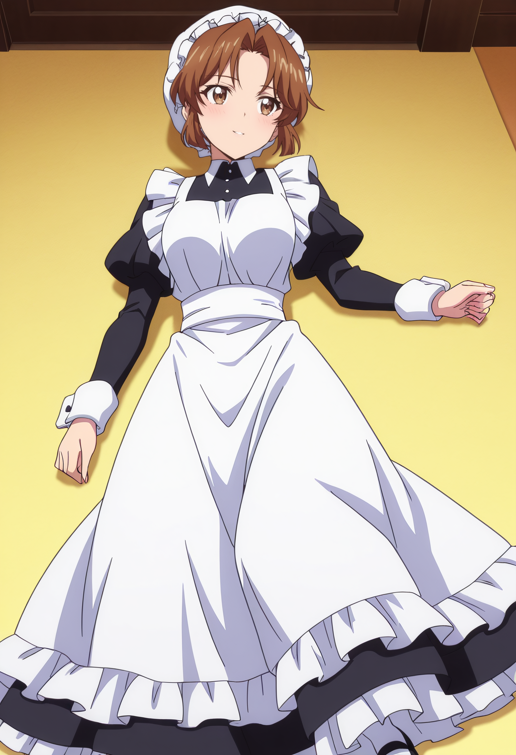hat, mob cap, long sleeves, dress, apron, maid, white apron, maid apron, maid headdress, white headwear, black dress, puffy sleeves, enmaided, shoes, frills, black footwear, ribbon, frilled apron,