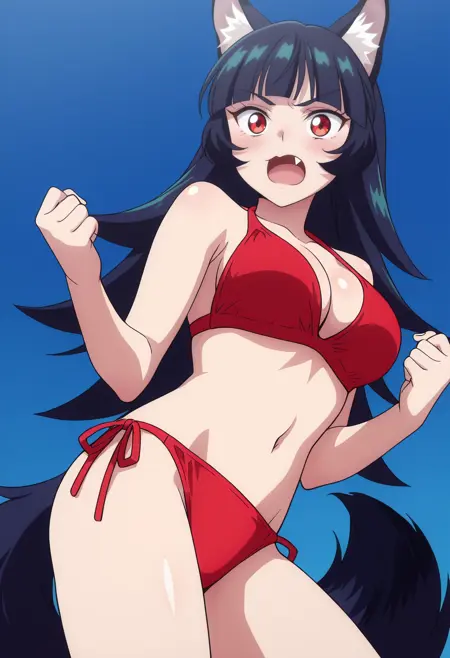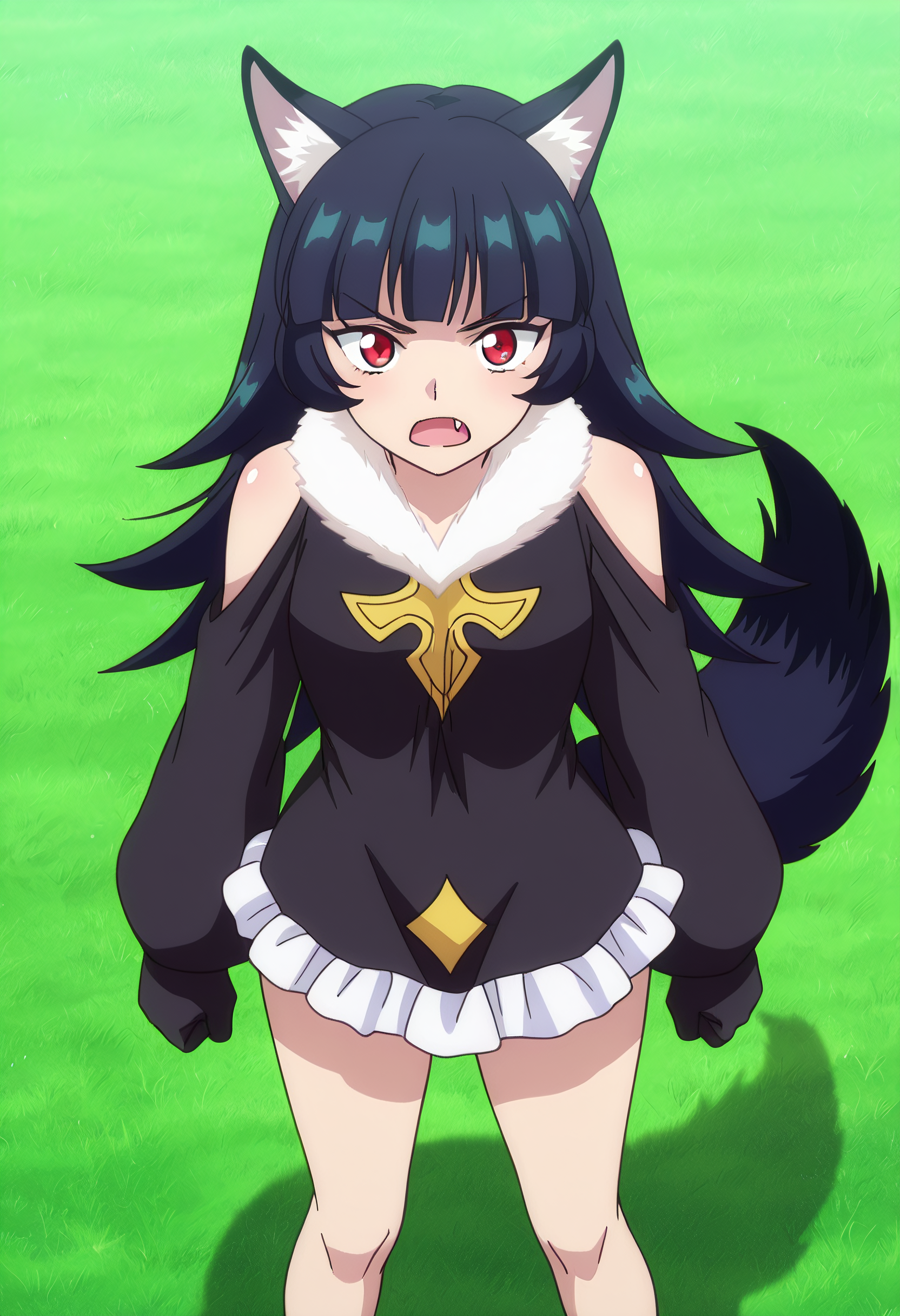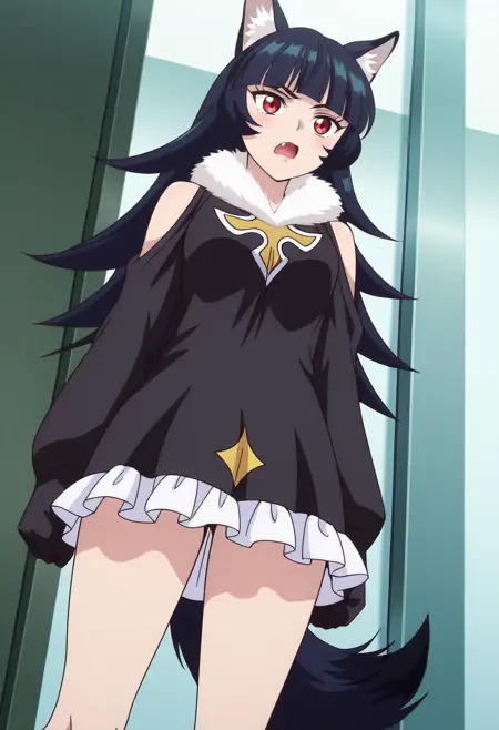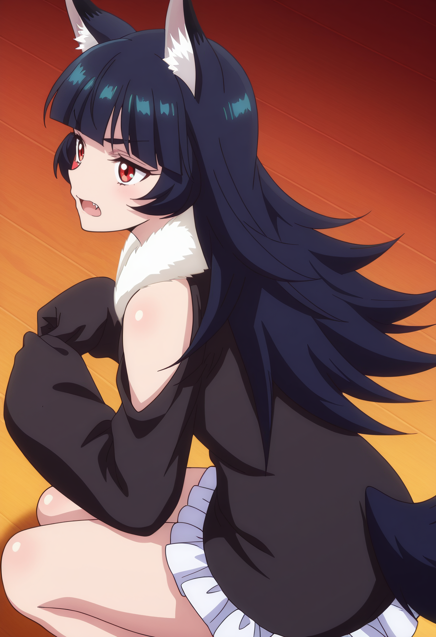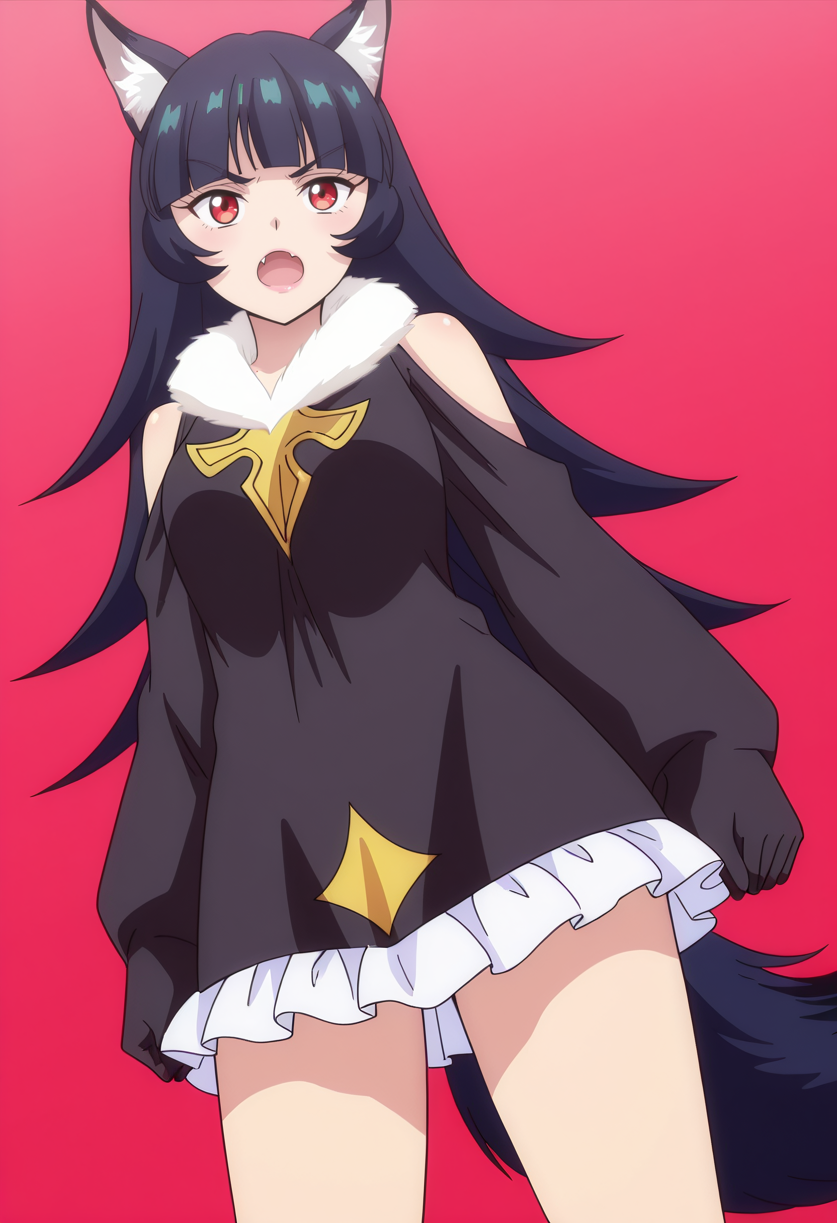 BYNChris, long hair, black hair, animal ears, red eyes, bangs, wolf ears, blunt bangs, eyebrows visible through hair, wolf tail, fang, wolf girl, tail, animal ear fluff,