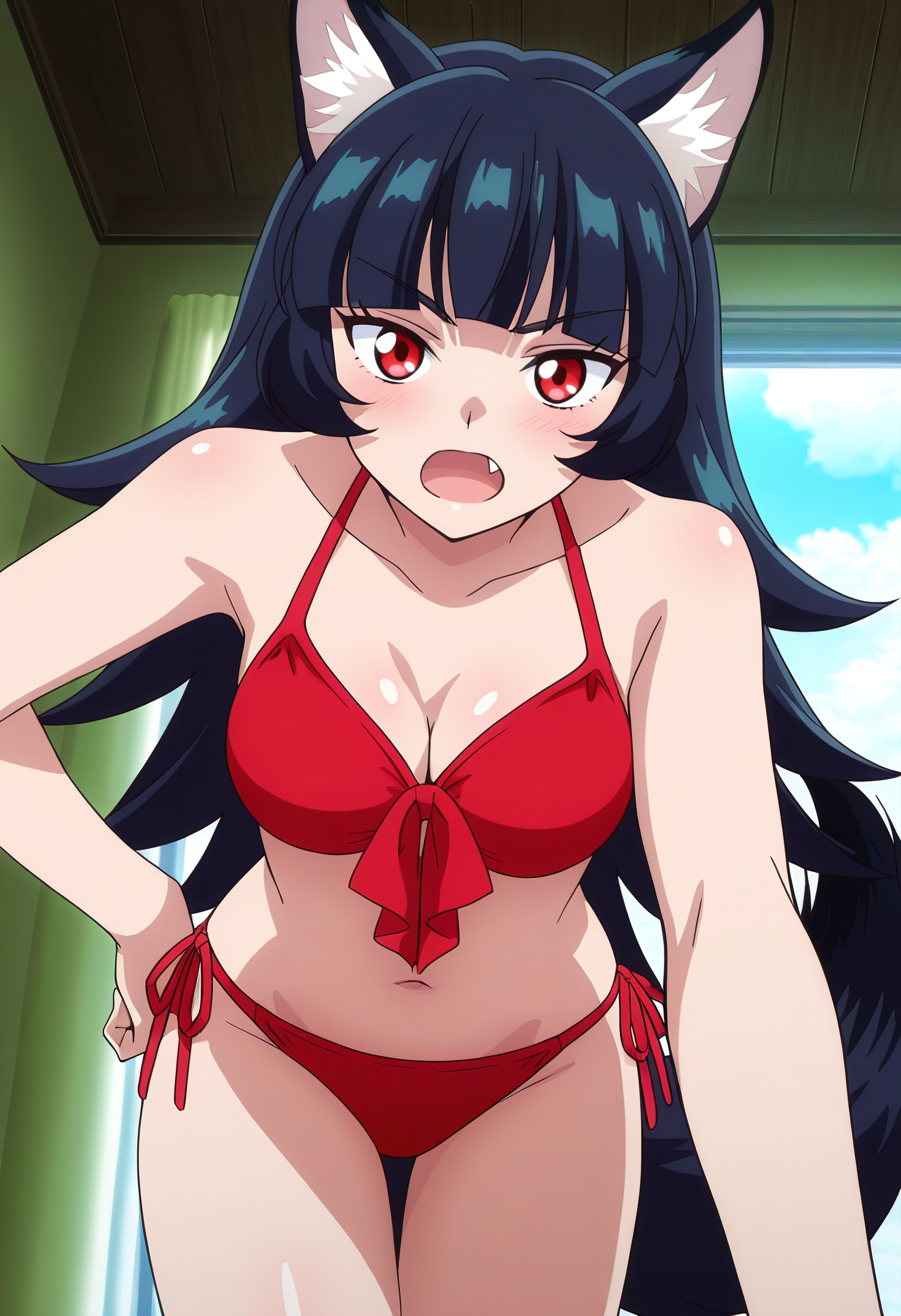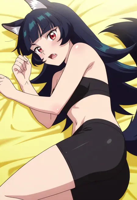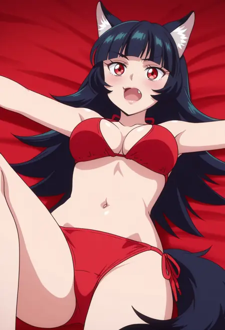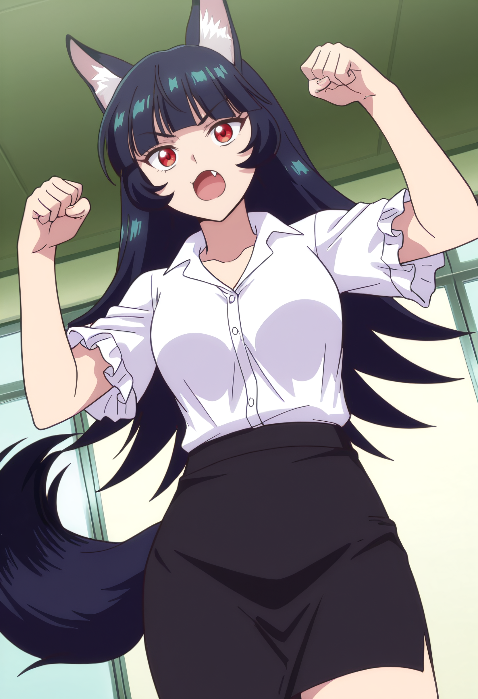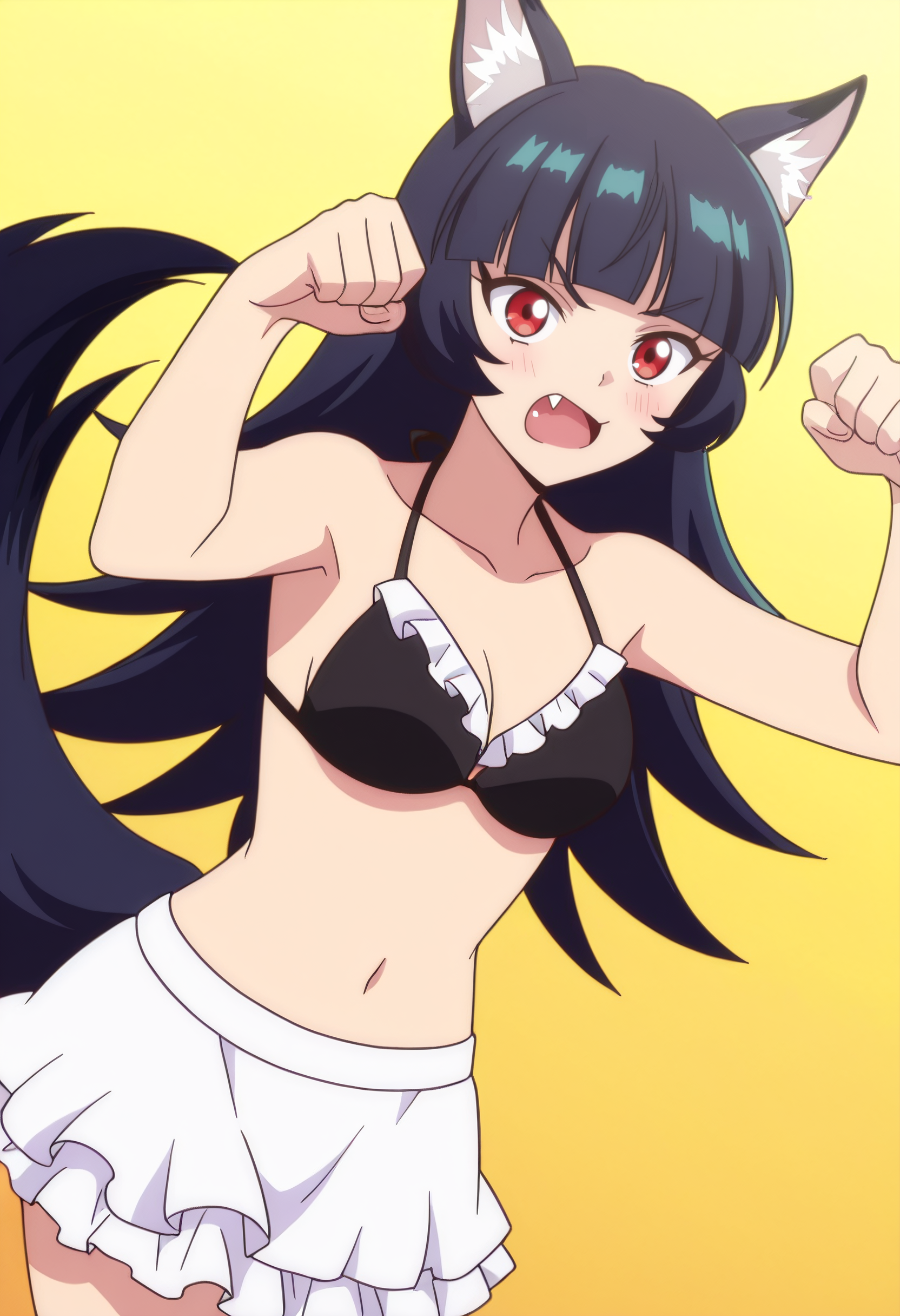 BYNChris, long hair, black hair, animal ears, red eyes, bangs, wolf ears, blunt bangs, eyebrows visible through hair, wolf tail, fang, wolf girl, tail, animal ear fluff,