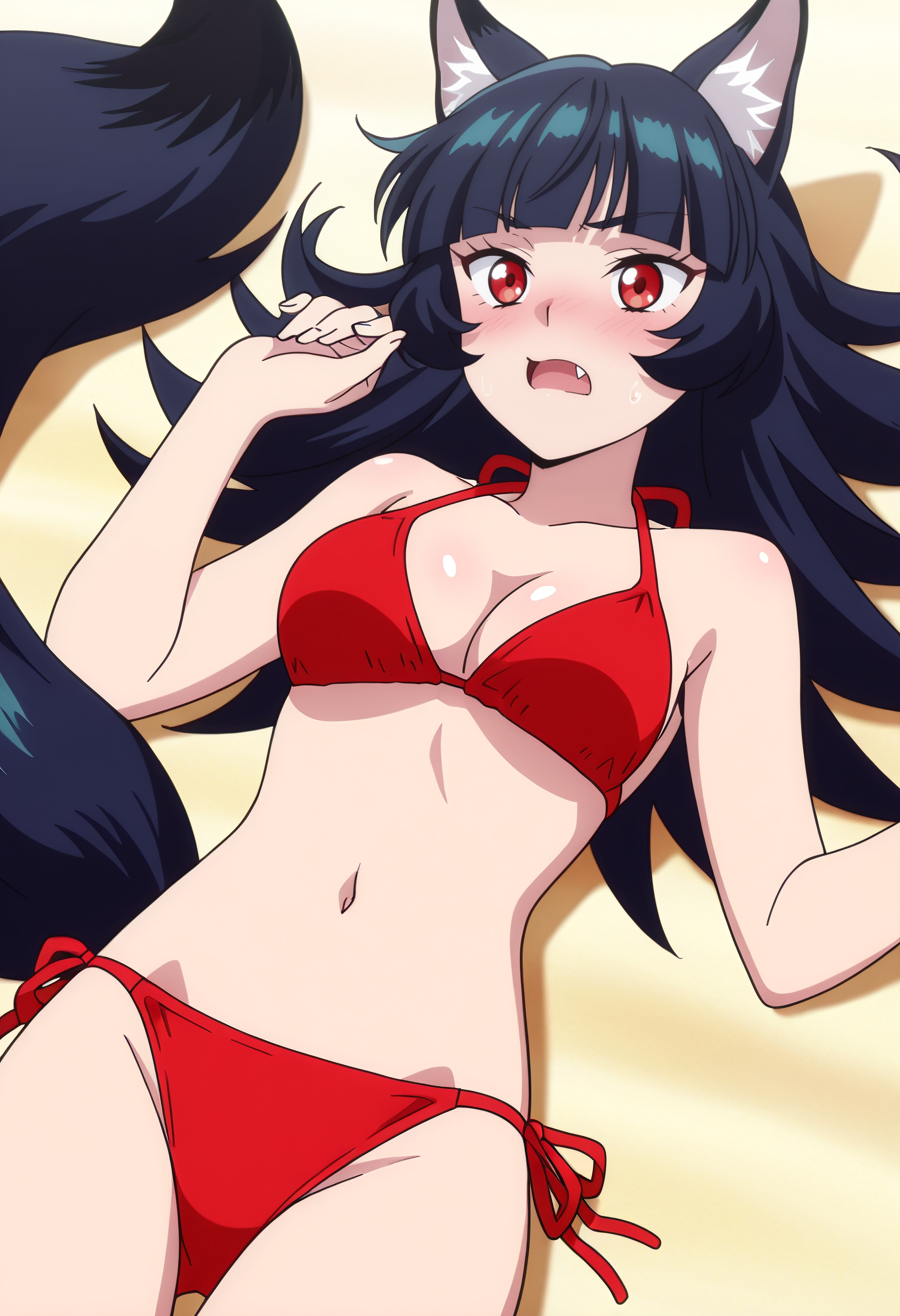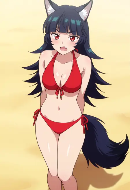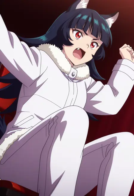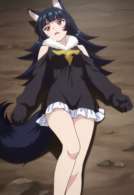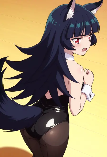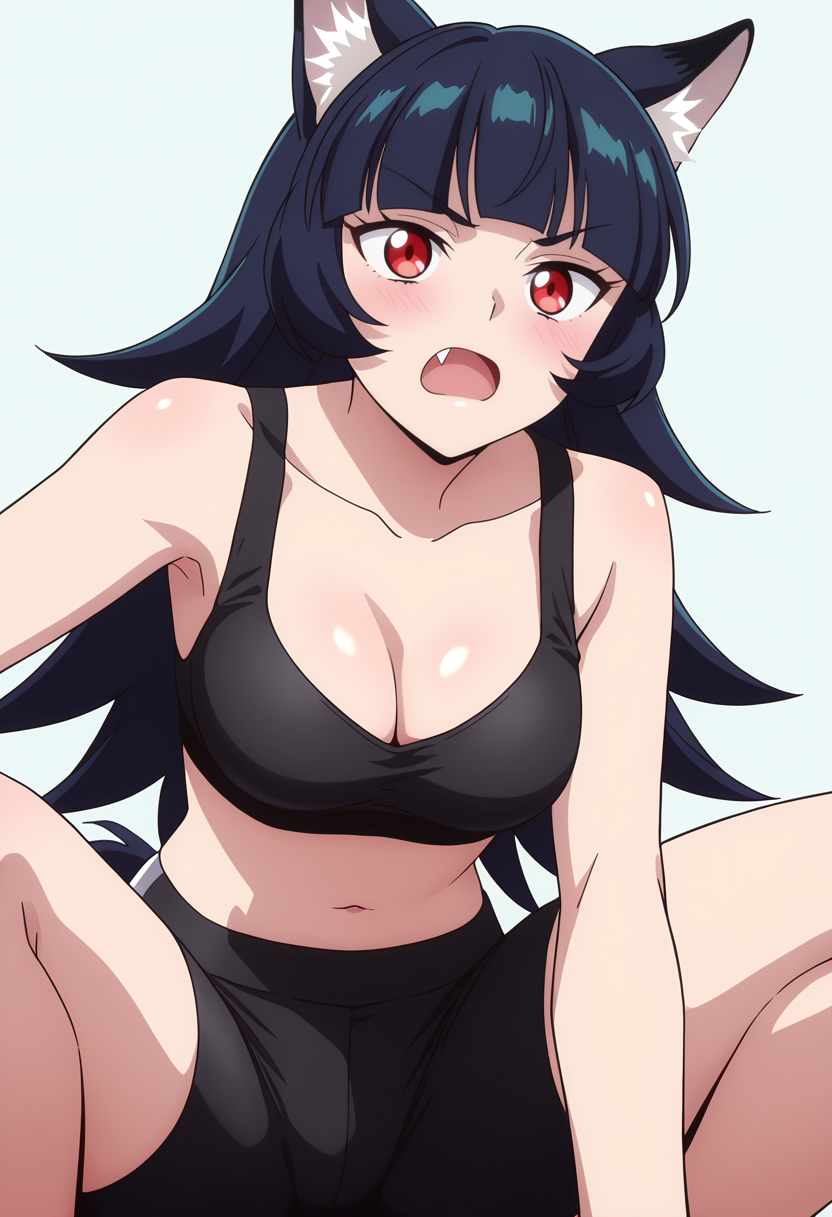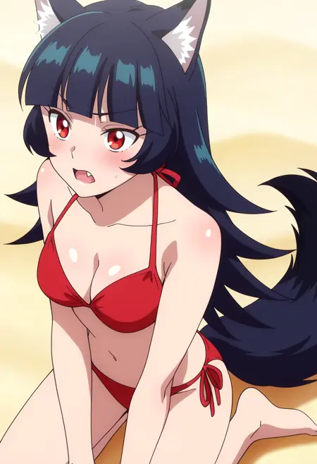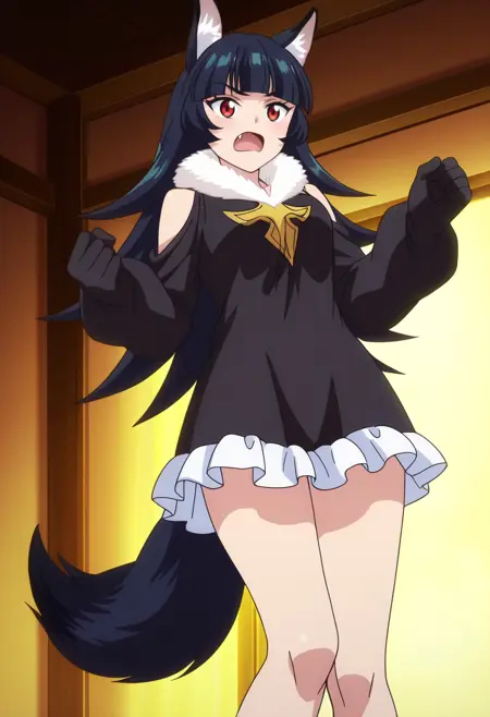 BYNChris, long hair, black hair, animal ears, red eyes, bangs, wolf ears, blunt bangs, eyebrows visible through hair, wolf tail, fang, wolf girl, tail, animal ear fluff,