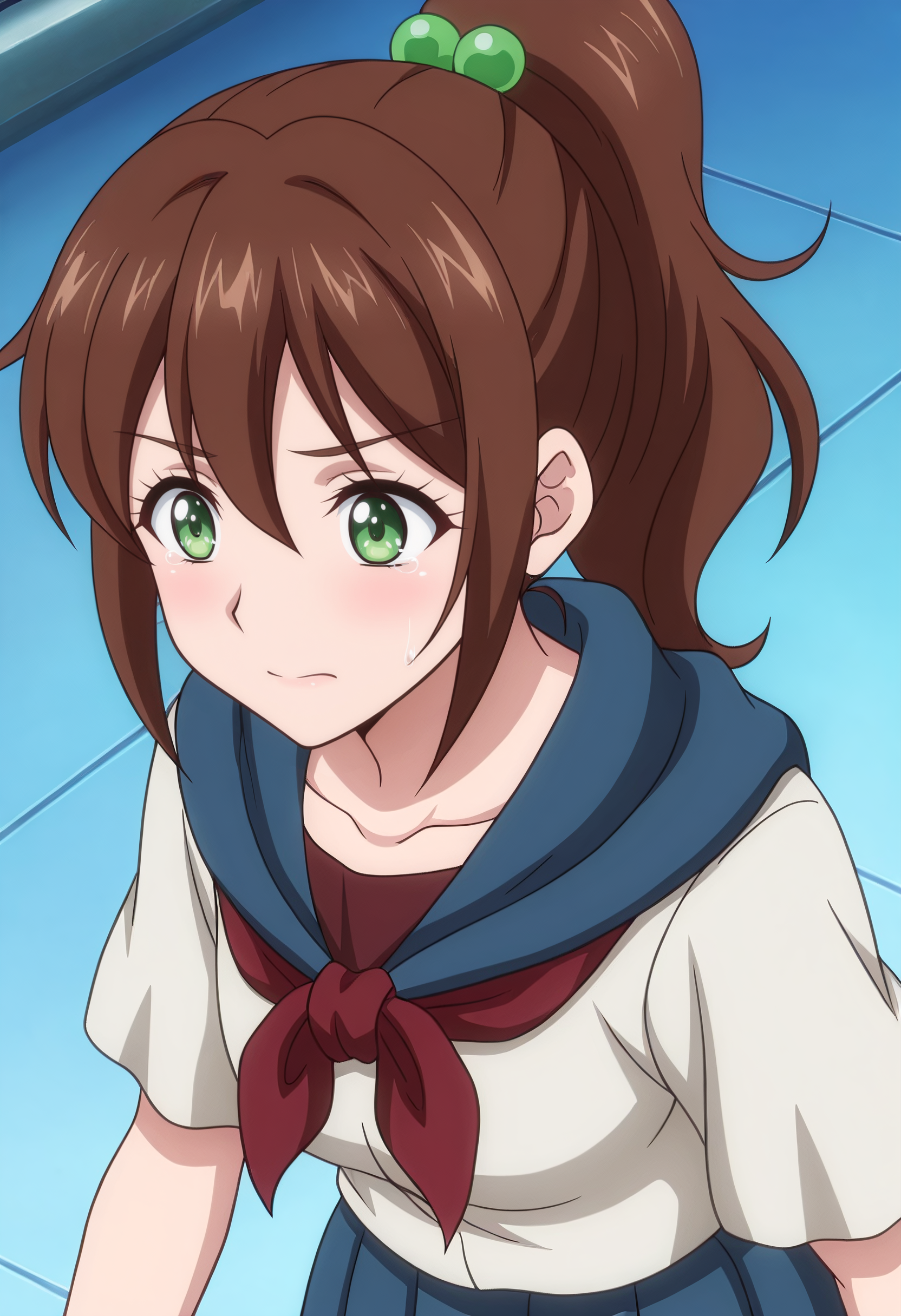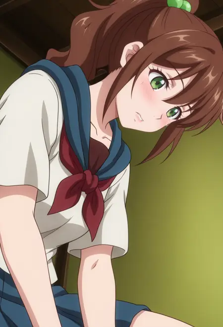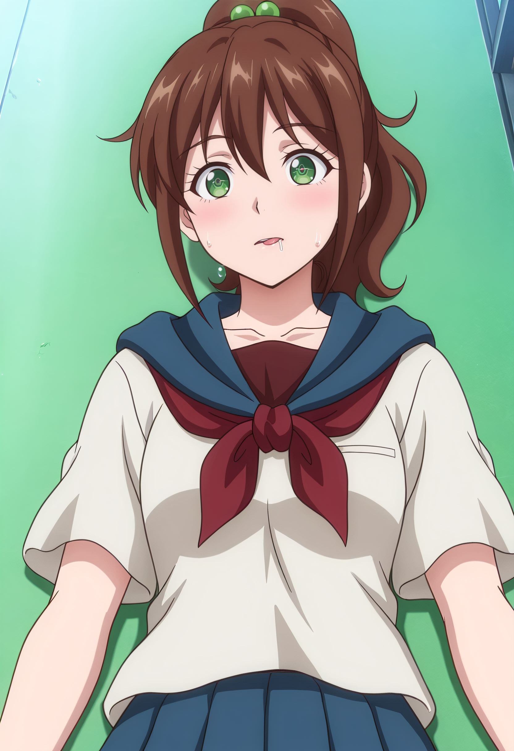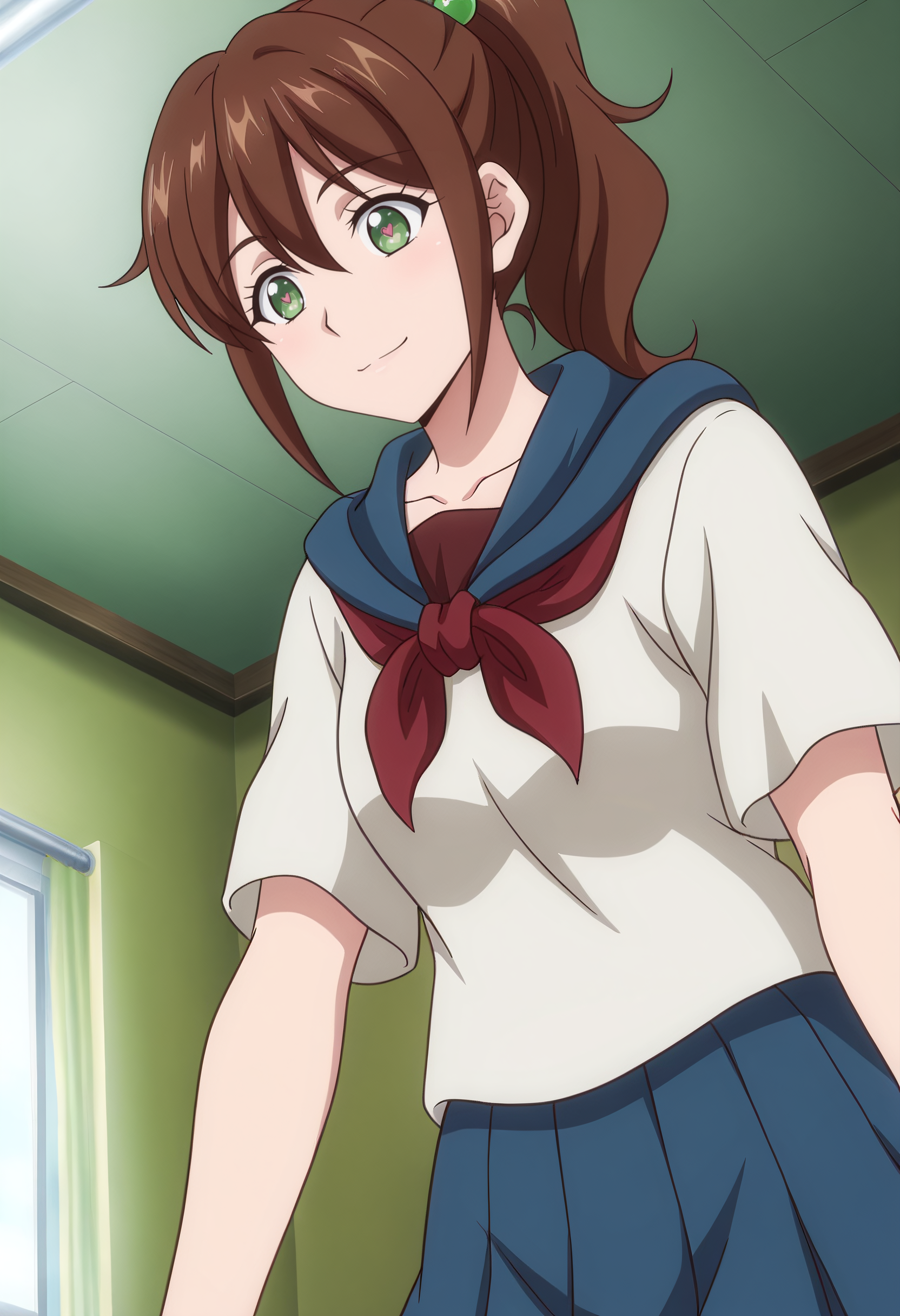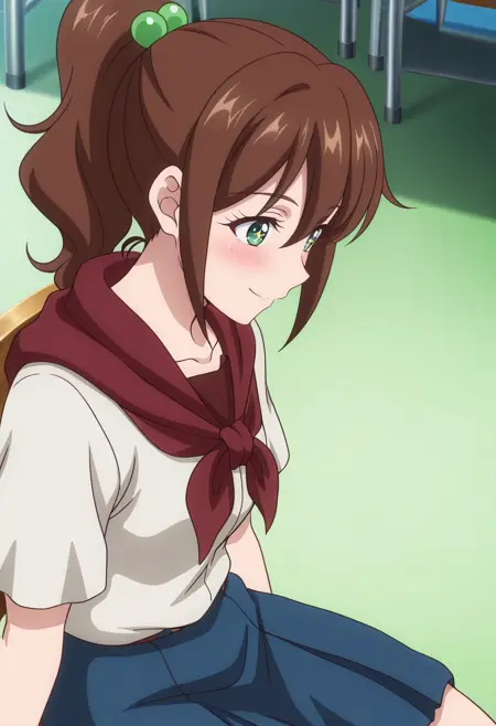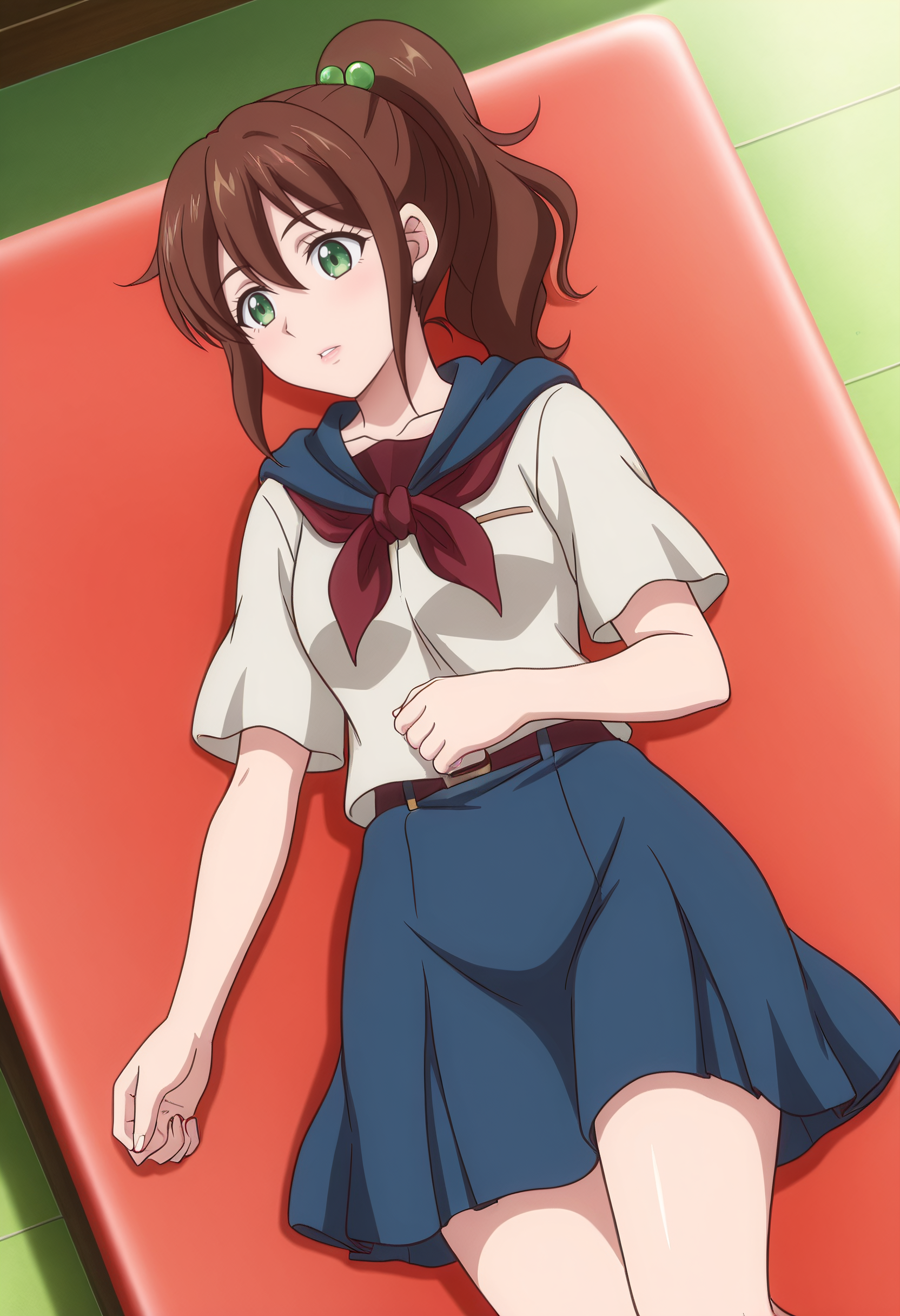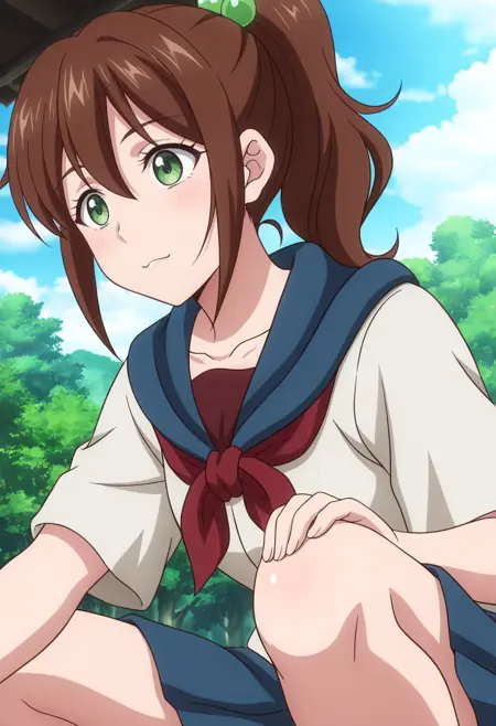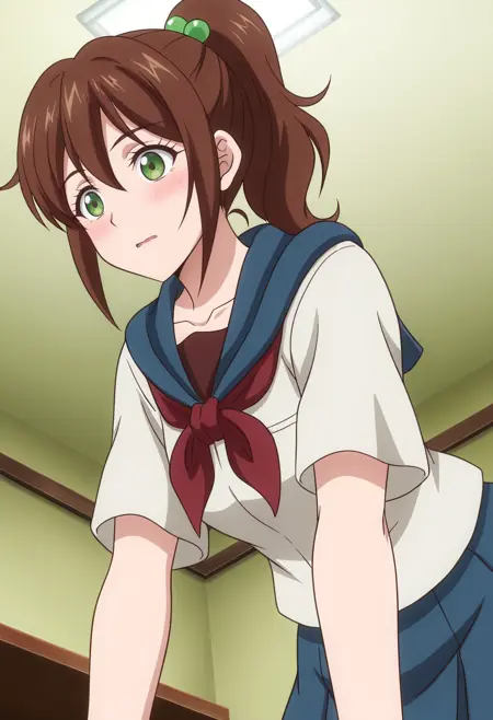 髪飾り、北条高校の制服、ネクタイ、赤いネクタイ、セーラー襟、学校制服、セーラー服、シャツ、短い袖、鎖骨、白いシャツ、スカート、青いスカート、プリーツスカート、