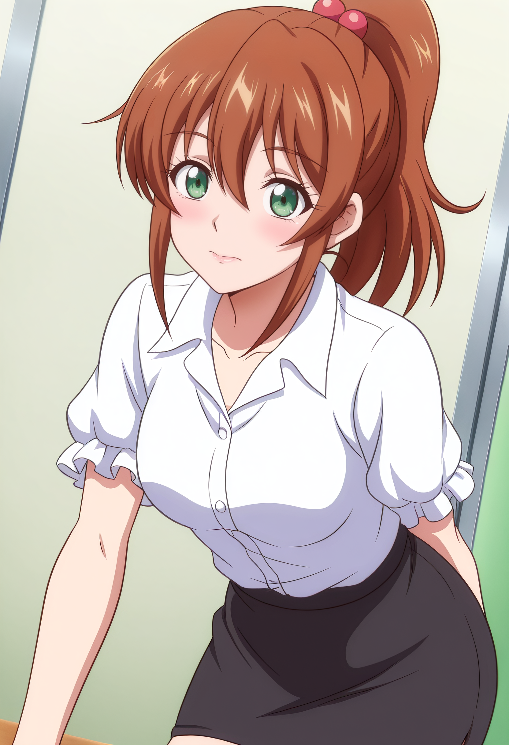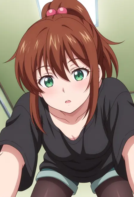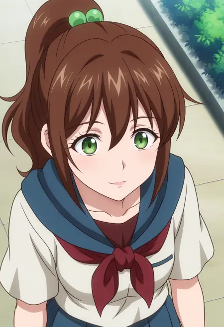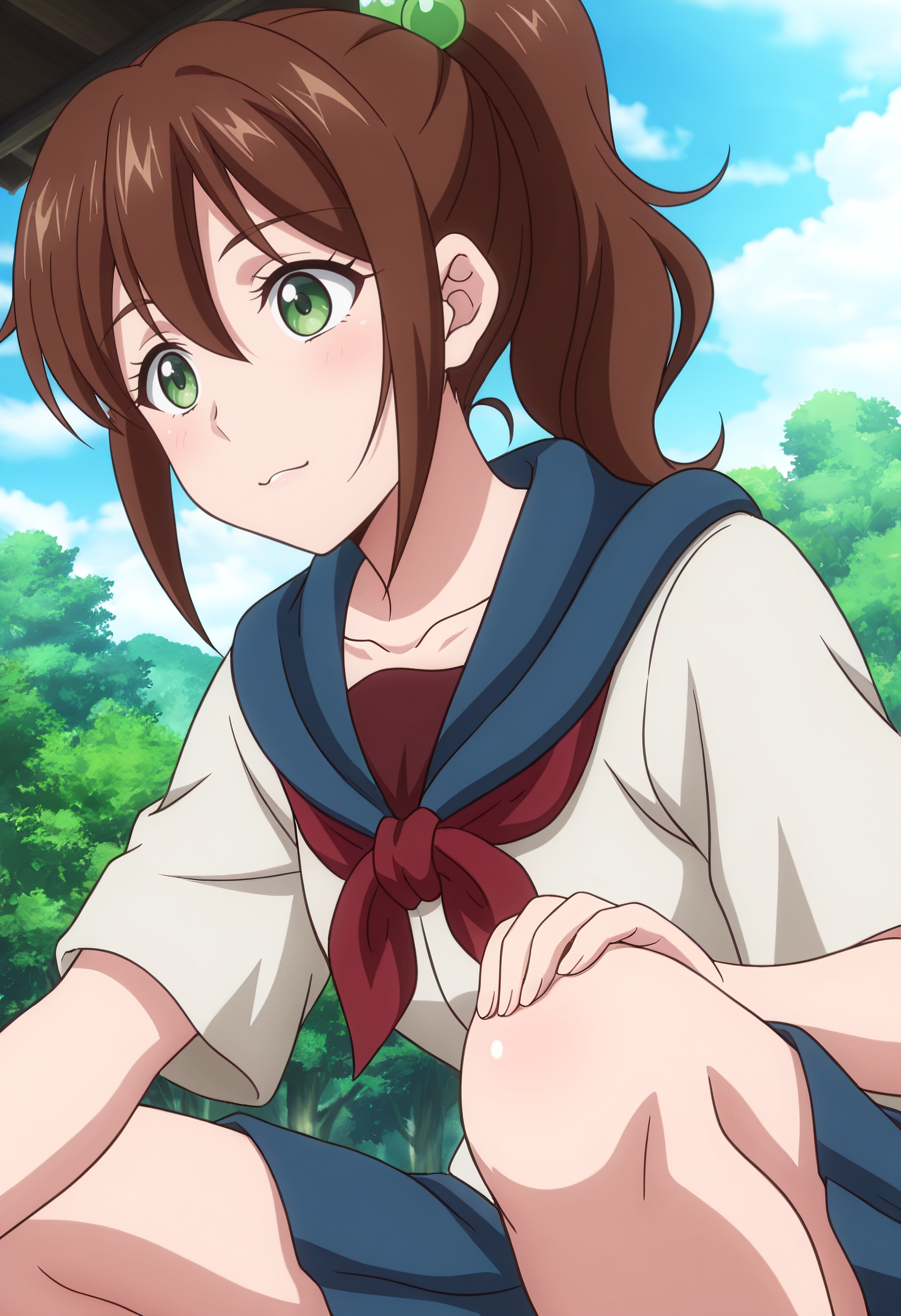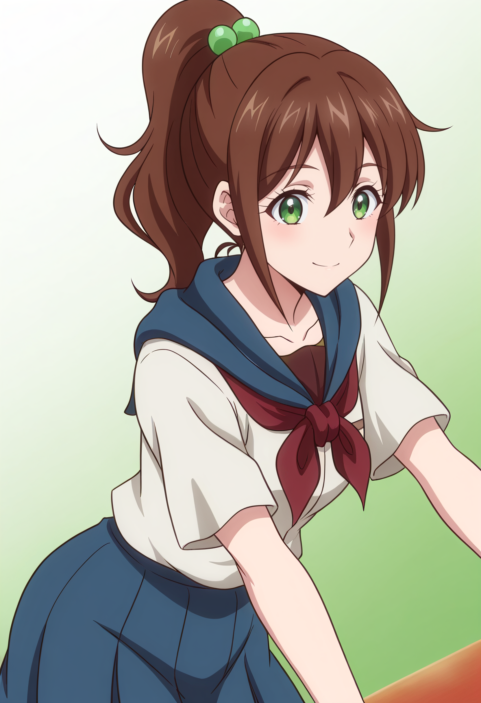 BYNRamenShopOwner、前髪、茶色の髪、緑の目、長い髪、ポニーテール、髪飾り、髪の間から見える眉、目と目の間の髪、横髪、