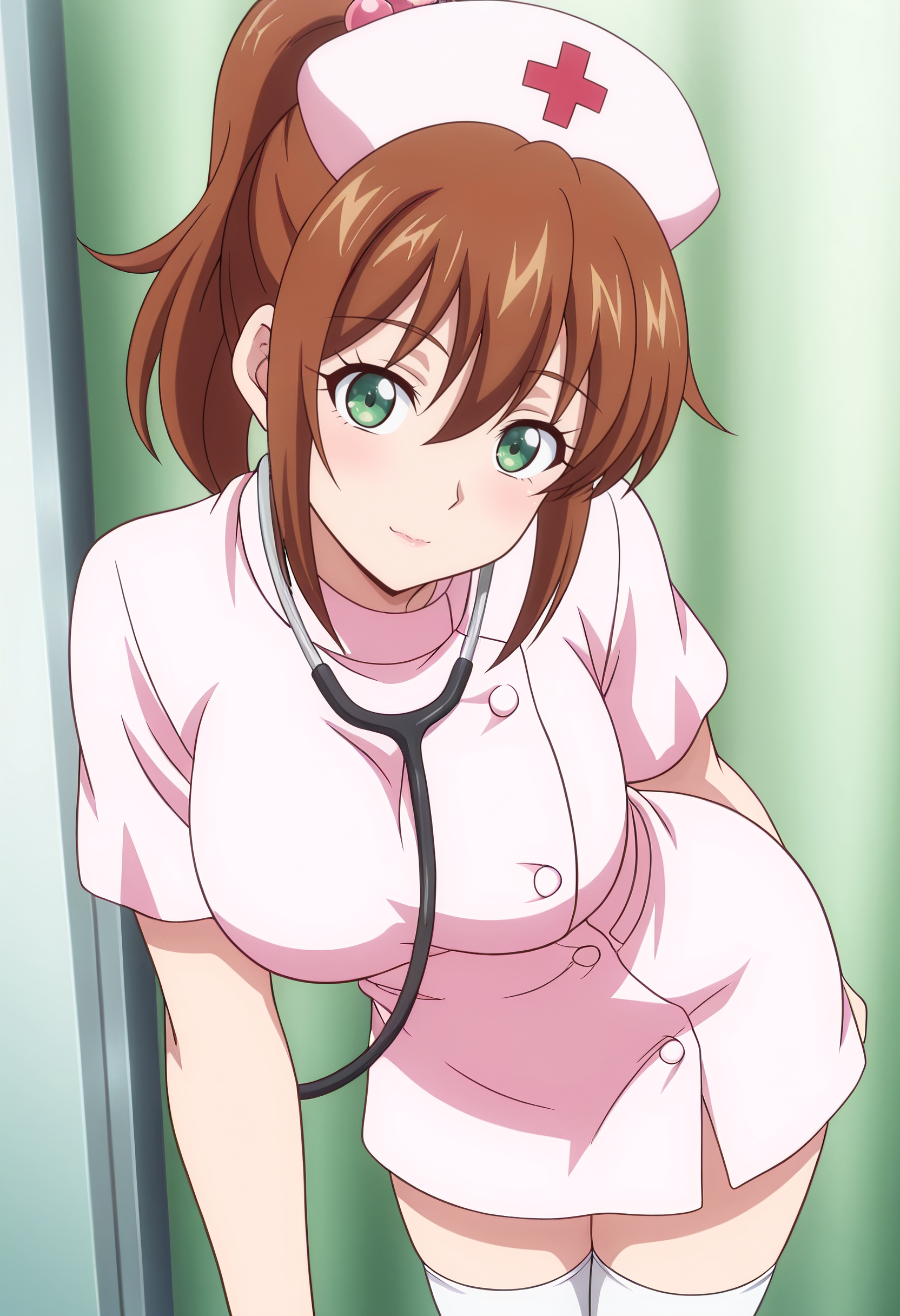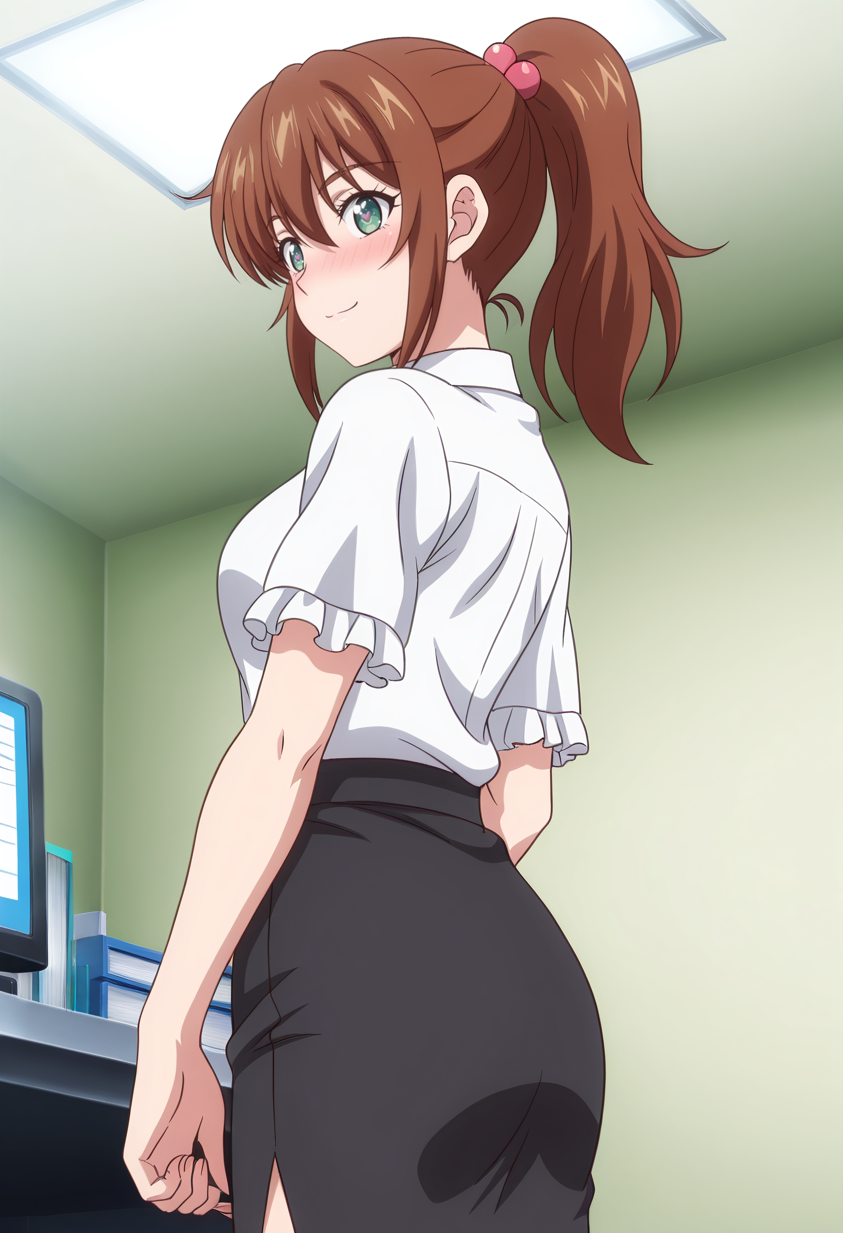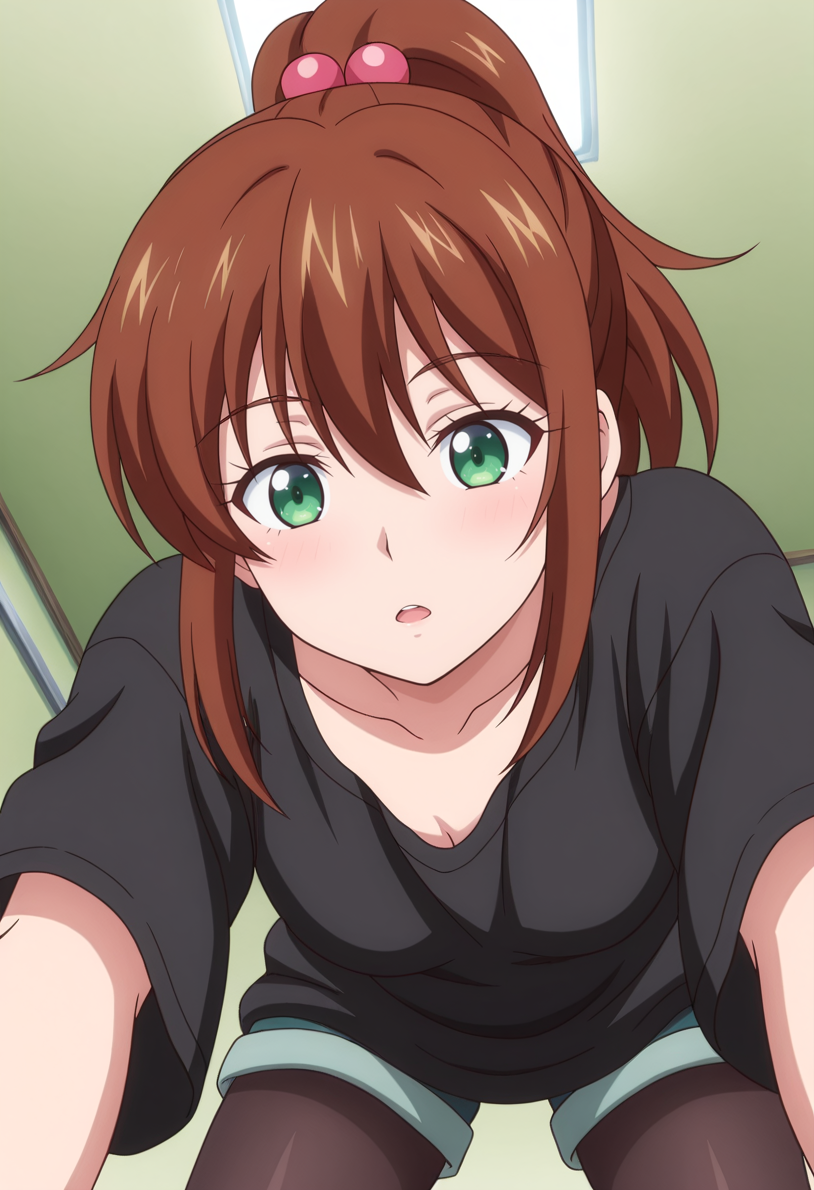 BYNRamenShopOwner、前髪、茶色の髪、緑の目、長い髪、ポニーテール、髪飾り、髪の間から見える眉、目と目の間の髪、横髪、