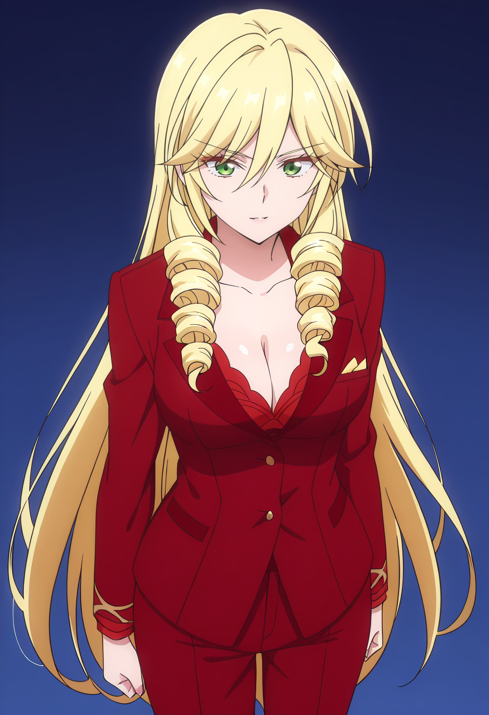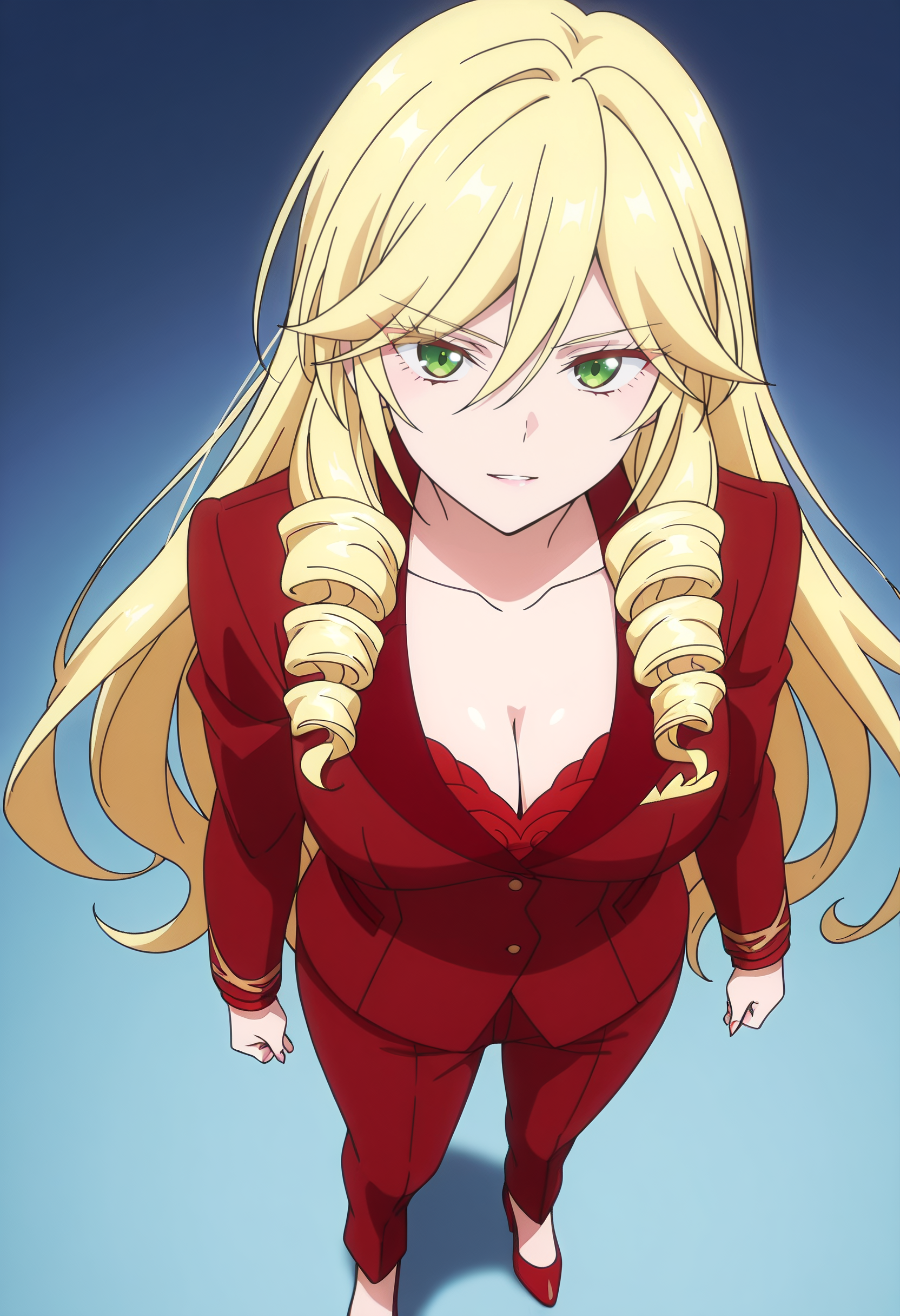 ScarletFormal,卷发,胸部线条,锁骨,夹克,衬衫,正式,西装,长袖,红色夹克,裤子,红裤子,高跟鞋,鞋子,
