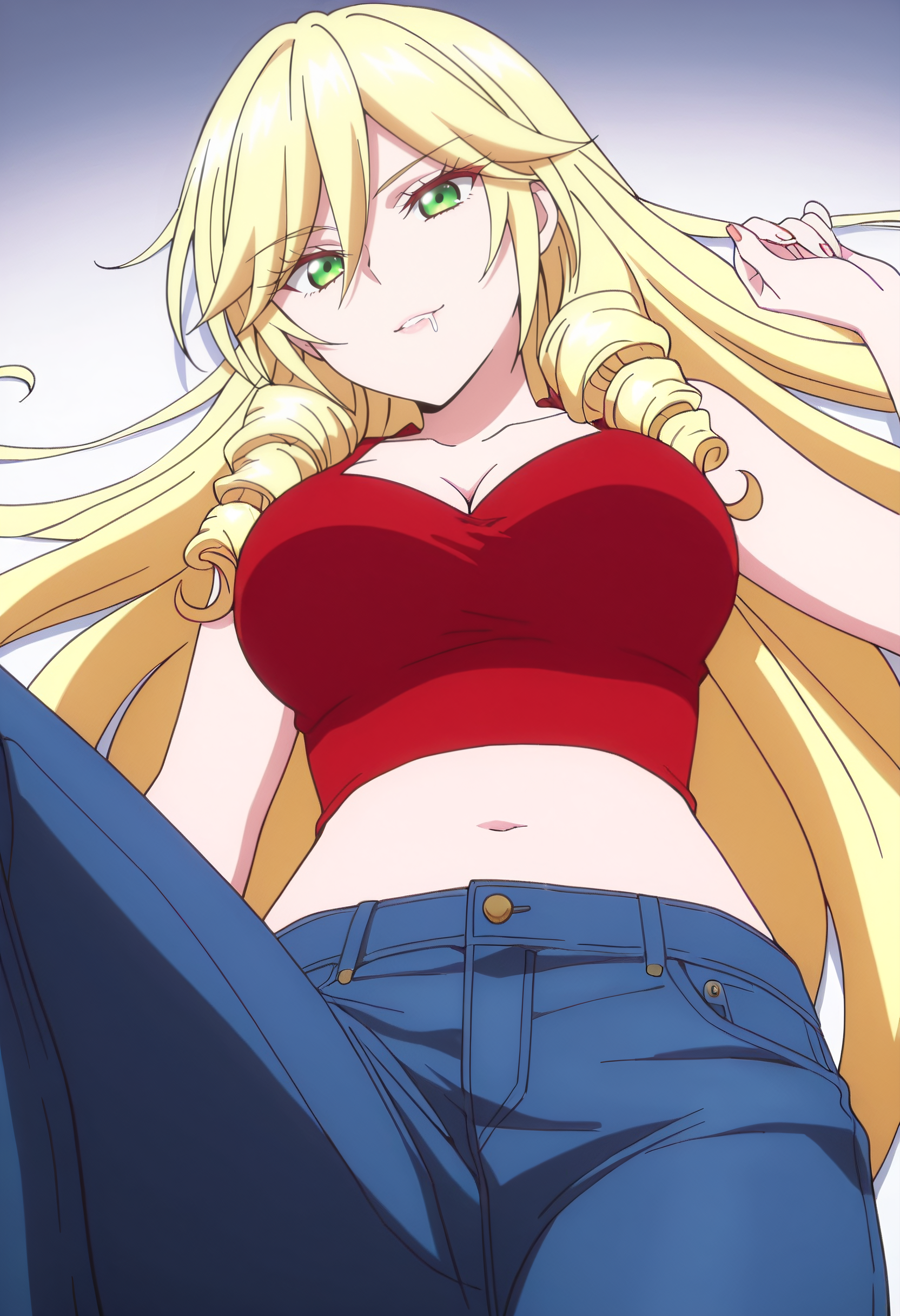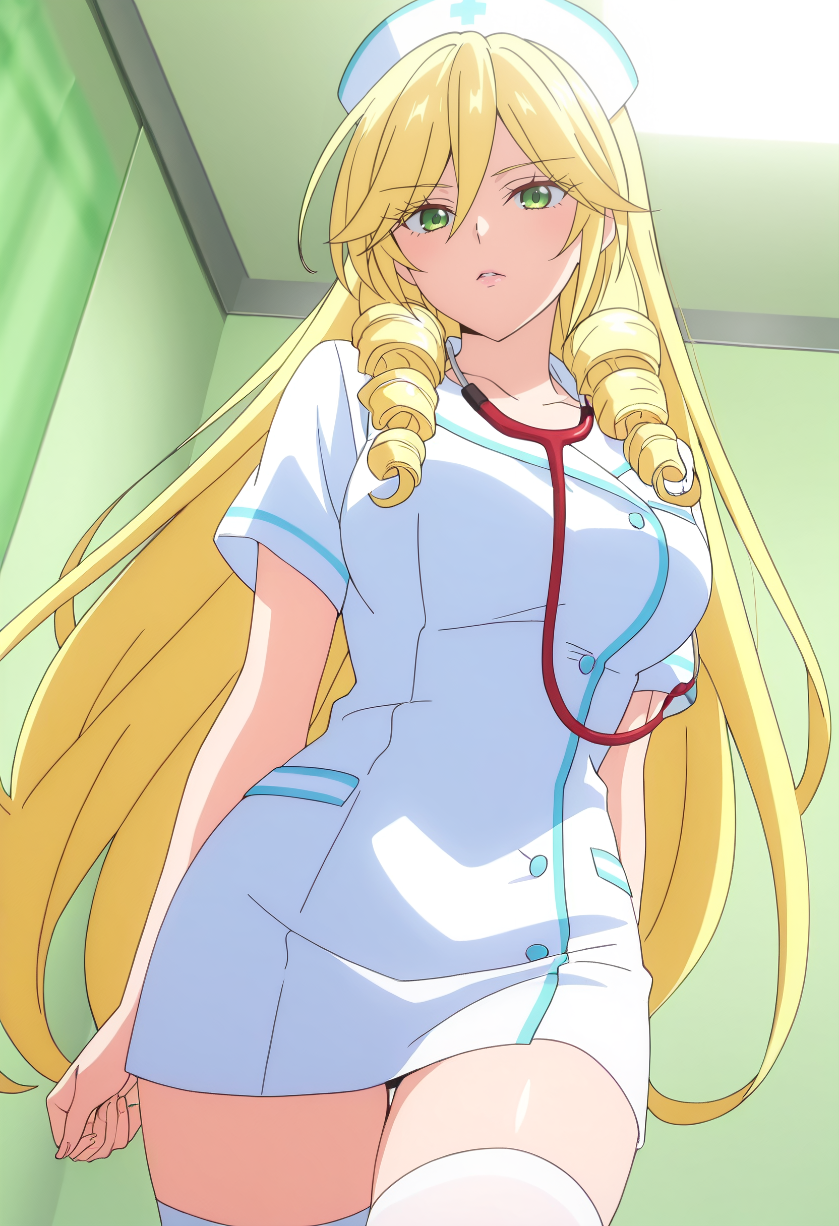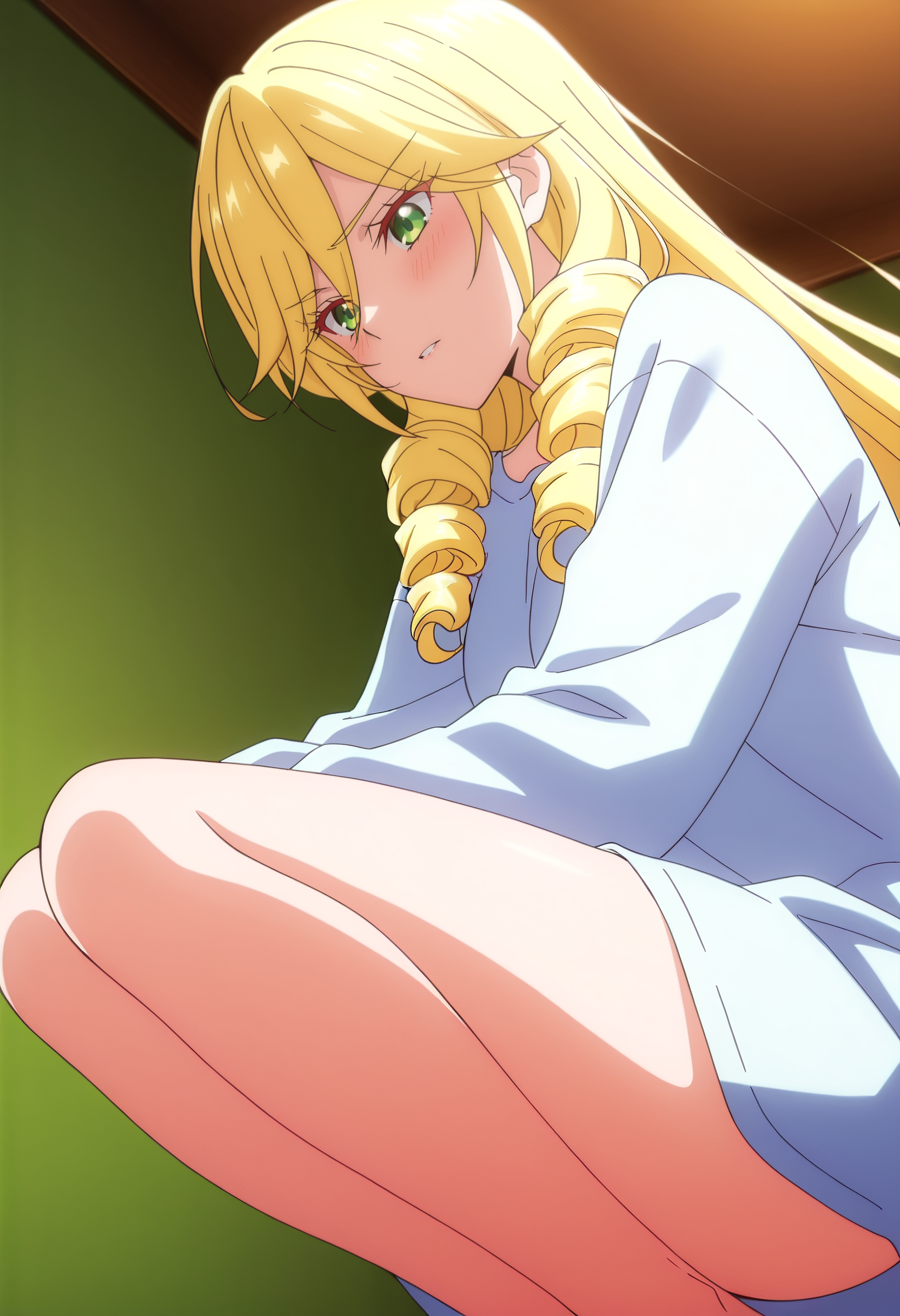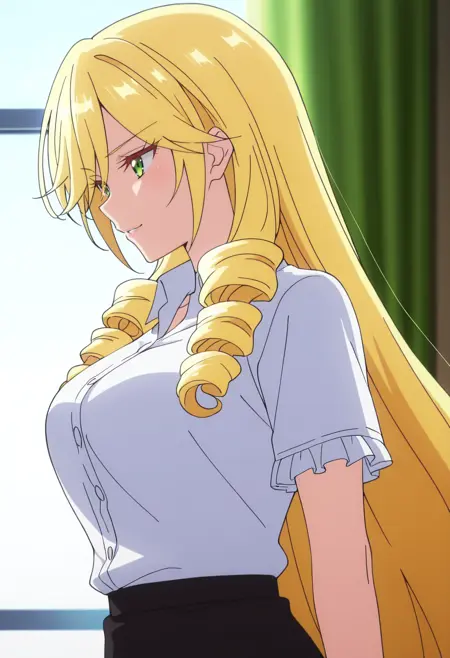 BYNScarlet,金色头发,长发,钻头发型,绿眼睛,非常长的头发,头发遮住眼睛,眉毛透过头发可见,刘海,卷发,双钻头发型,