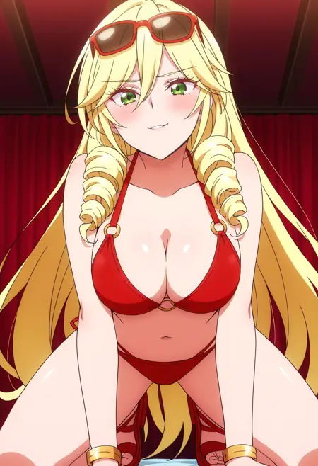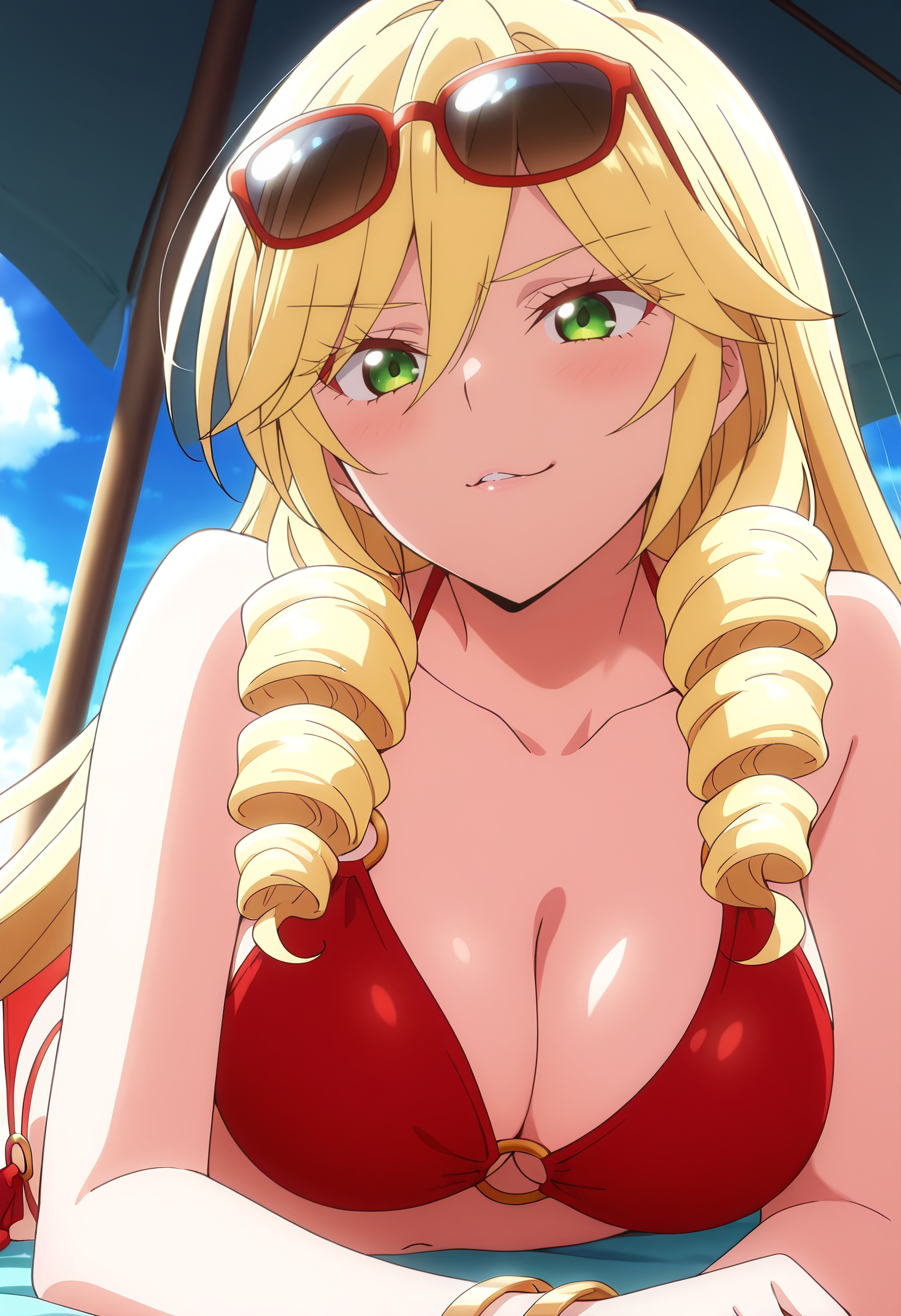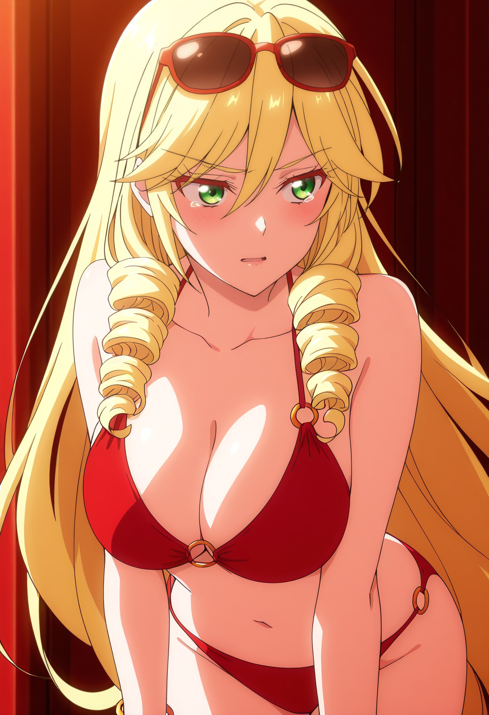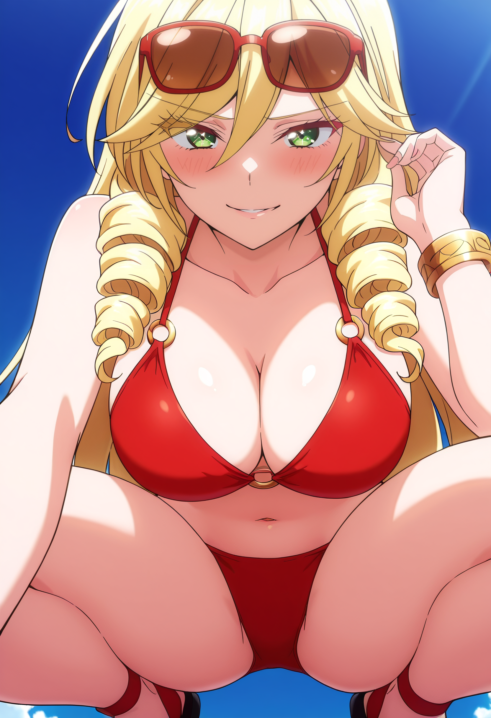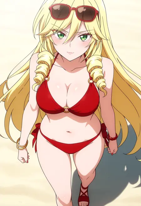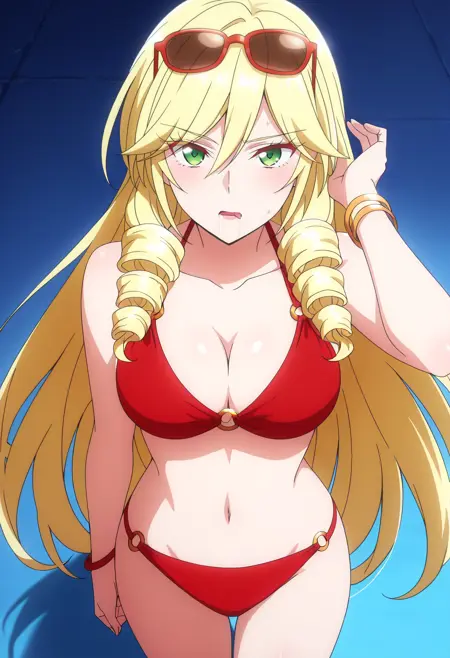 ScarletBikini,比基尼,泳装,红色比基尼,肚脐,乳房,O型环,胸部线条,O型环比基尼,O型环上衣,珠宝,手镯,凉鞋,太阳镜,眼镜戴在头上,锁骨,