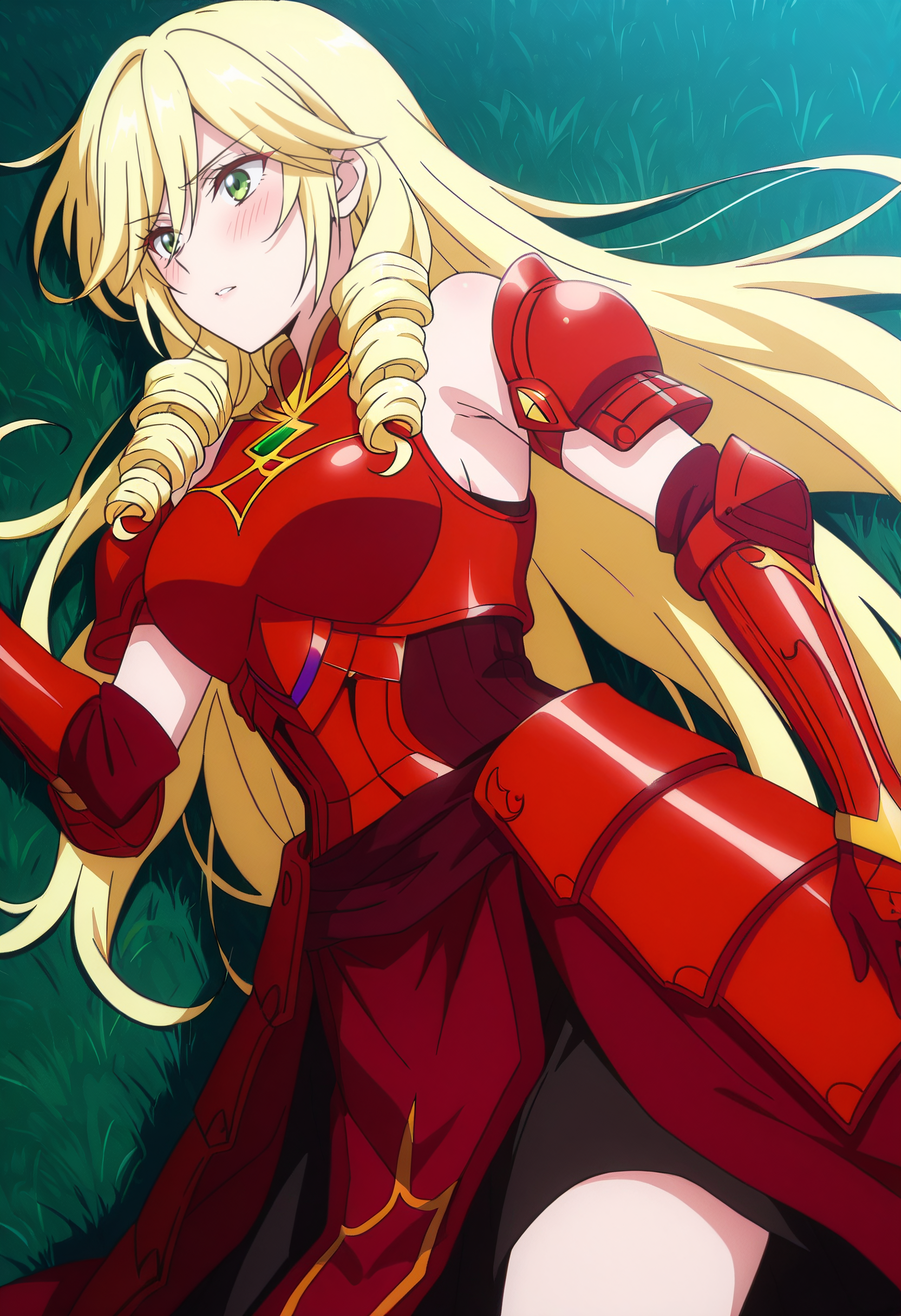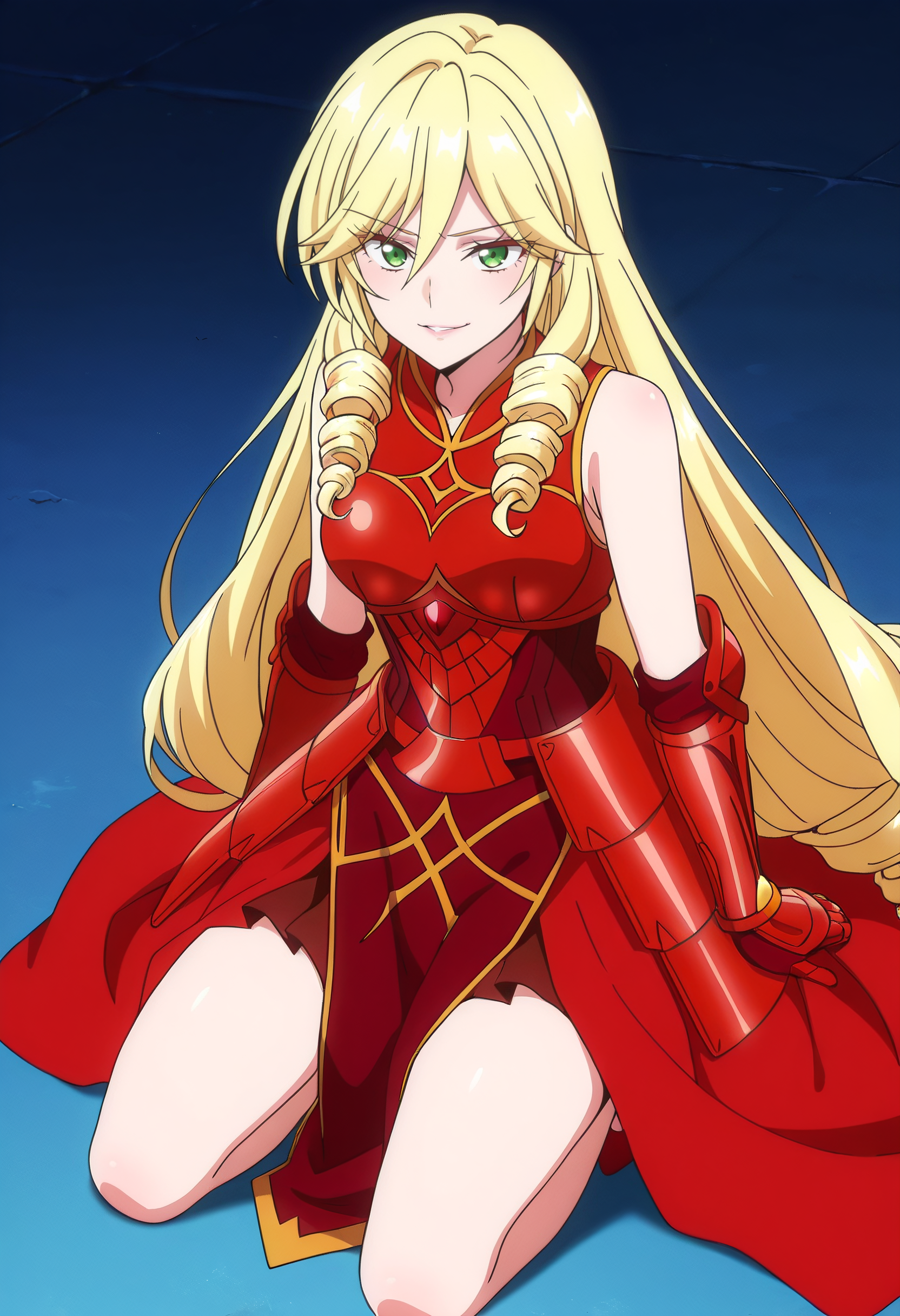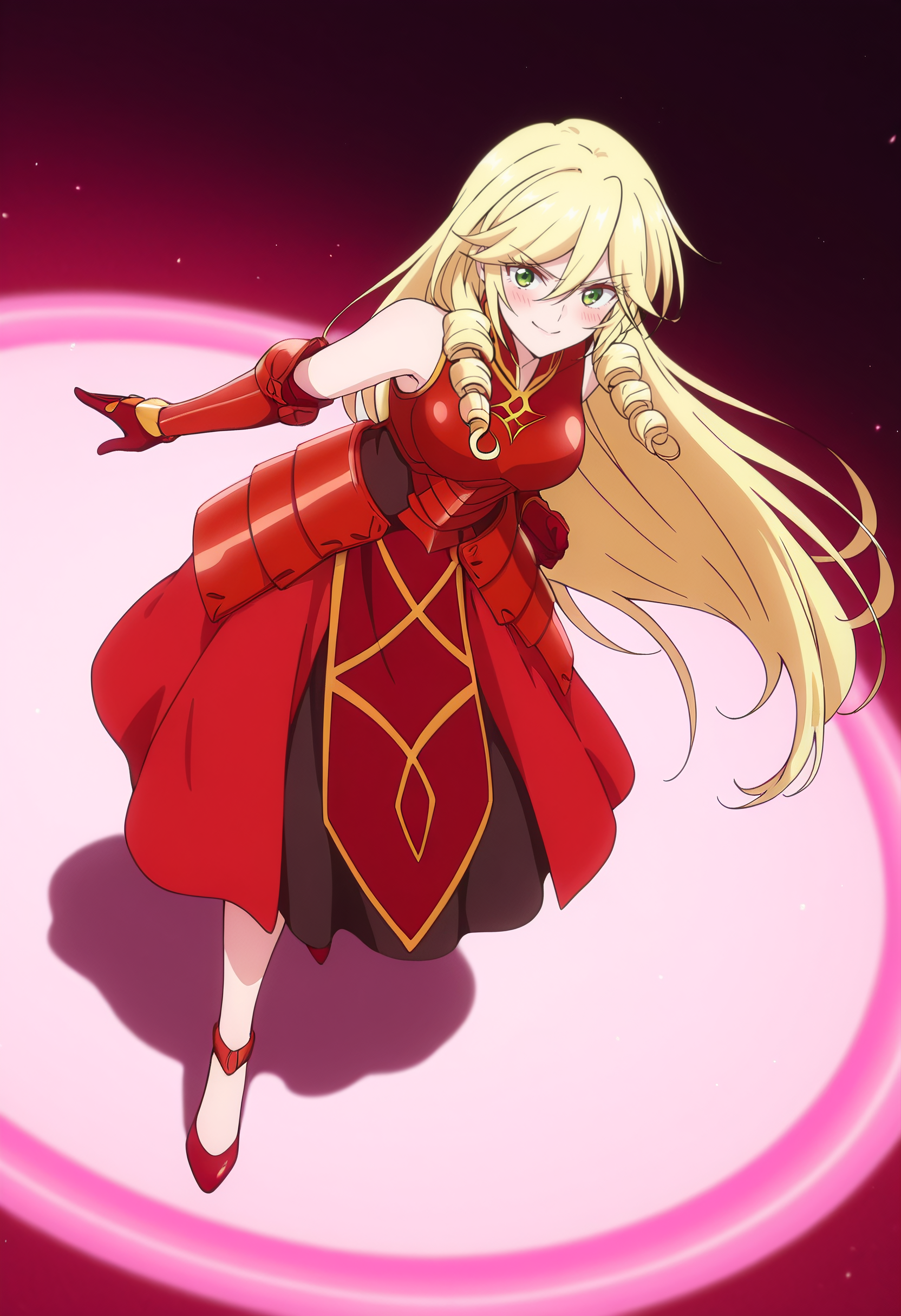 ScarletDress,连衣裙,无袖,红色连衣裙,露肩,卷发,手套,无袖连衣裙,裙子,红色鞋履,鞋子,高跟鞋,肘部手套,锁骨,盔甲,盔甲连衣裙,胸甲,