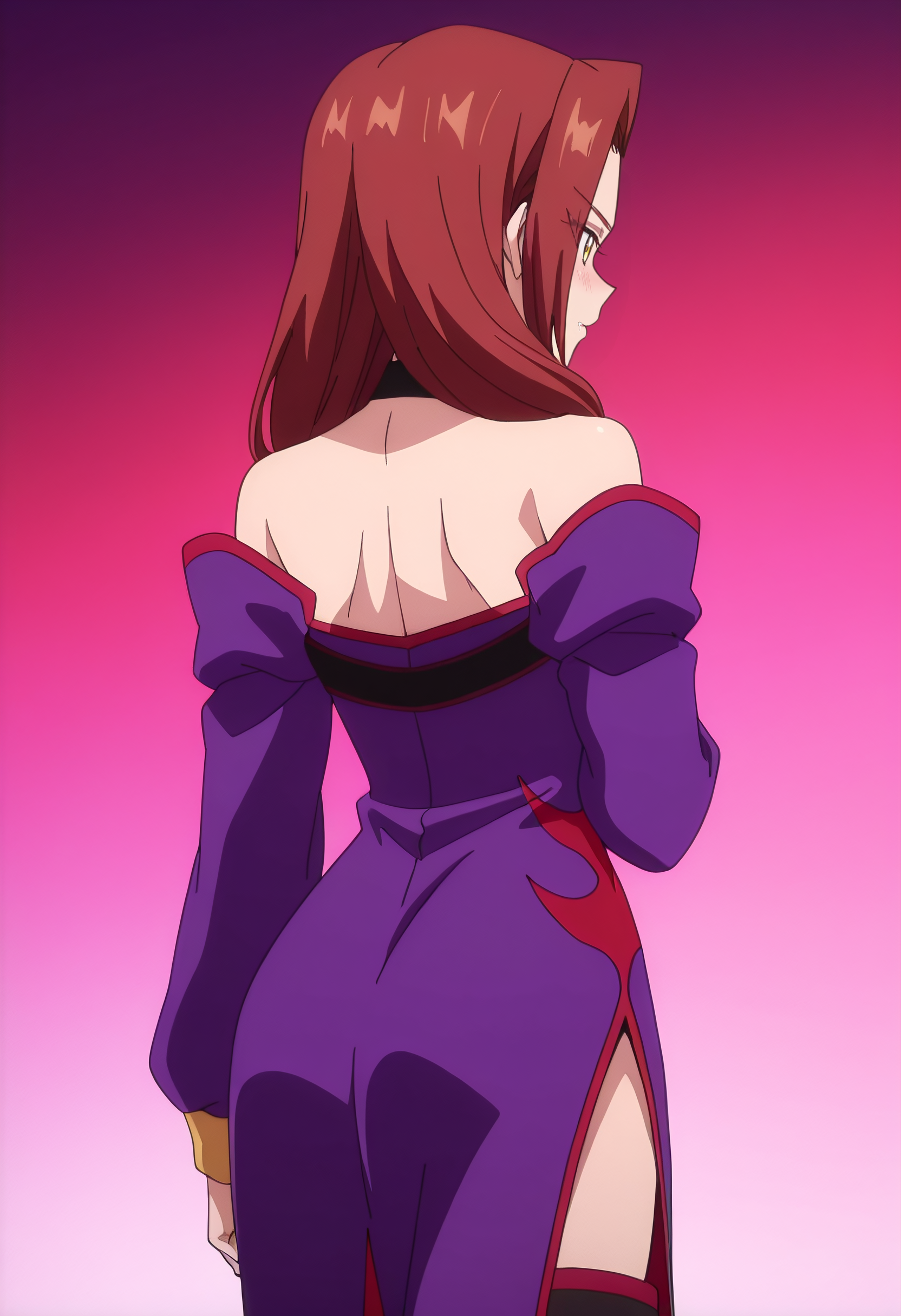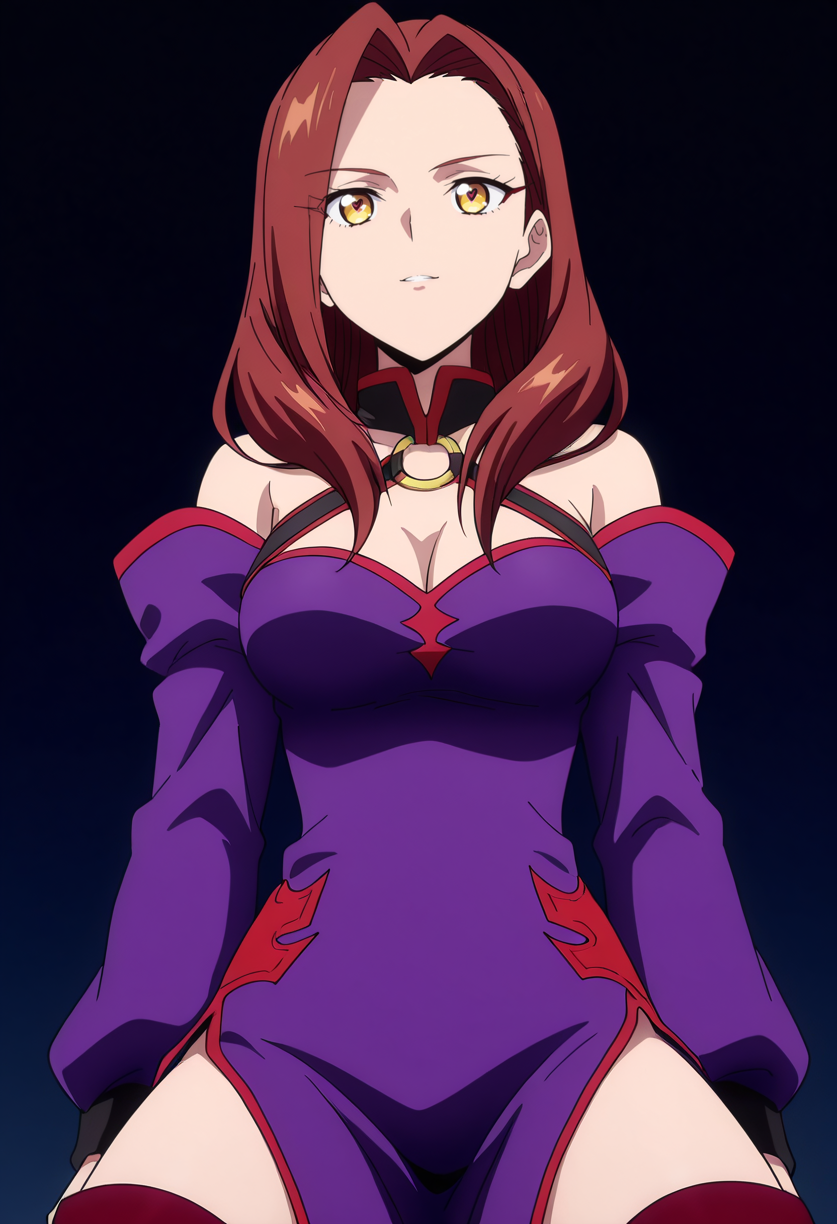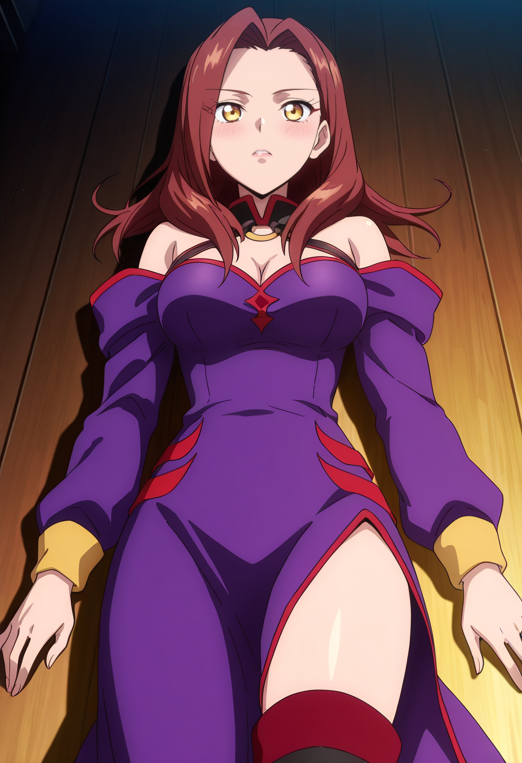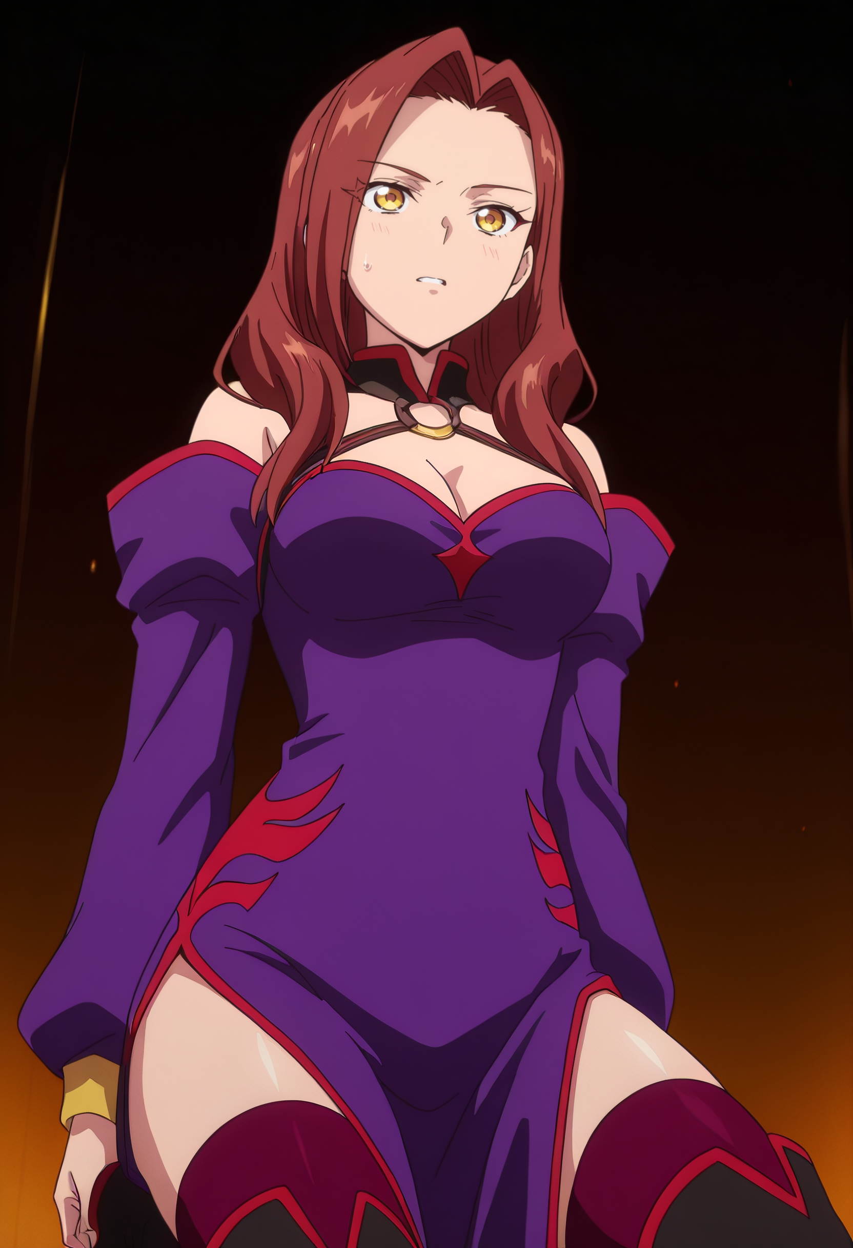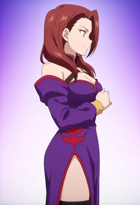 어깨 노출, 가슴 노출, 드레스, 분리된 소매, 보라색 드레스, 긴 소매, 어깨 드리운 드레스, 보라색 소매, 보석, 초커, 어깨 드리운 드레스, 그라데이션, 허벅지까지 긴 양말, 부츠,