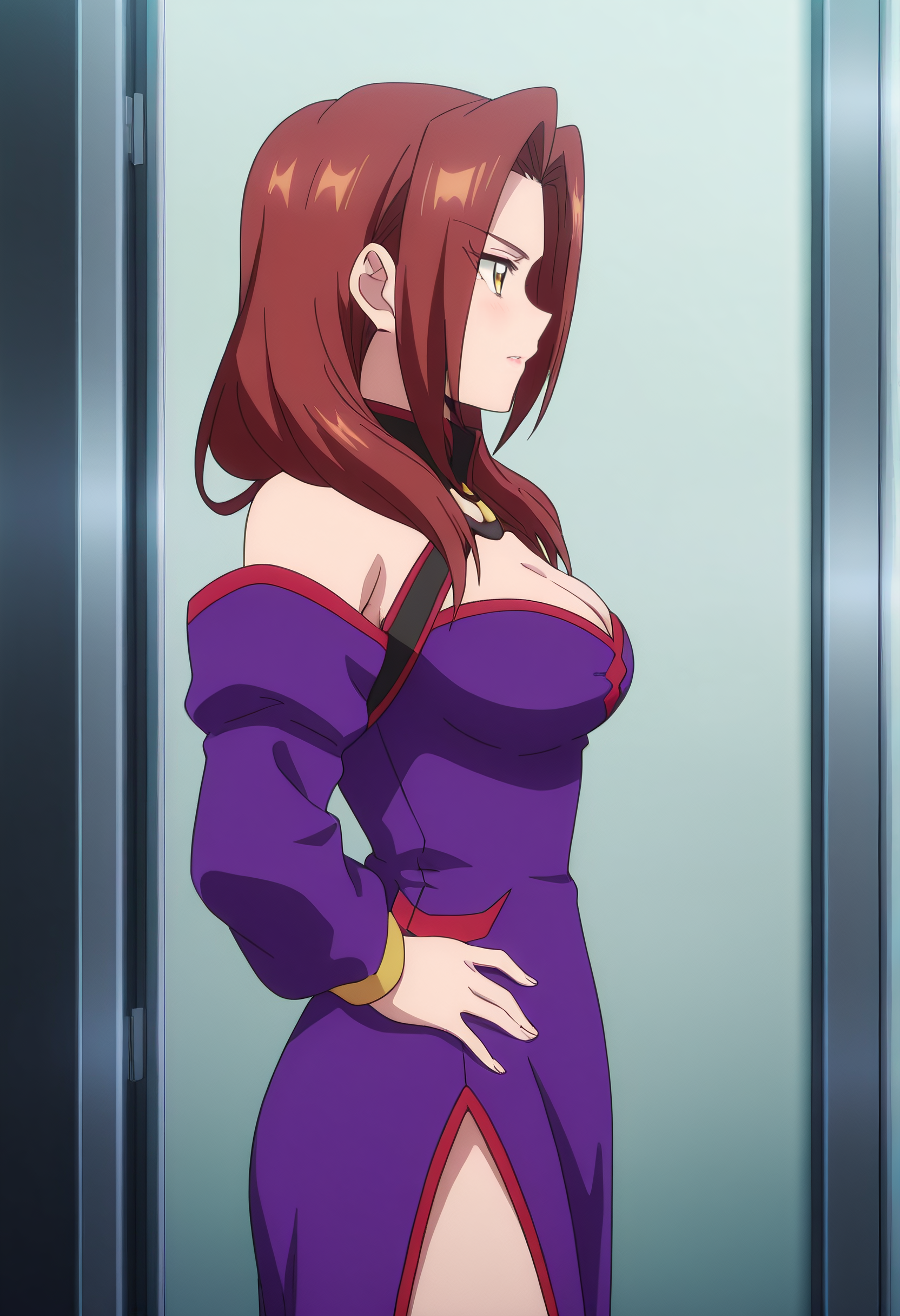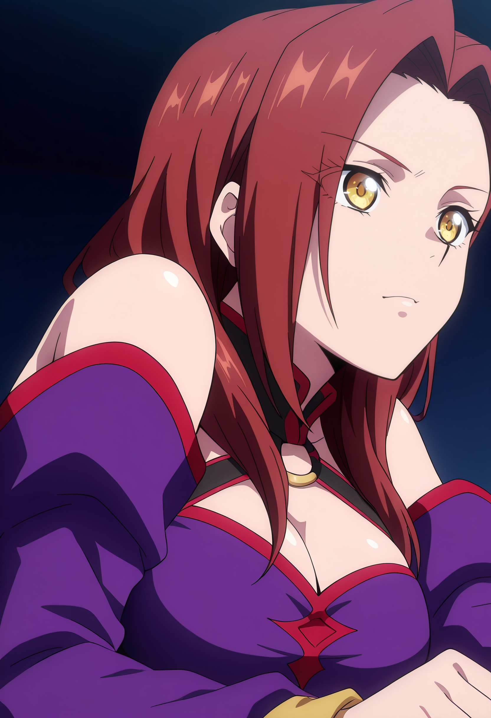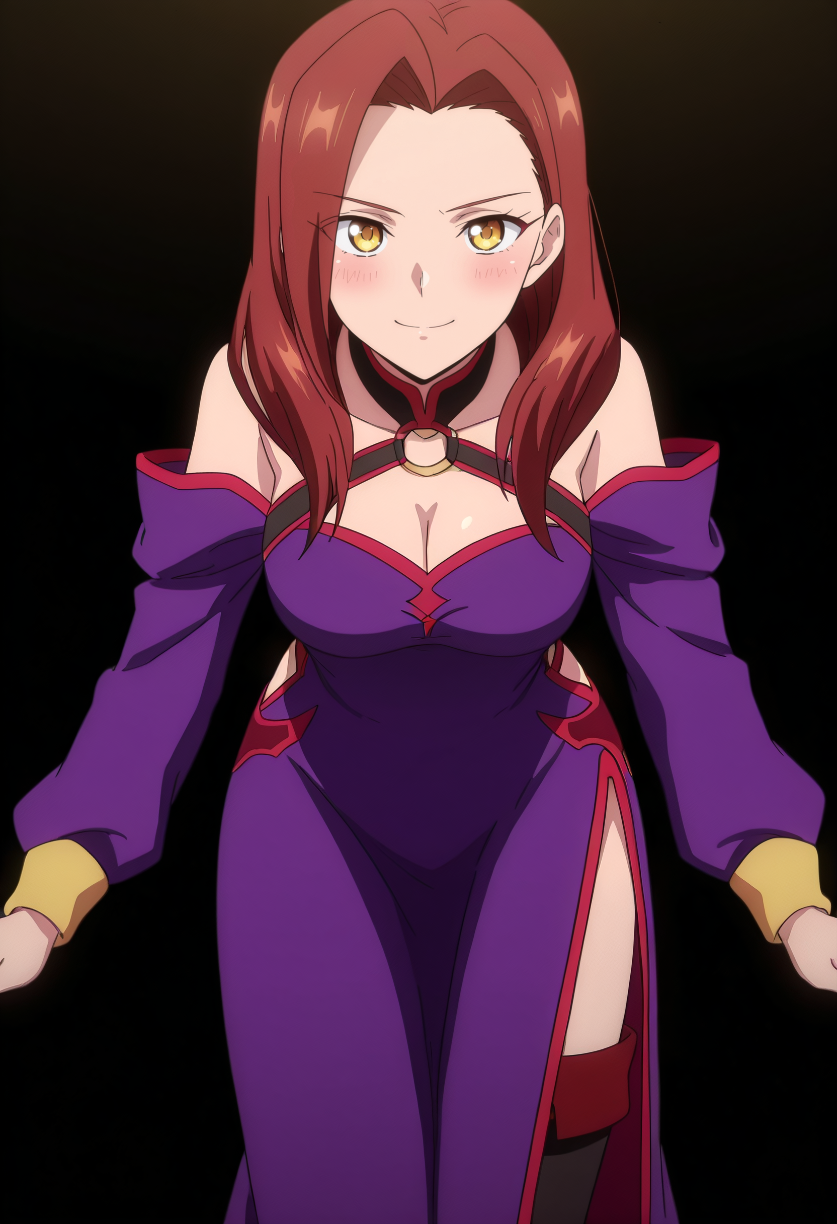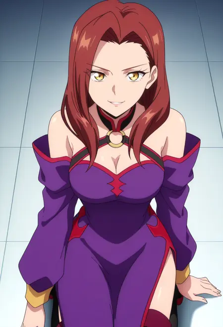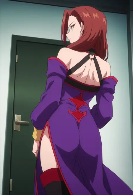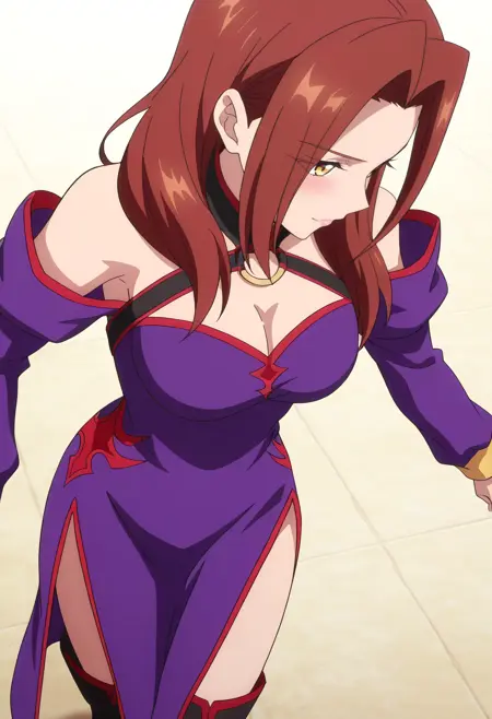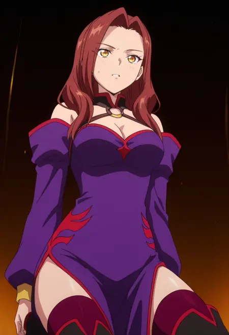 어깨 노출, 가슴 노출, 드레스, 분리된 소매, 보라색 드레스, 긴 소매, 어깨 드리운 드레스, 보라색 소매, 보석, 초커, 어깨 드리운 드레스, 그라데이션, 허벅지까지 긴 양말, 부츠,