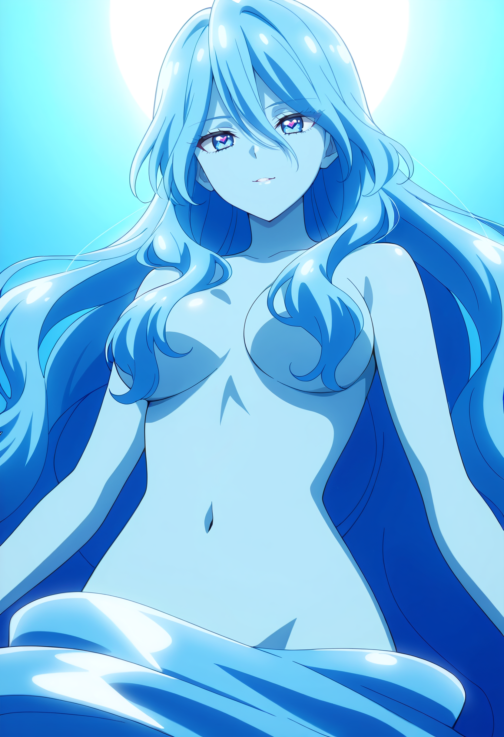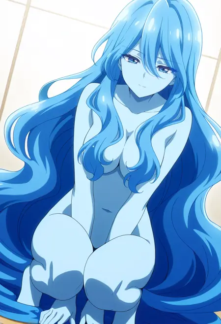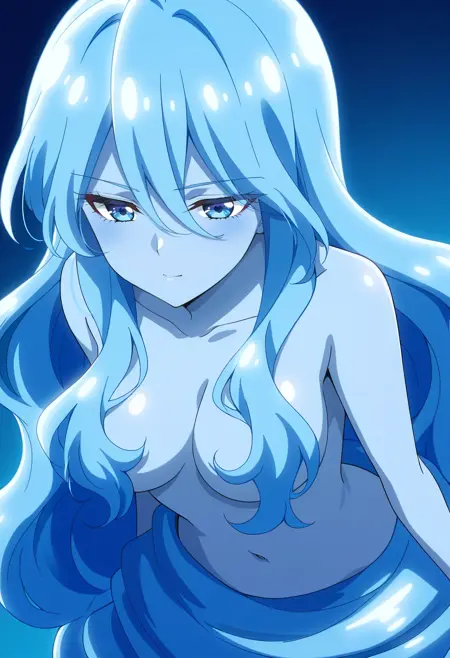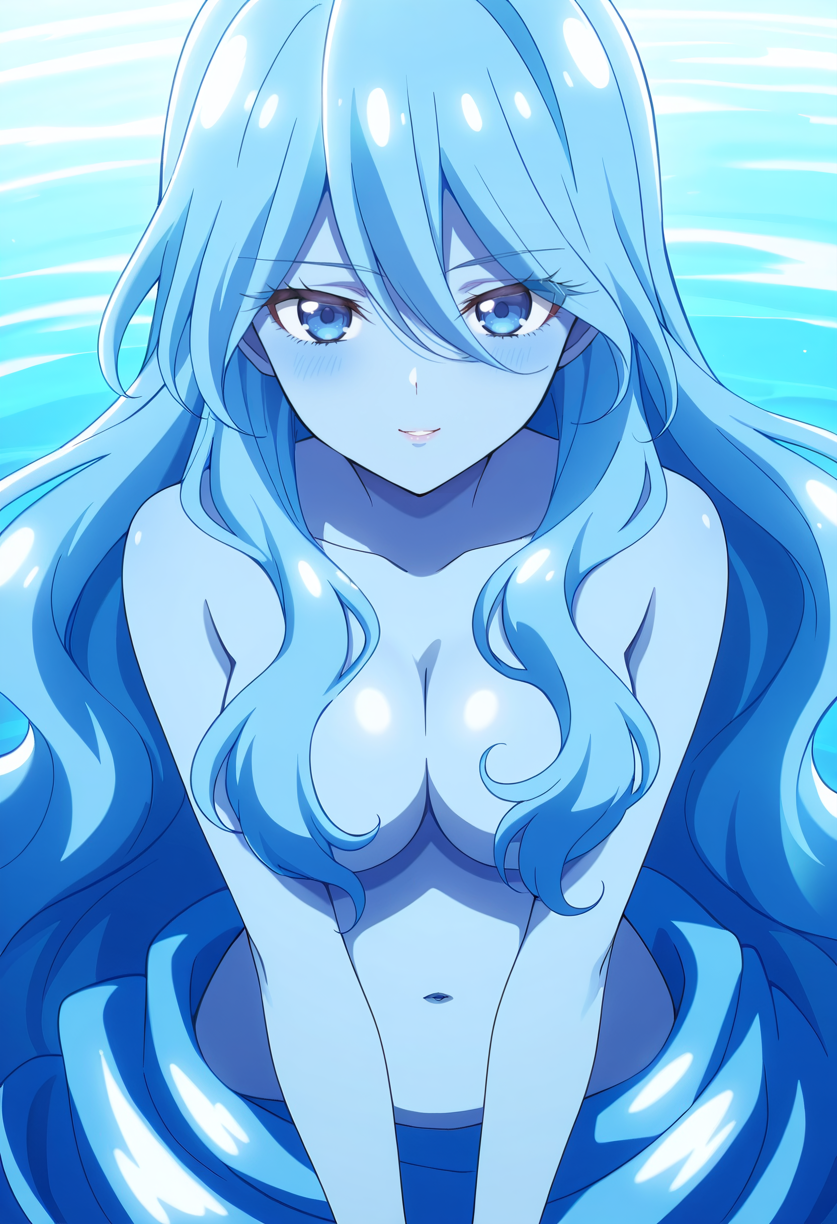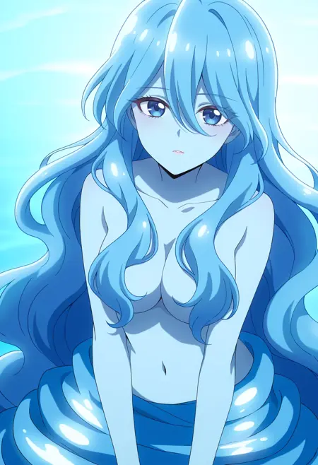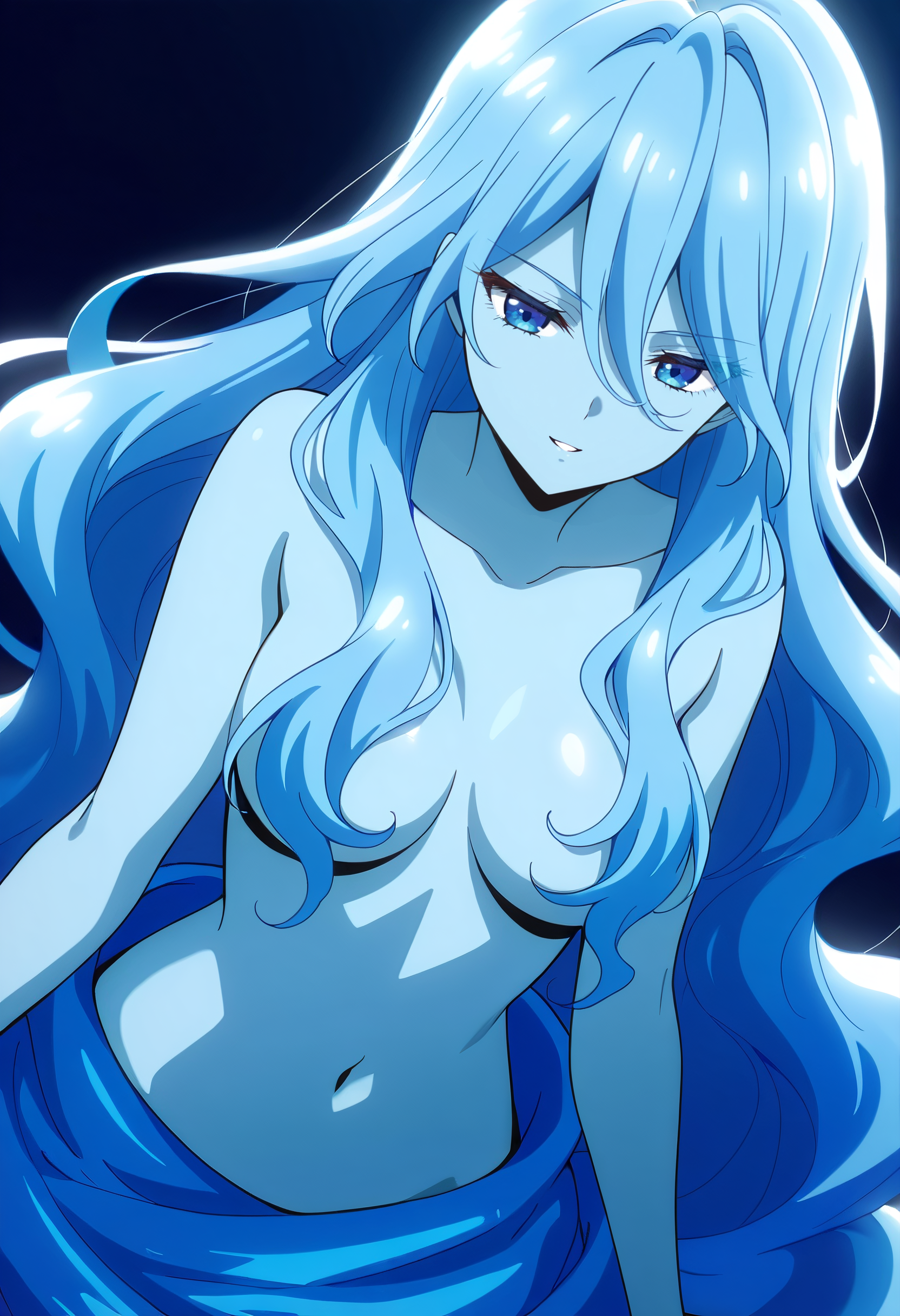 BYNZero,蓝发,长发,极长发,刘海,头发遮住眼睛,头发下可见眉毛,头发遮挡,头发覆盖胸部,波浪发,裸体,乳房,彩色皮肤,锁骨,裸露肩膀,蓝色皮肤,史莱姆女孩,肚脐,怪物女孩,