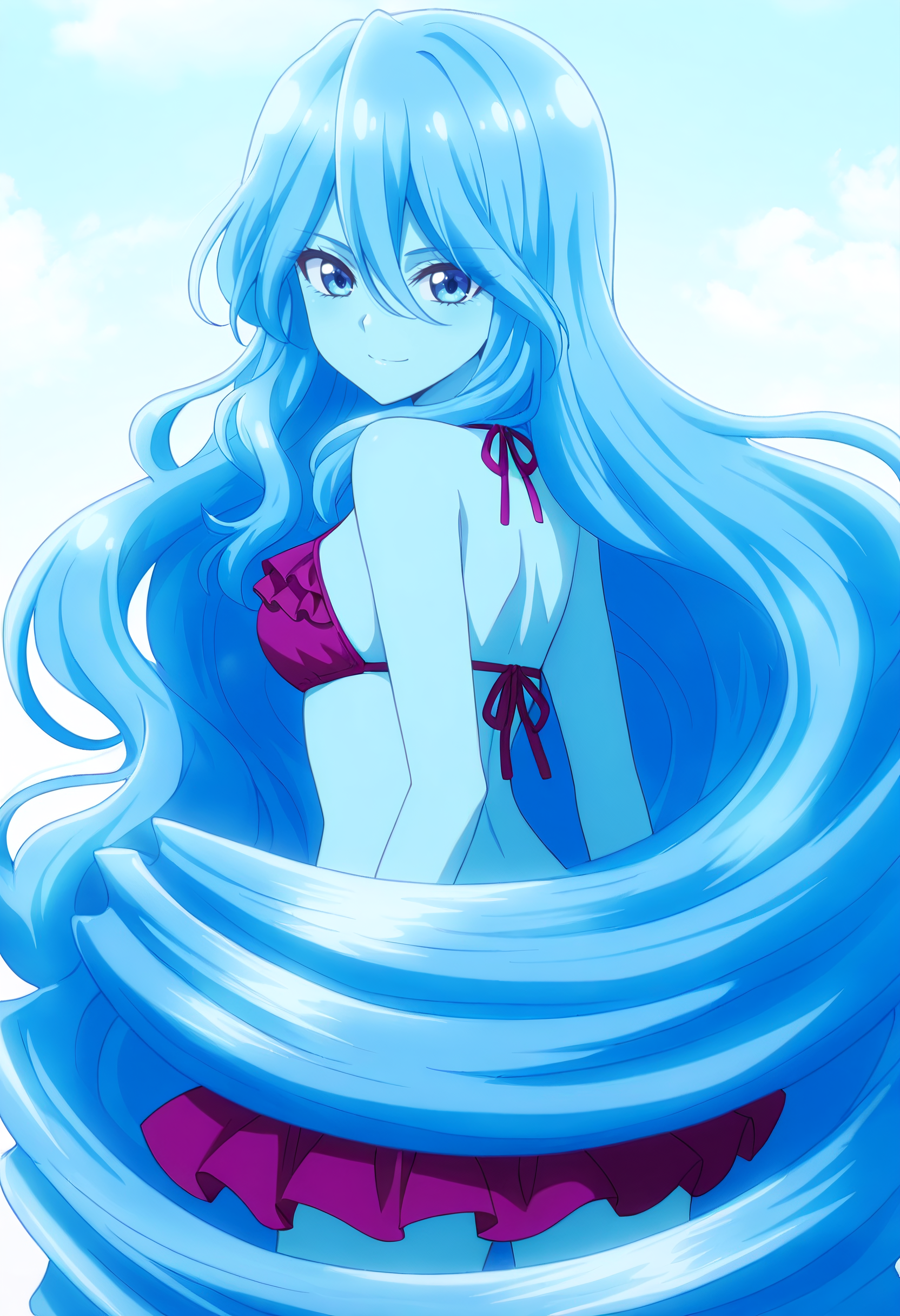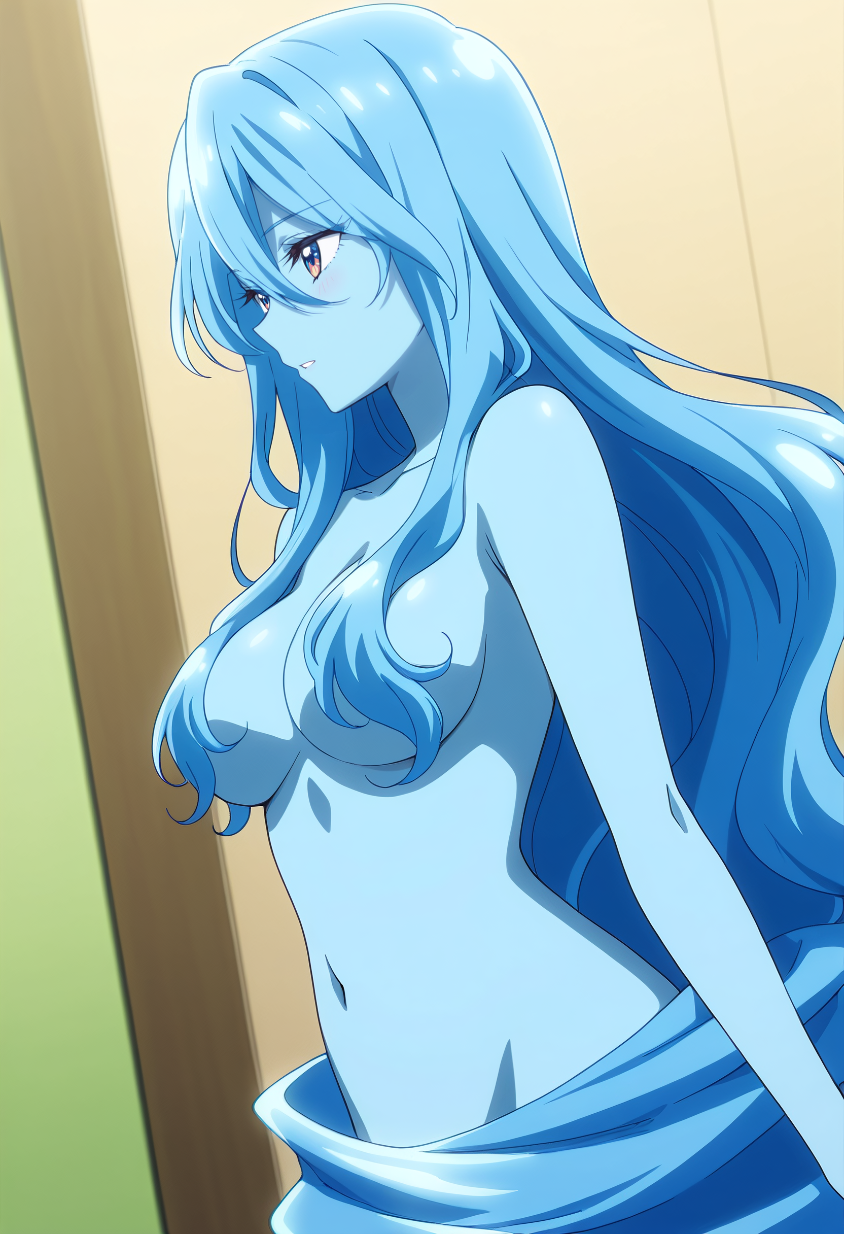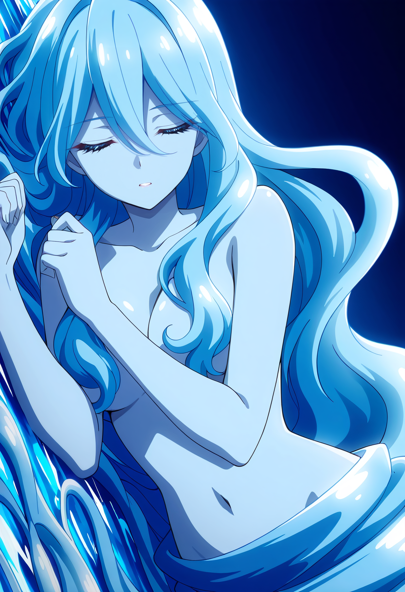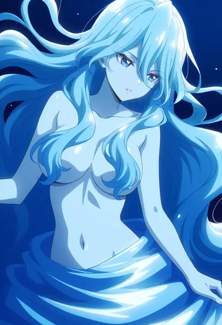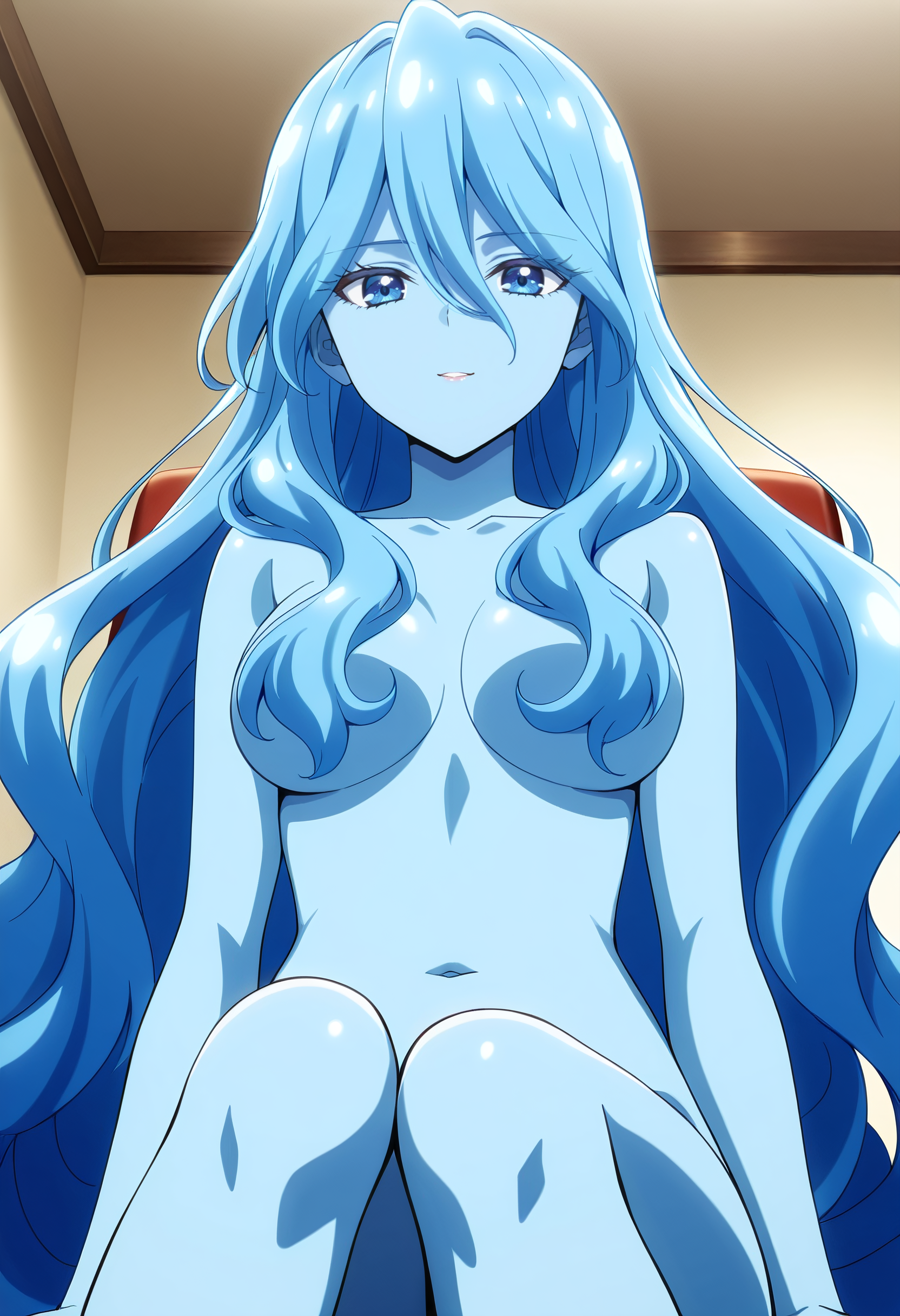 BYNZero,蓝发,长发,极长发,刘海,头发遮住眼睛,头发下可见眉毛,头发遮挡,头发覆盖胸部,波浪发,裸体,乳房,彩色皮肤,锁骨,裸露肩膀,蓝色皮肤,史莱姆女孩,肚脐,怪物女孩,