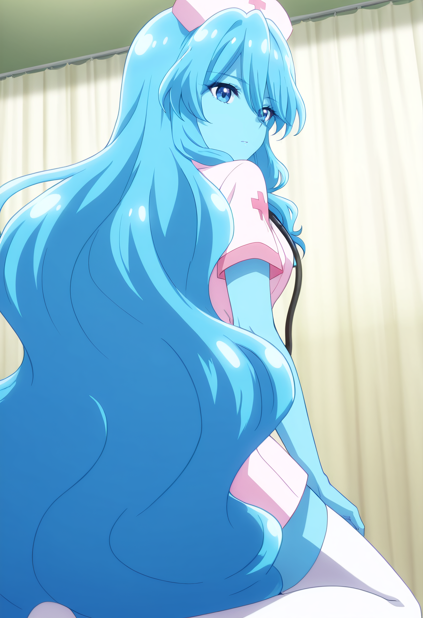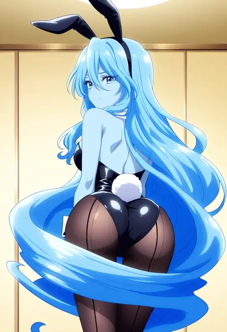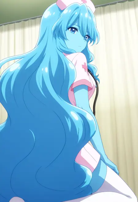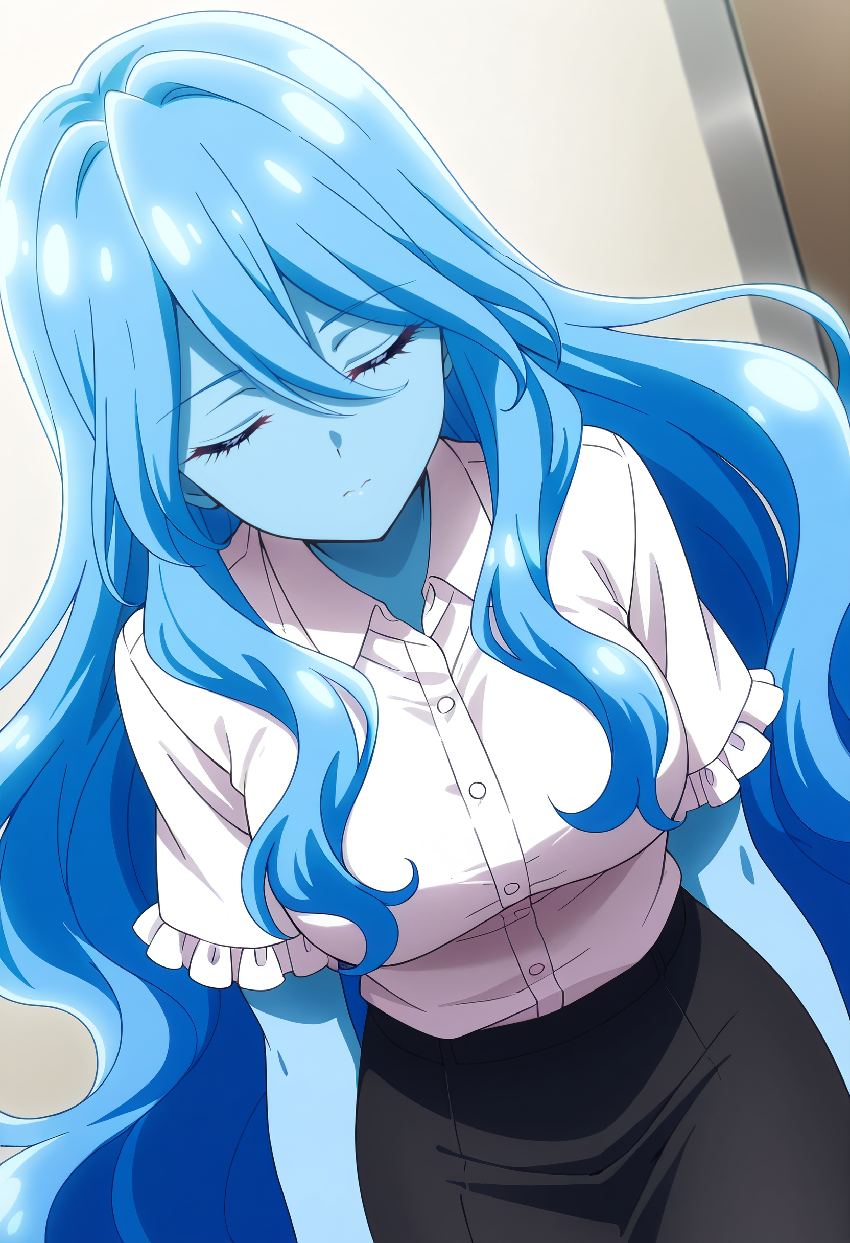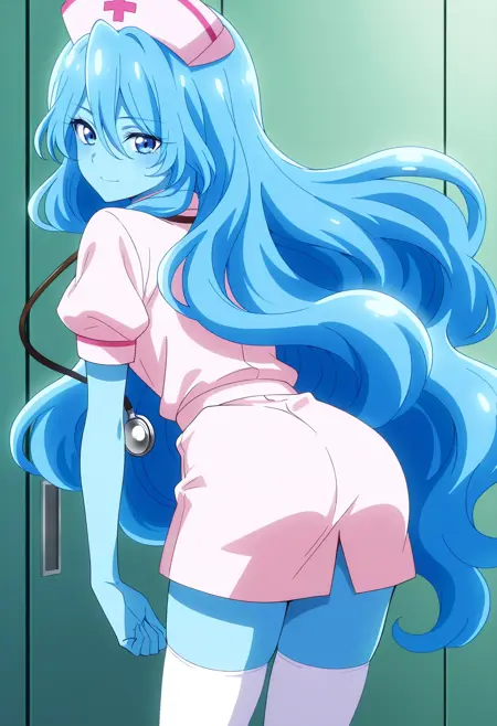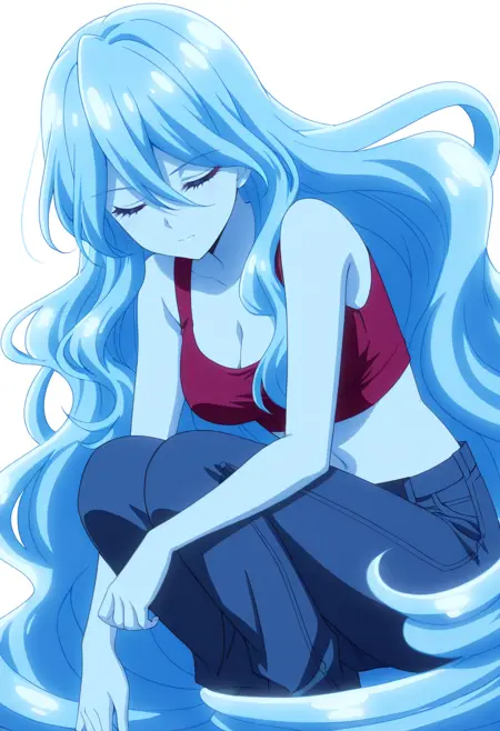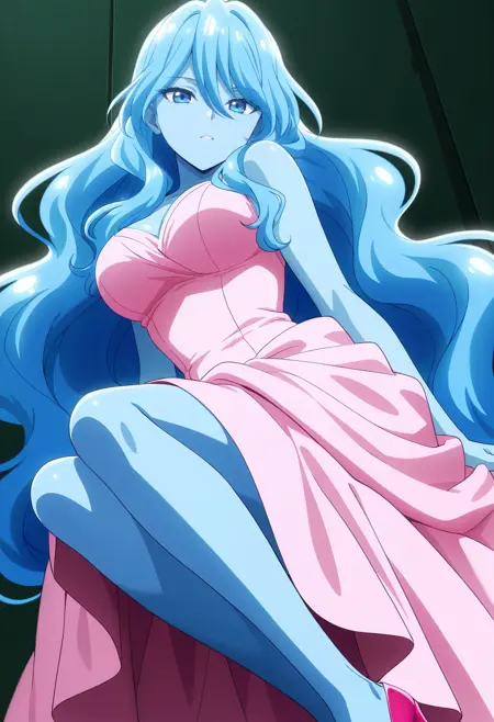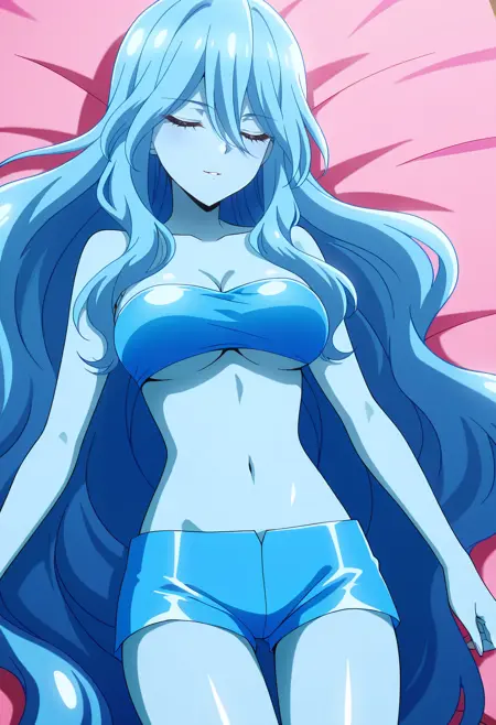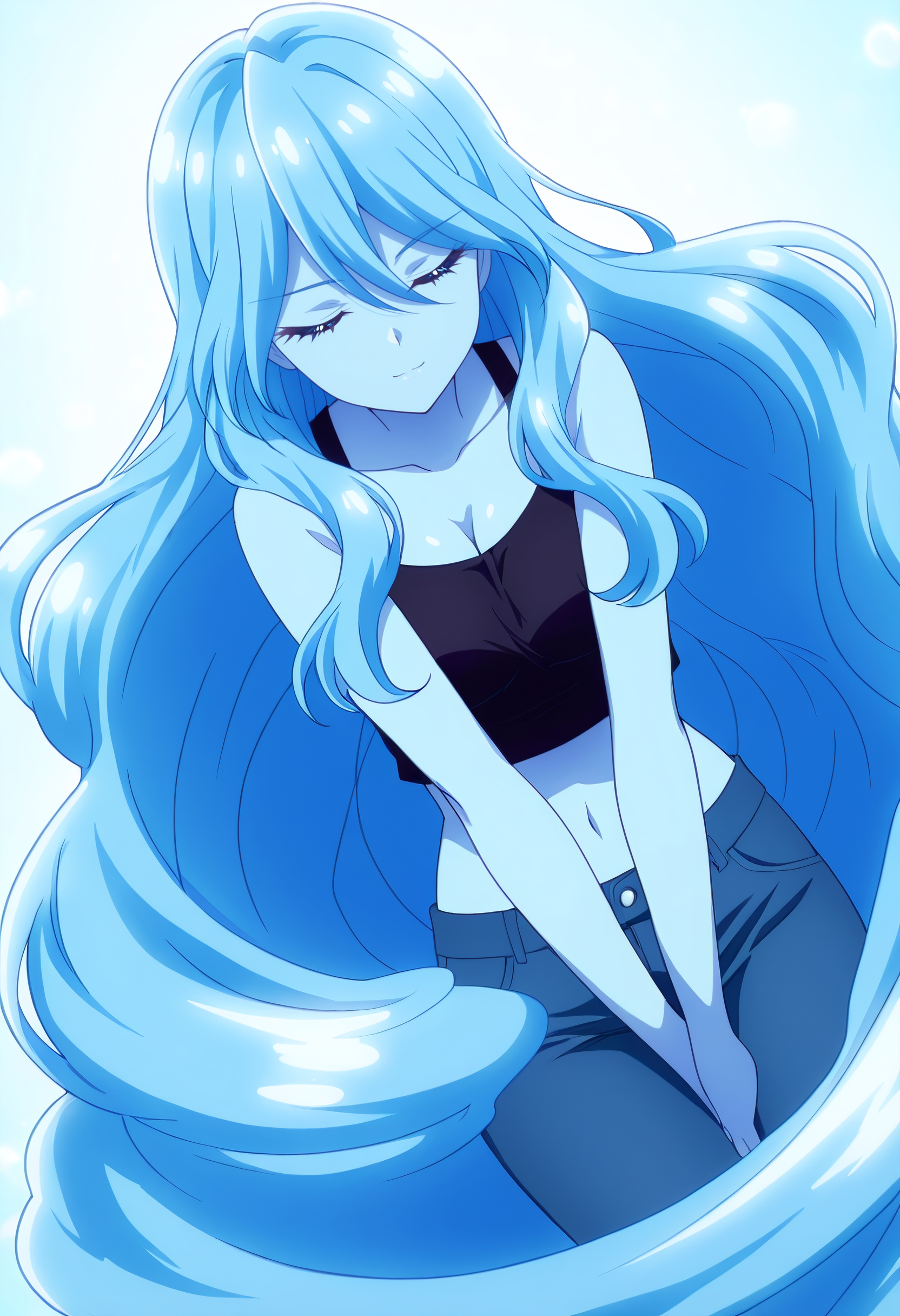 BYNZero,蓝发,长发,极长发,刘海,头发遮住眼睛,头发下可见眉毛,头发遮挡,头发覆盖胸部,波浪发,裸体,乳房,彩色皮肤,锁骨,裸露肩膀,蓝色皮肤,史莱姆女孩,肚脐,怪物女孩,