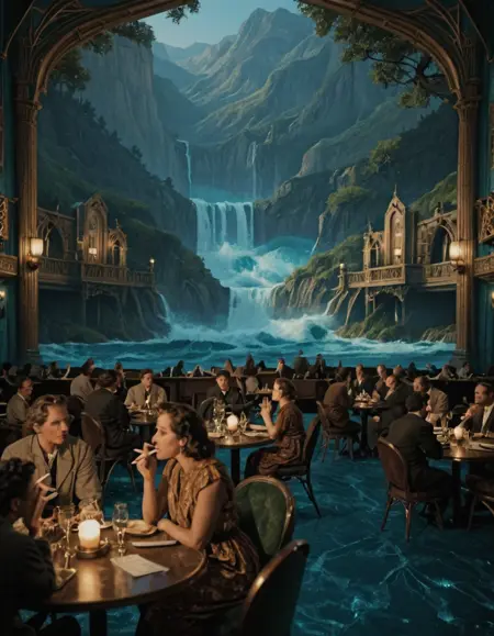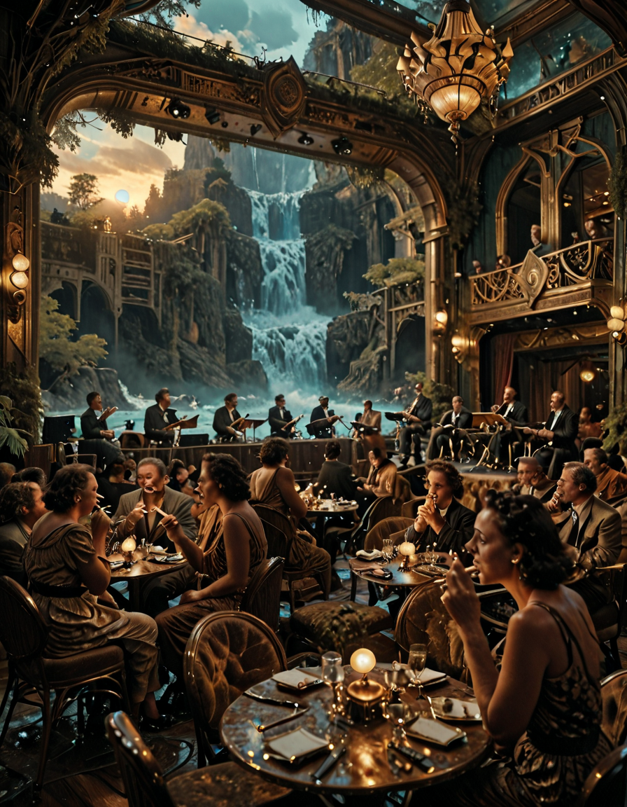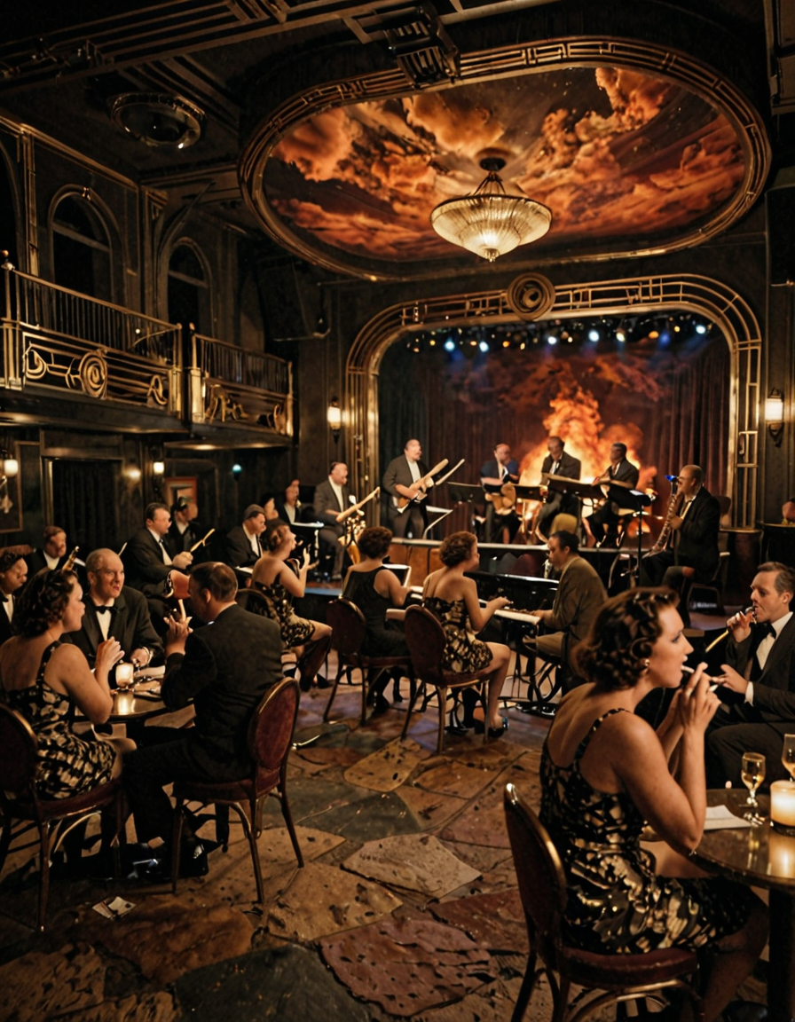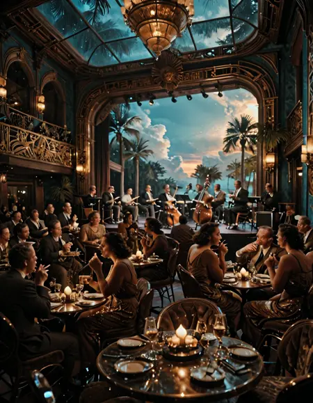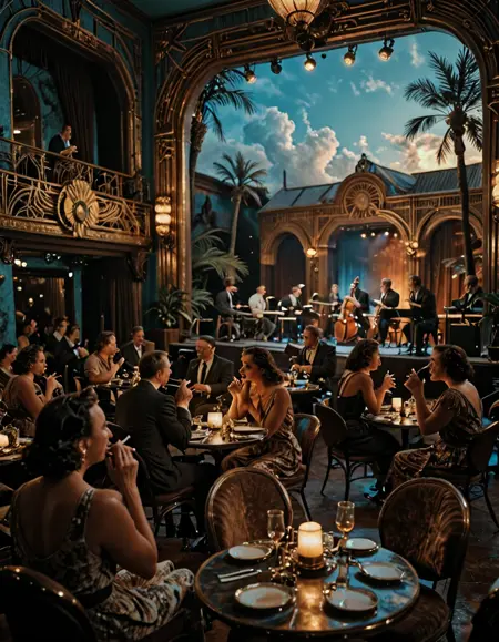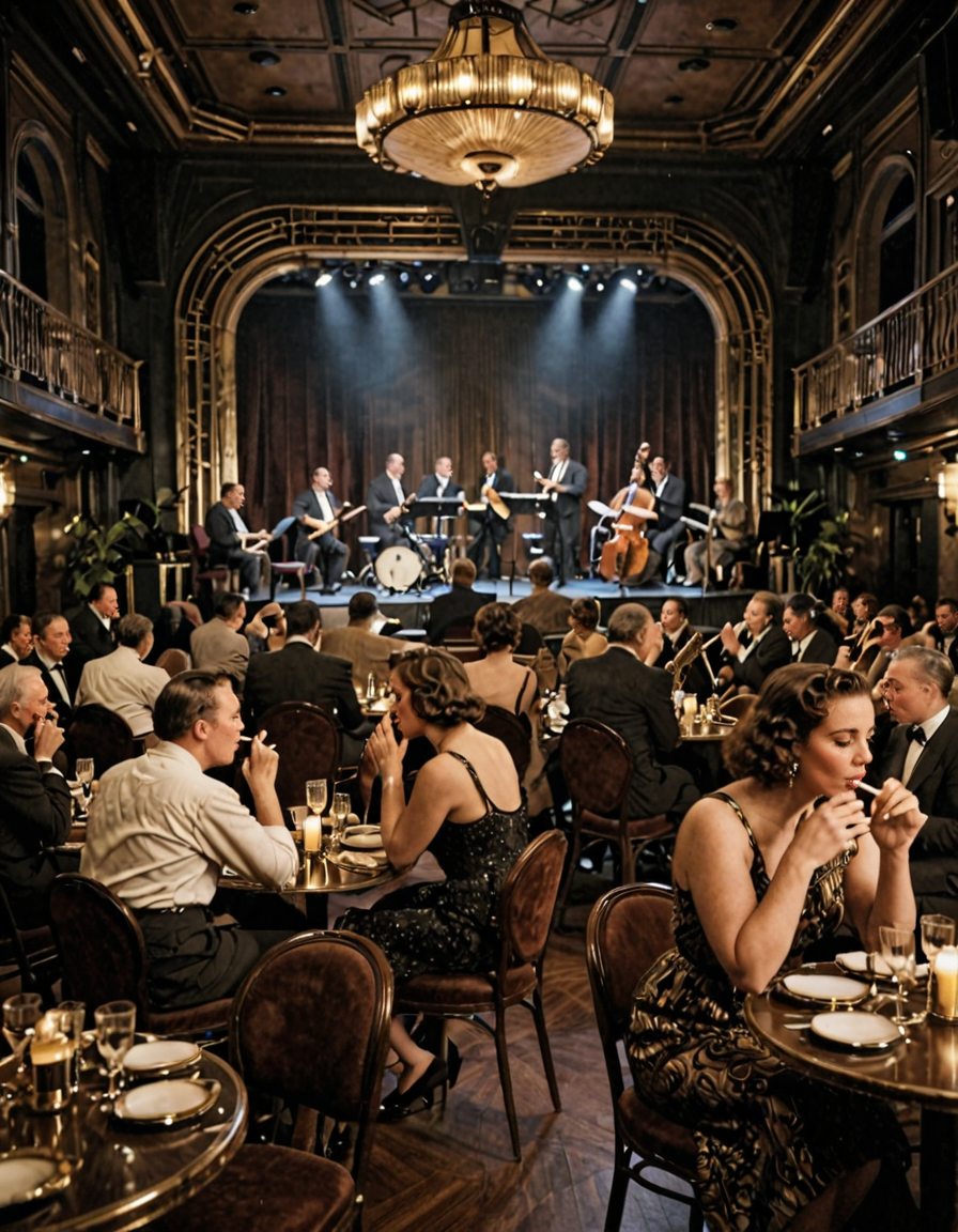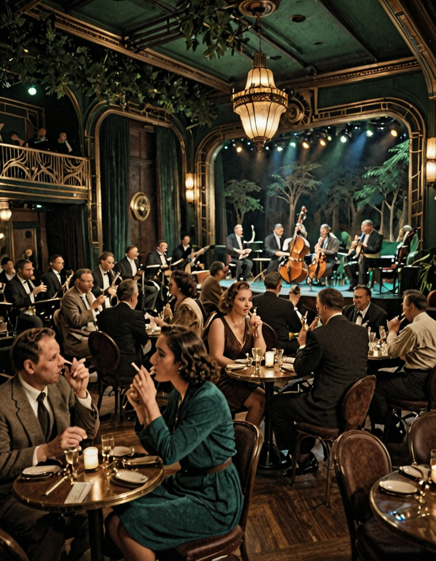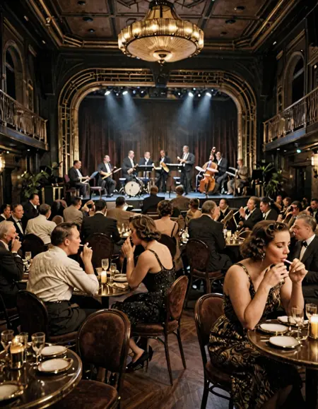 • JZZ1, 1940年代のジャズクラブ、テーブルと椅子が並ぶ広い部屋、人々で賑わい、背景にジャズバンドが演奏するステージ、いくつかの人がタバコを吸っている。雰囲気は暗く、ステージの照明で照らされている。美しいアールデコスタイル。正面からの視点。シネマティックなレンダリング。