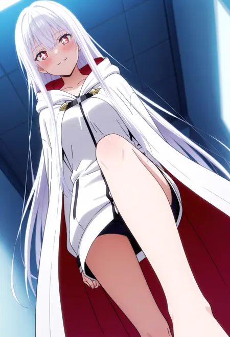 フード、鎖骨、長い袖、マント、フードを下ろした状態、素足、フーディー、ドレス、フード付きマント、白いフーディー、素足、コート、ローブ、