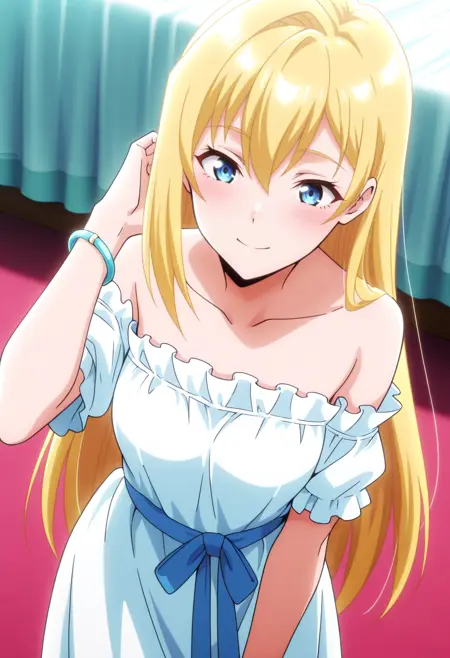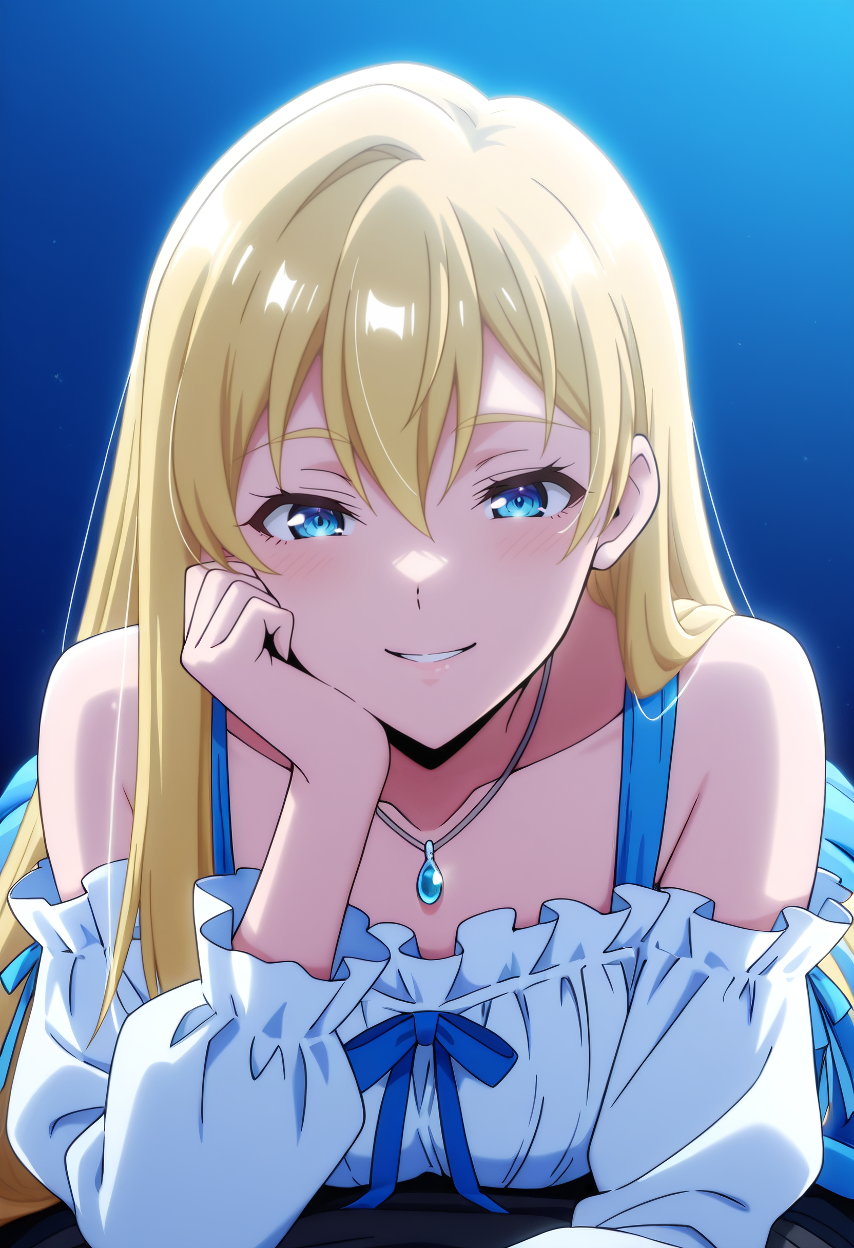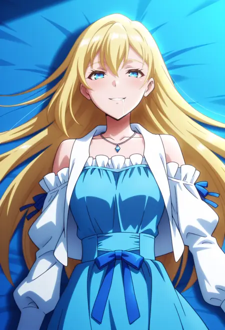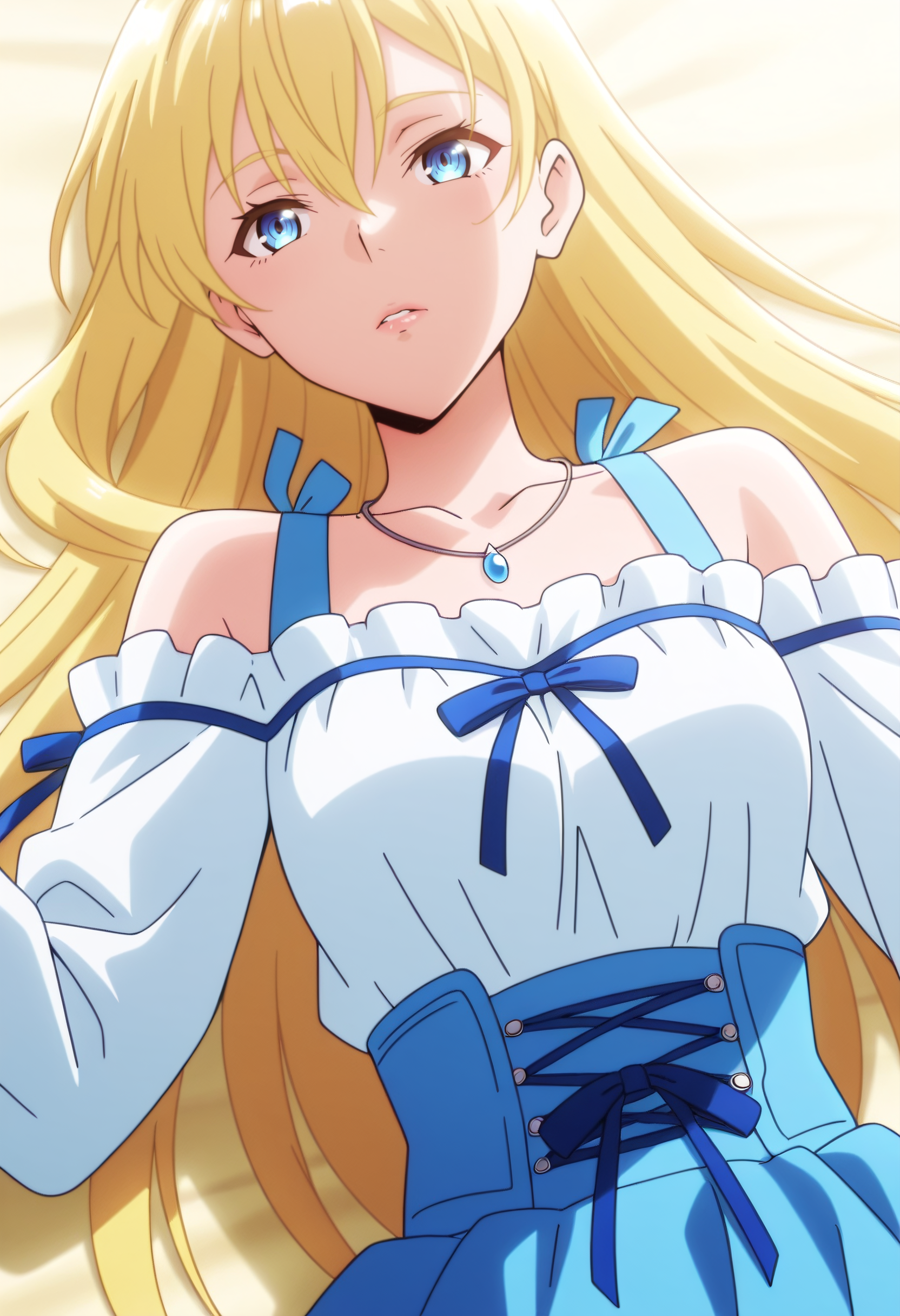 RoxyBlueDress, 드레스, 긴 소매, 잠금뼈, 어깨 노출, 소매 없음, 파란 드레스, 파란 리본, 파란 활, 재킷, 보석, 목걸이, 프릴, 캐주얼, 리본, 풍선 소매, 파란 치마, 흰 재킷,