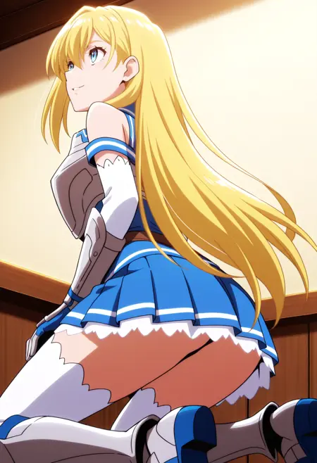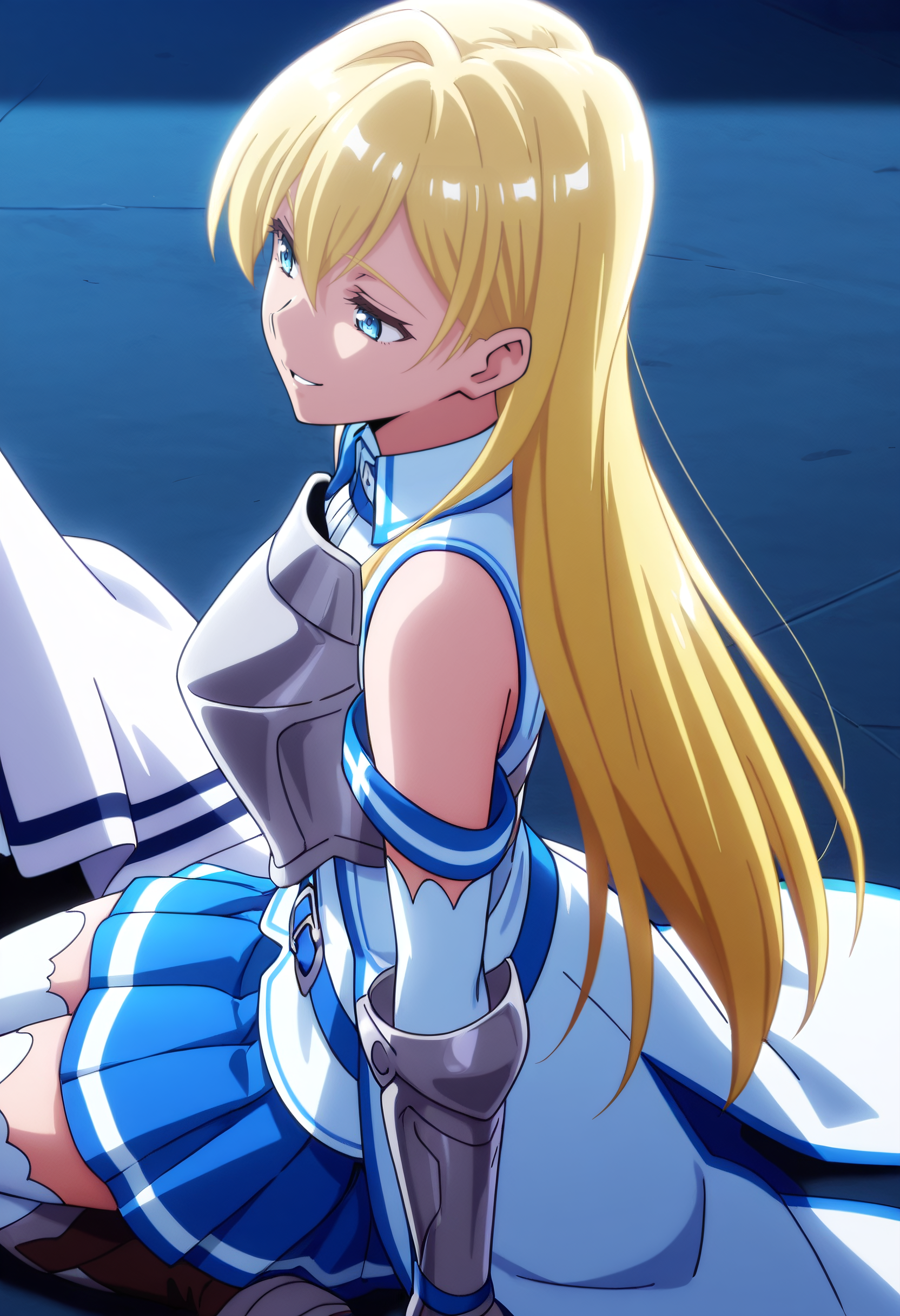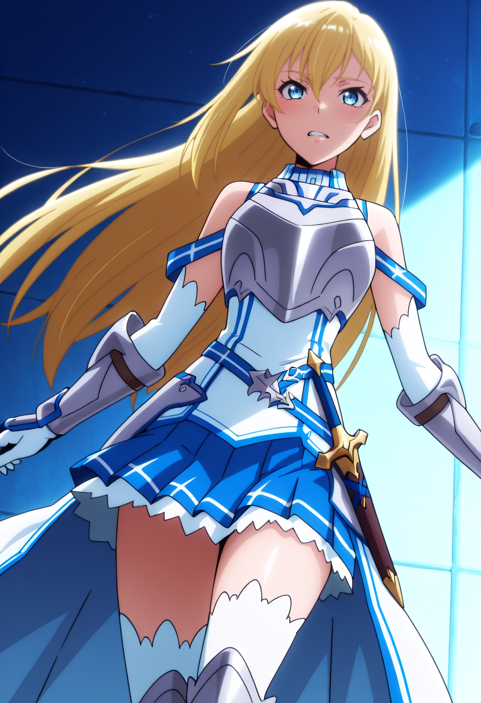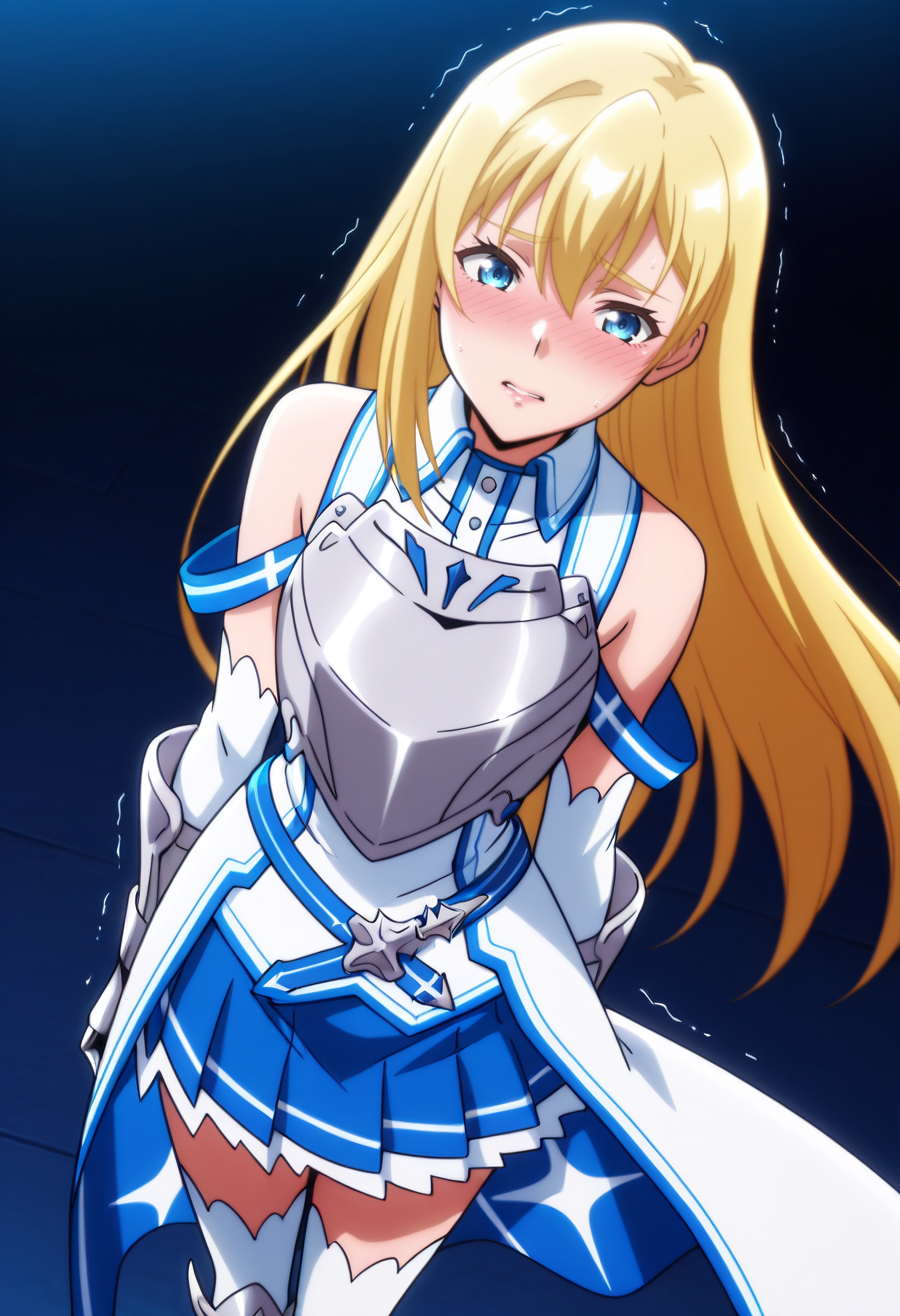 RoxyArmor, 갑옷, 장갑, 팔꿈치 장갑, 어깨 노출, 치마, 분리된 소매, 흰 장갑, 허벅지 긴 양말, 가슴판, 셔츠, 드레스, 장갑, 갑옷 드레스, 소매 없음, 파란 치마, 흰 다리 착용, 주름 치마, 부츠, 하이레그, 갑옷 부츠,